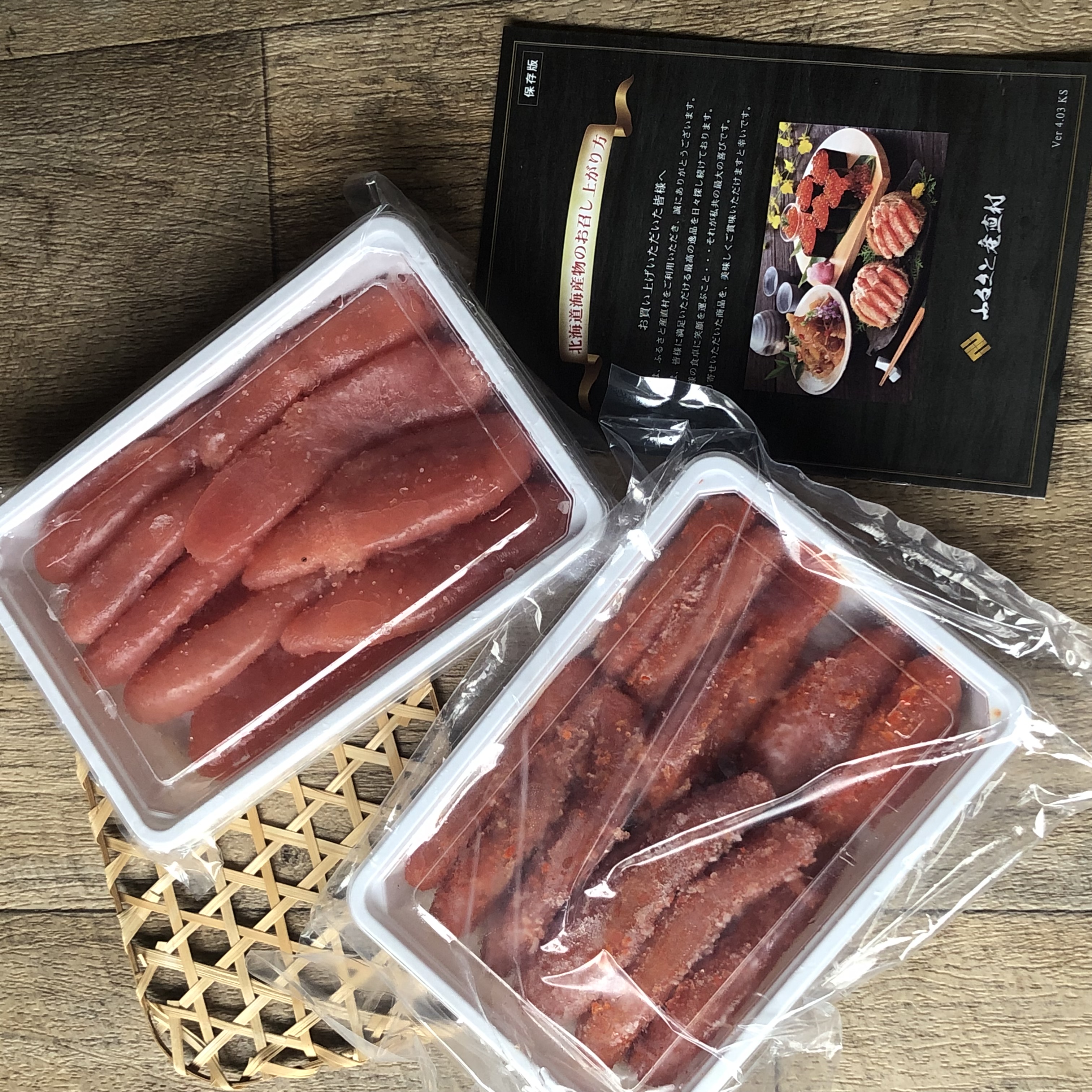 ○熟成辛子明太子…塩たらこ同様新鮮でぷちぷちとした食感。辛すぎず、旨みを感じる程よい辛さの調味液に浸かった明太子です。普段のスーパーでは見掛けない大きさでとにかく立派!