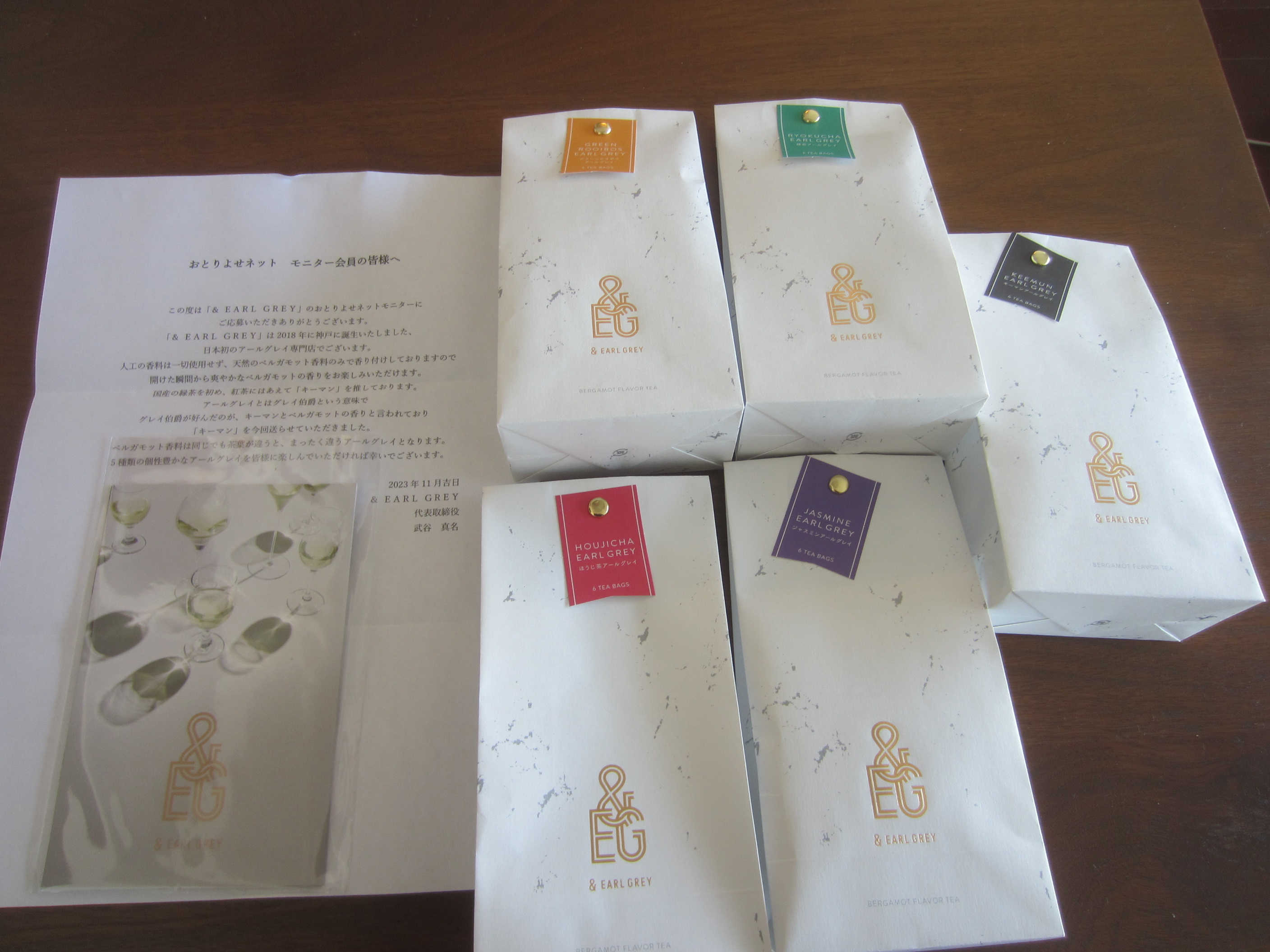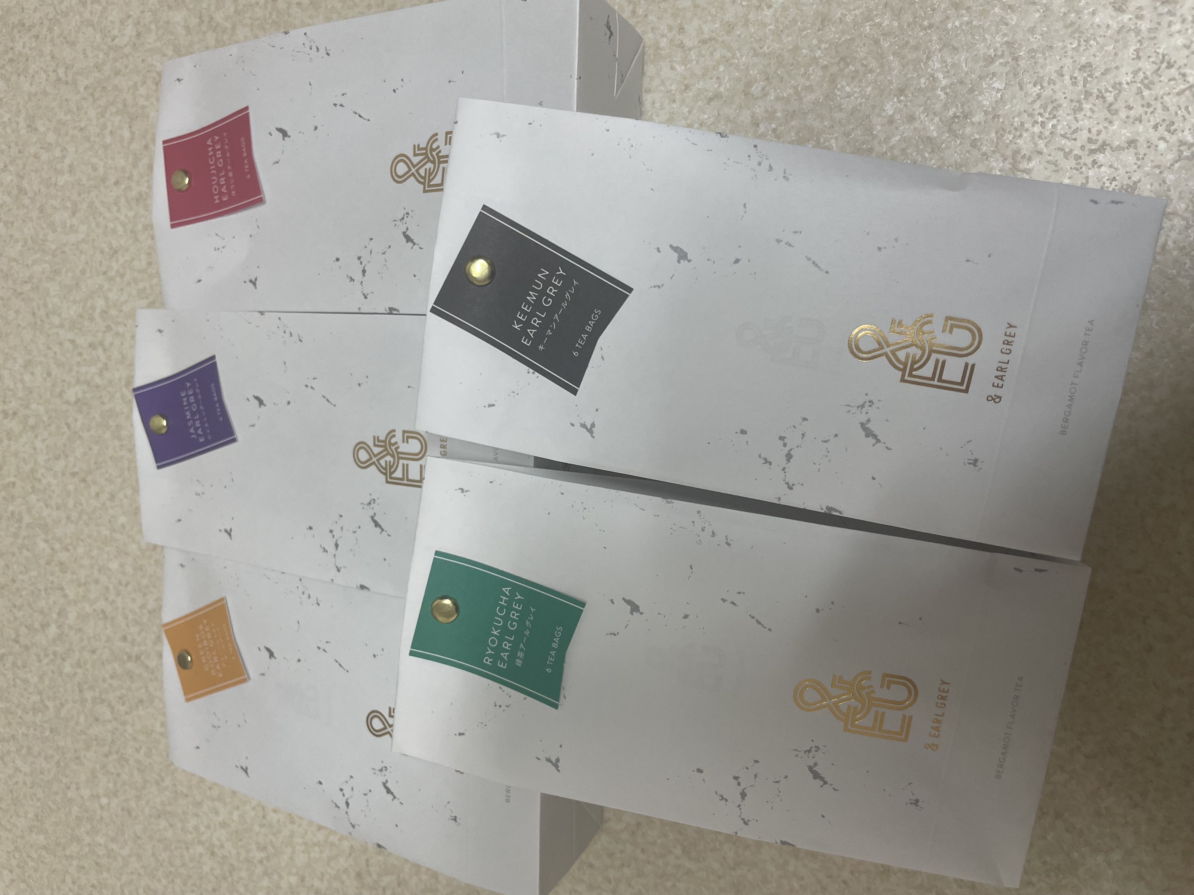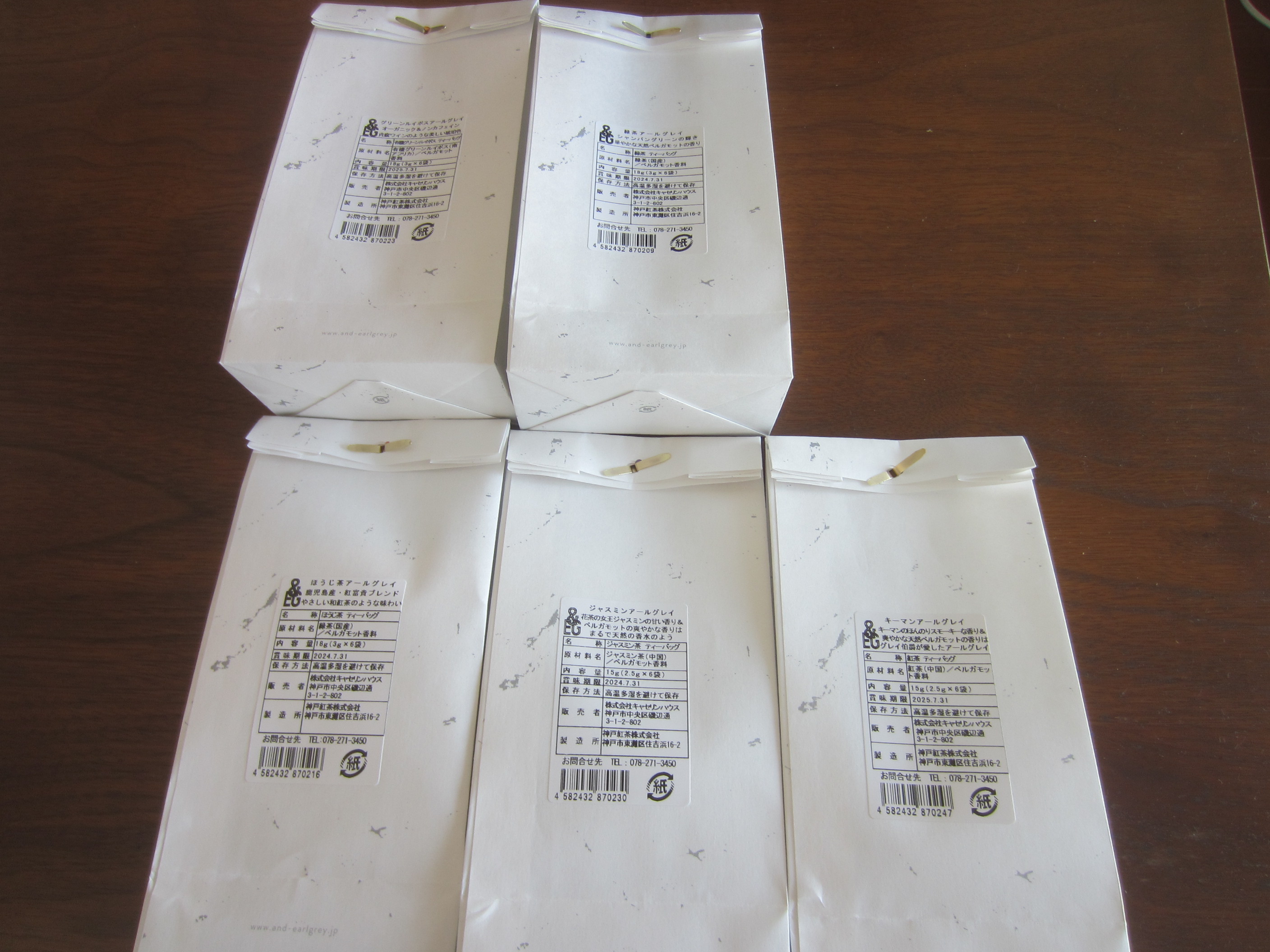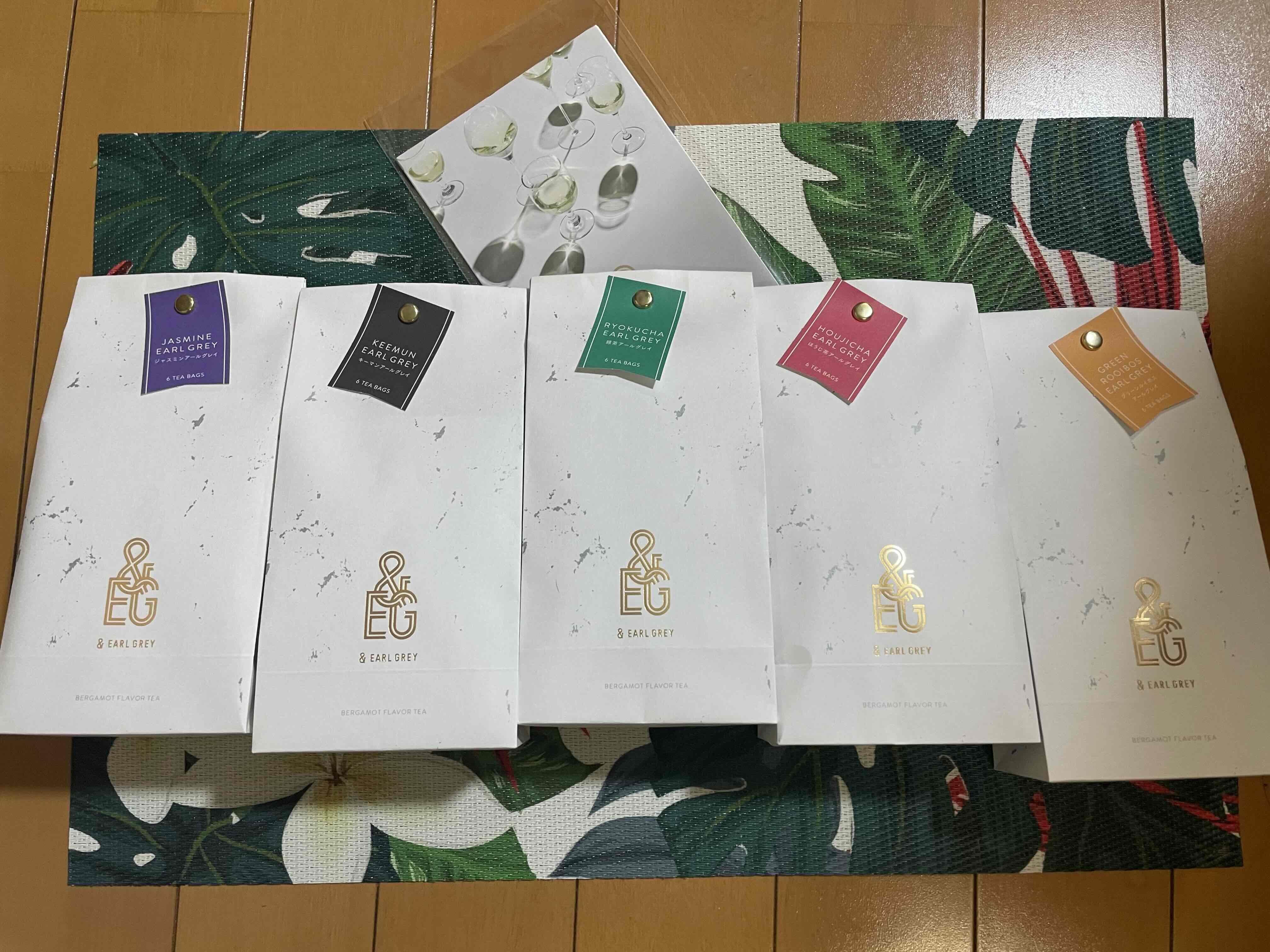 5種各1本(6ティーパック)(緑茶アールグレイ(3g)、グリーンルイボスアールグレイ(3g)、ほうじ茶アールグレイ(3g)、ジャスミンアールグレイ(2.5g)、キーマンアールグレイ(2.5g))こちらが入っています。
