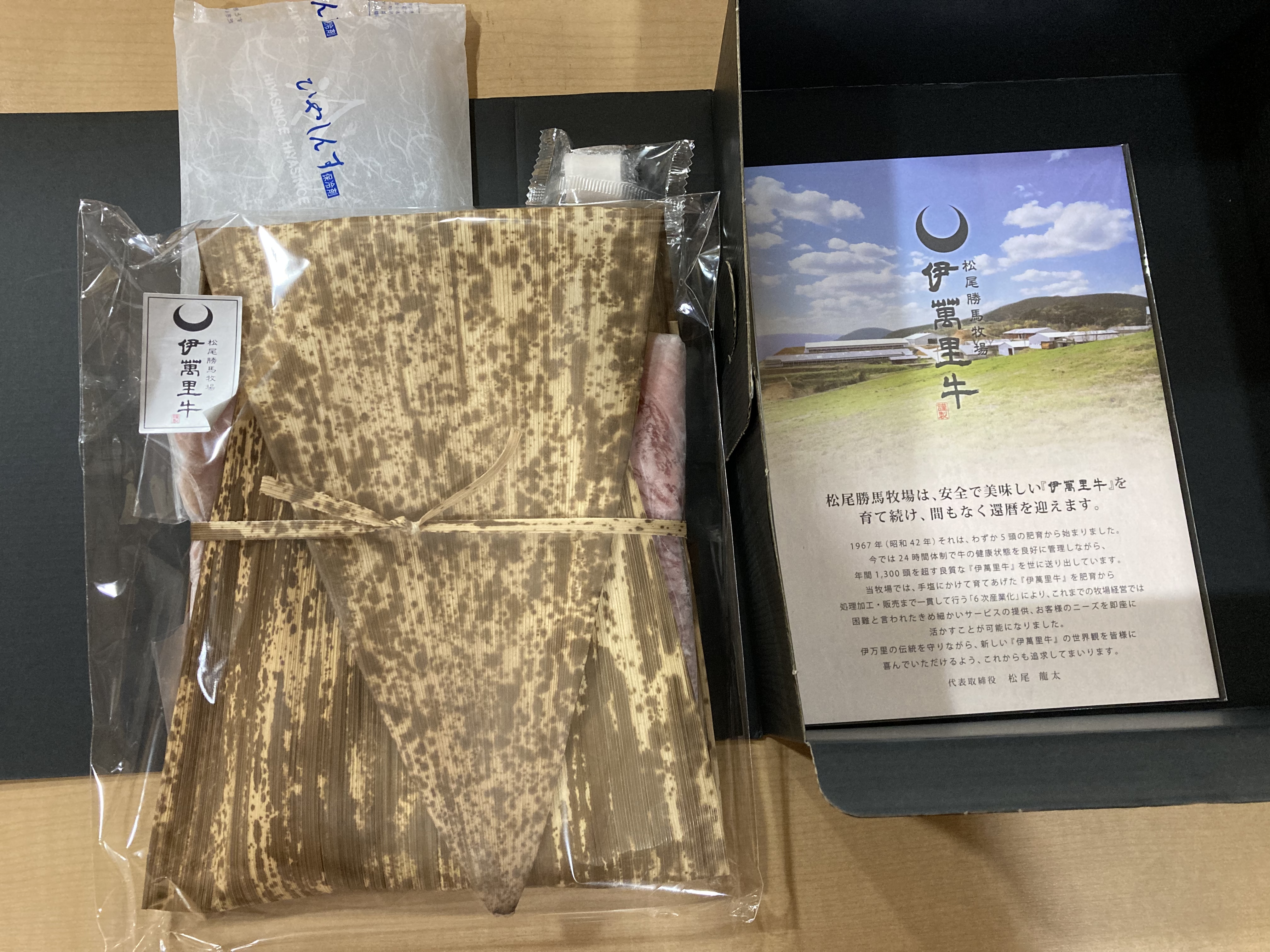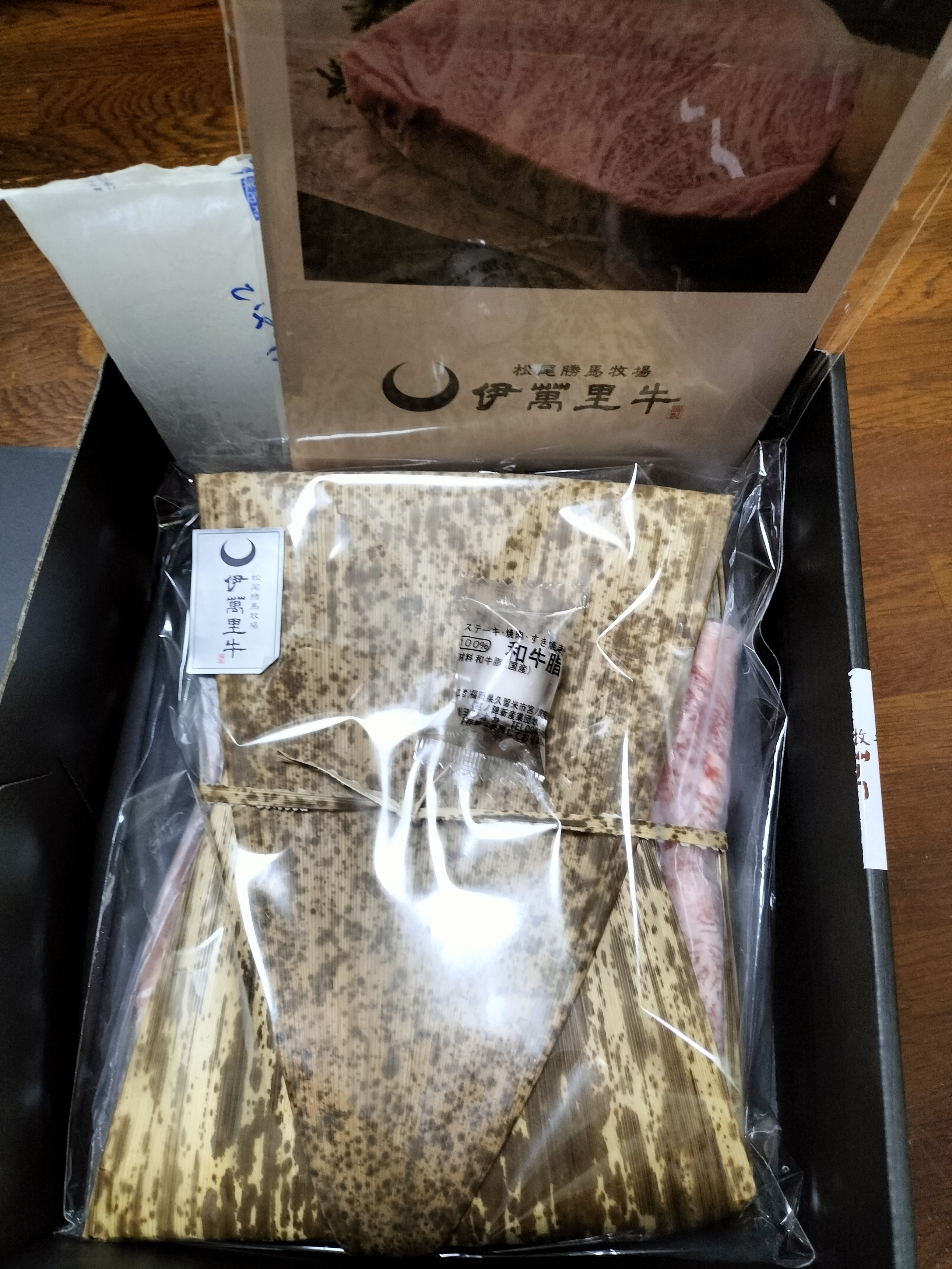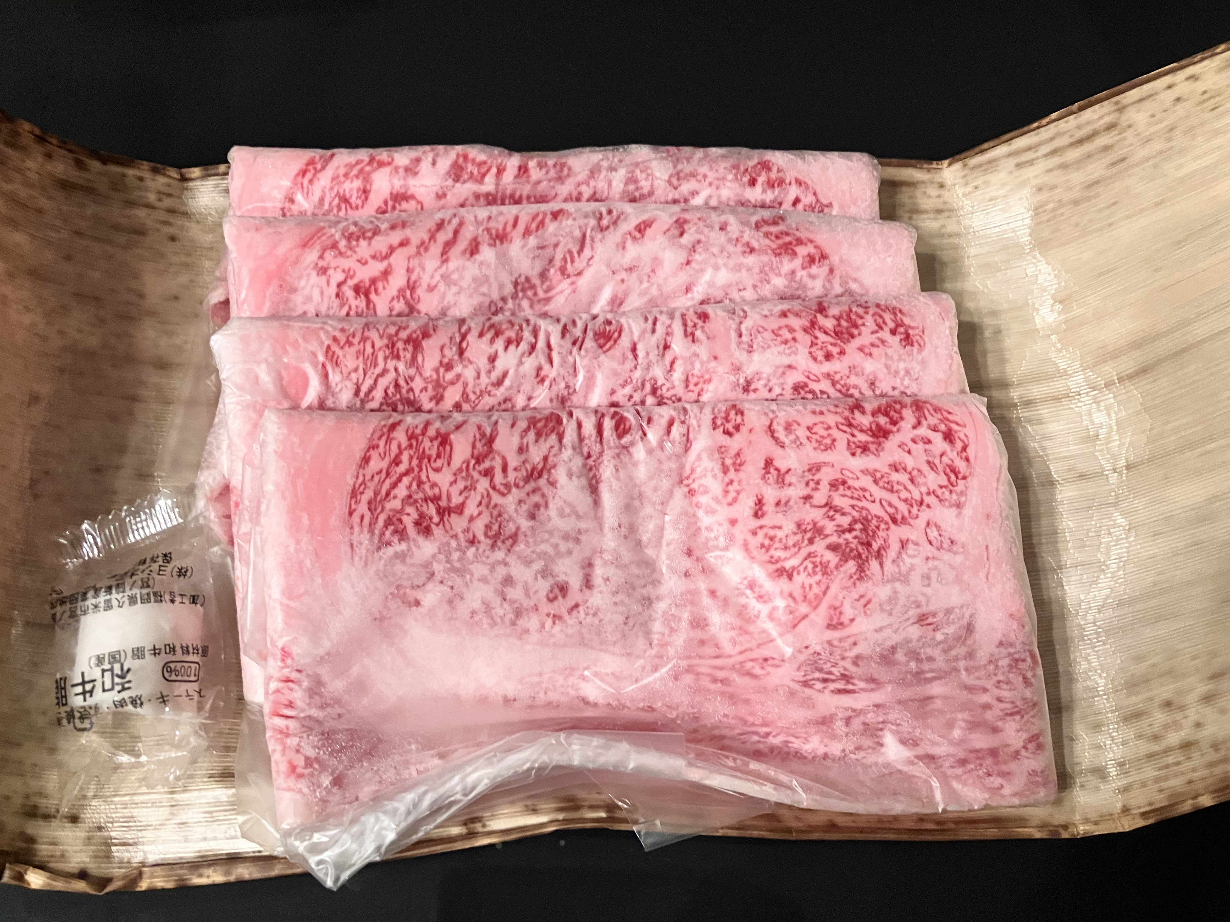 人が集まるこれからの年末年始、ご馳走の定番と言えばすき焼きですが、こちらの「伊萬里牛」は特別感がありハレの日の食卓や贈答用にもぴったりですね。黒地に金色のロゴが入った化粧箱を開けると、竹皮に包まれた高級感漂う牛肉の姿にテンションが上がります。竹皮の中には繊細なサシが入った超大判スライスの伊萬里牛が包まれ、息を飲む美しさと存在感に食べる前から期待がMAXに膨らみます。1枚ずつ個包装されているので乾燥せず、お肉がしっかり保護されていて安心感がありますね。