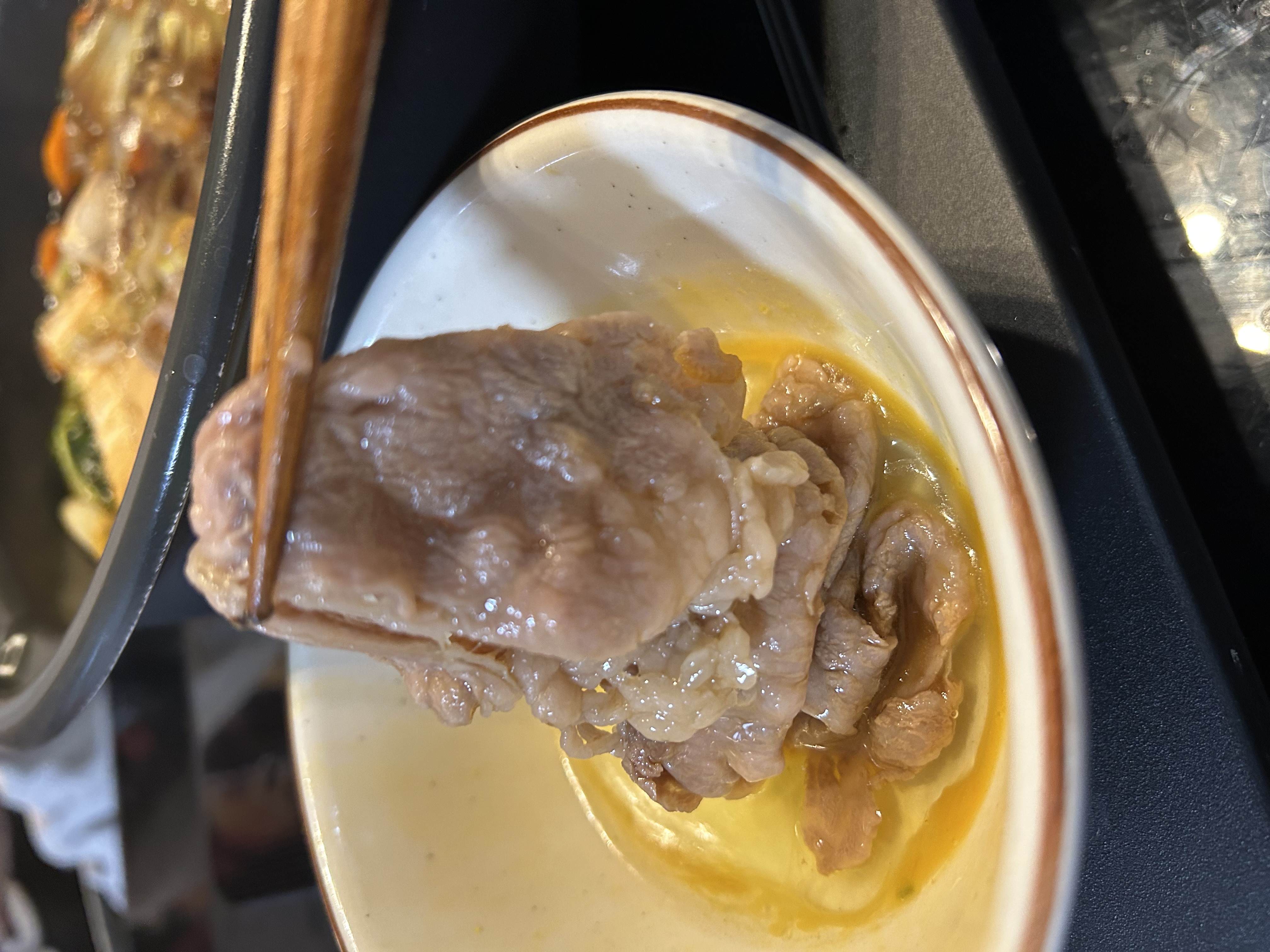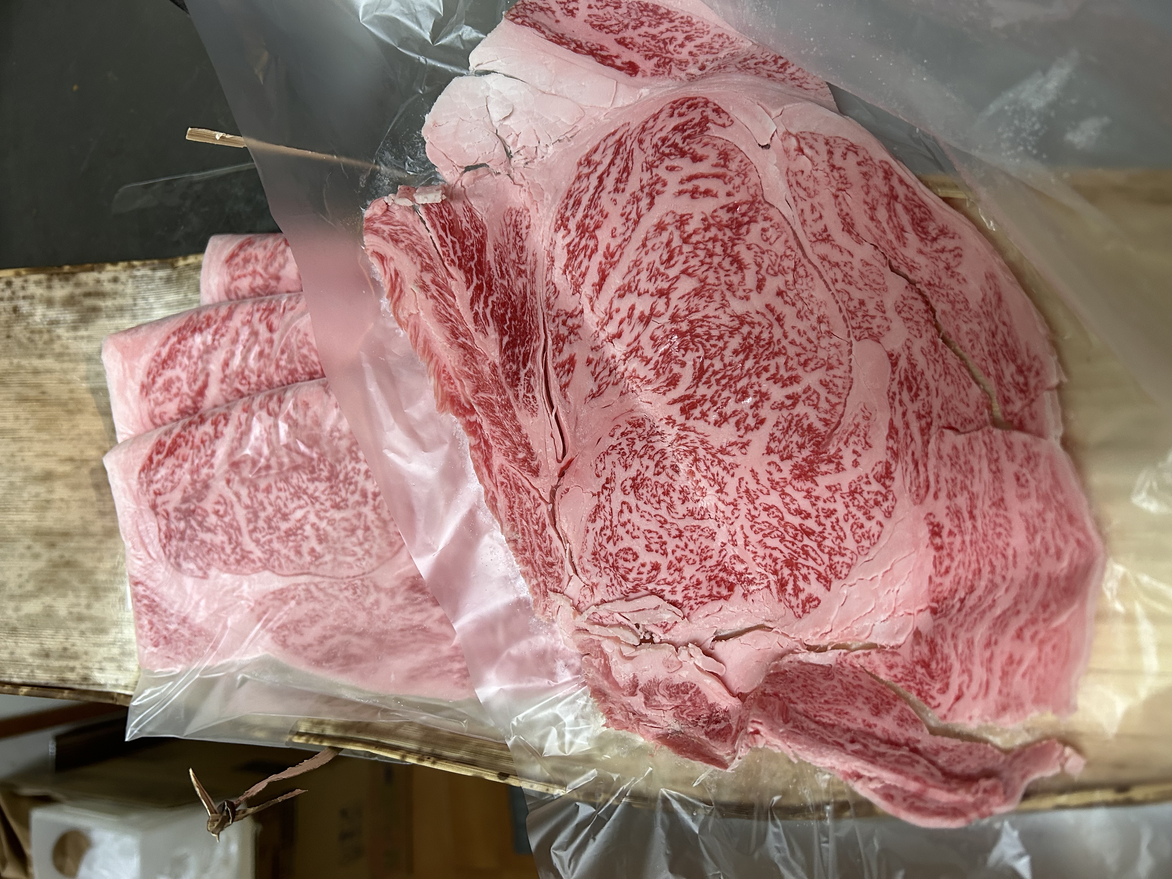 一枚一枚が大きく、ボリューム満点のスライスです。伊萬里牛の肉質は、きめ細やかで柔らかく、冷蔵庫から出すとすぐに溶け始めるほど、融点が低いのが特徴です。