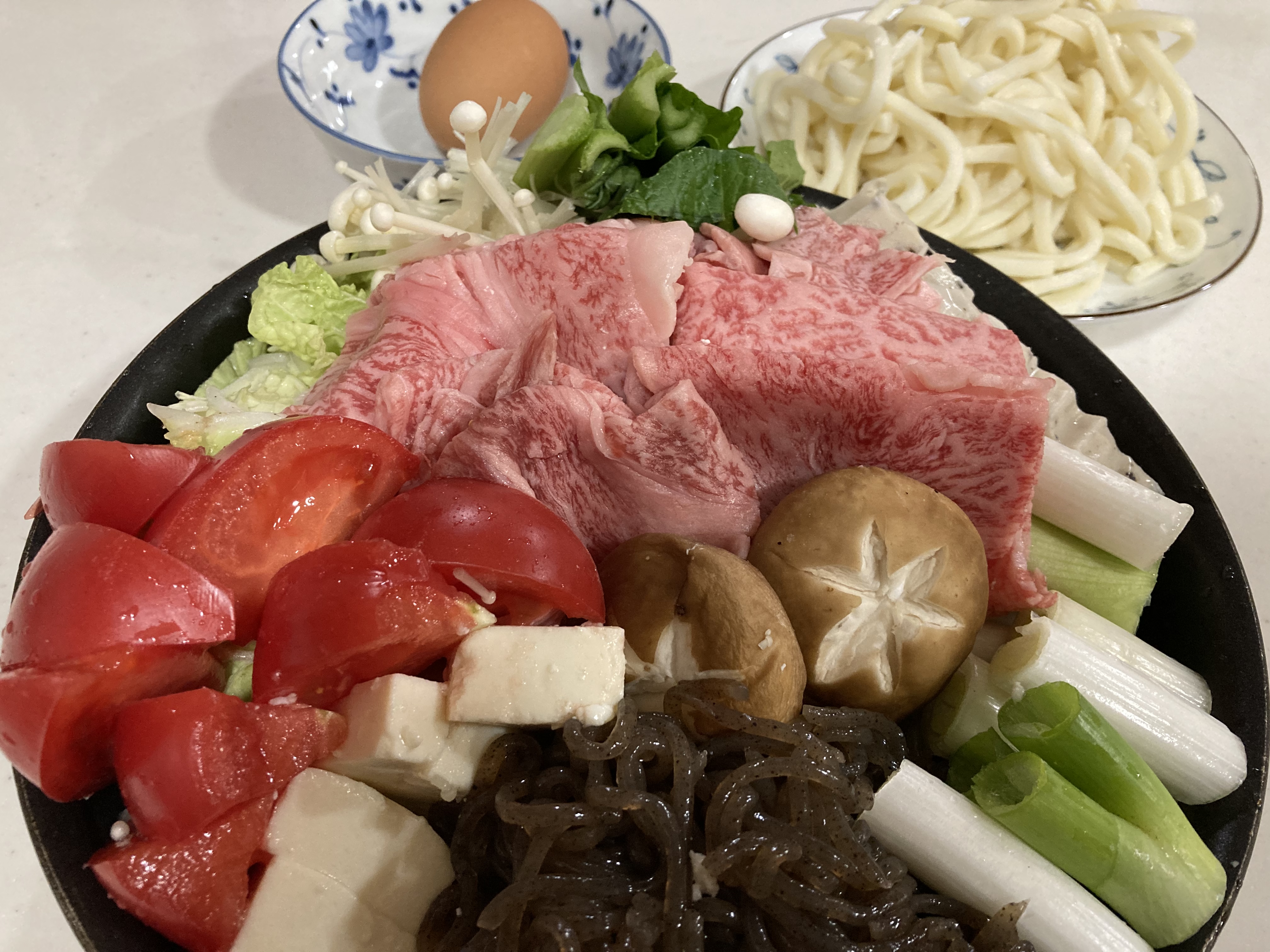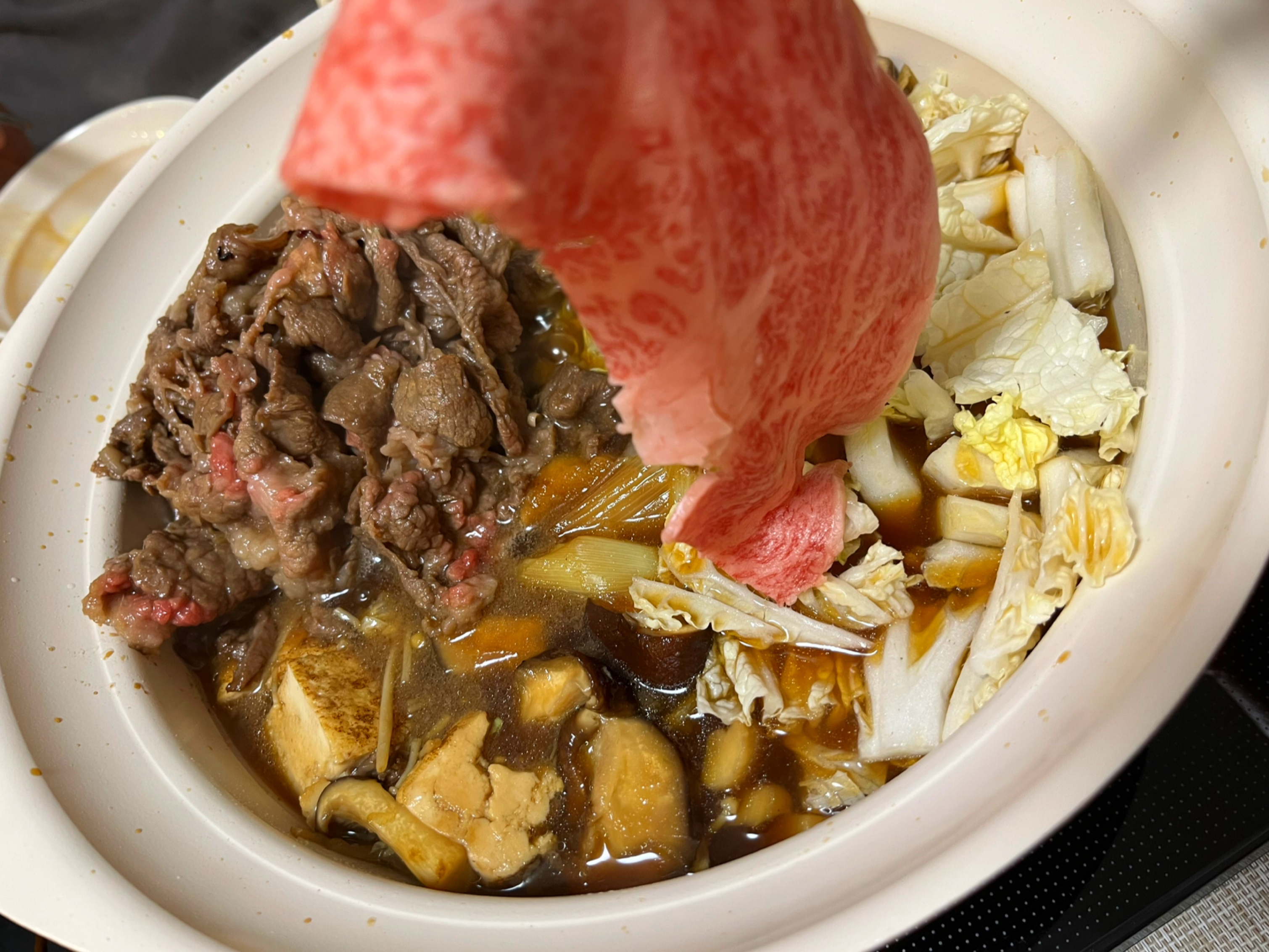 冷蔵庫で解凍し、同梱の牛脂をすき焼き鍋に敷き調理開始です。調理中のお肉の甘く芳醇な香りにうっとり…ぐつぐつ煮えていくすき焼き鍋を家族団欒で囲む幸せを噛み締め、今年1年頑張ったご褒美に最高だなと感じました。熱々のお肉を頬張ると、口に入れた瞬間にまろやかなコクと甘みが口いっぱいに広がり、あっという間にとろけてなくなってしまうので大変食べやすいお肉です。きめ細かな霜降りと赤身のバランスがとれた美しい見た目通り、赤身の旨味の中に脂のコクと甘みが楽しめる風味豊かな味わいで、脂の融点が低いためかとてもさらっとしておりしつこくなく、濃厚なのにあっさりとした後味です。柔らかいお肉のことを「とろけるよう」と表現しますが、ここまでリアルにとろけるお肉は初めてで、他のお肉では経験したことのないすーっとほどけて消えてなくなってしまうような食感です。舌の上に広がる肉本来のおいしさを堪能できる贅沢なすき焼きが楽しめ、「伊萬里牛」をまだ食べたことがない方や本物志向の方にもぜひお勧めしたいです。肉質が柔らかく雑味やクセもないので、お子さんや年配の方にも食べやすく、ホームパーティーなどでも幅広い年代でおいしさを共有できると思います。甘い割下で煮たお肉を溶き卵にくぐらせて食べると、お口の中で肉の甘みとまろやかな卵が融合し、肉の旨味を吸った焼き豆腐や野菜、うどんも絶品でした。本当においしいお肉を探し求めている方にも自信を持ってお勧めしたくなる確かな逸品で、「伊萬里牛」は今後ますます有名になっていく実力派のお肉だと感じました!