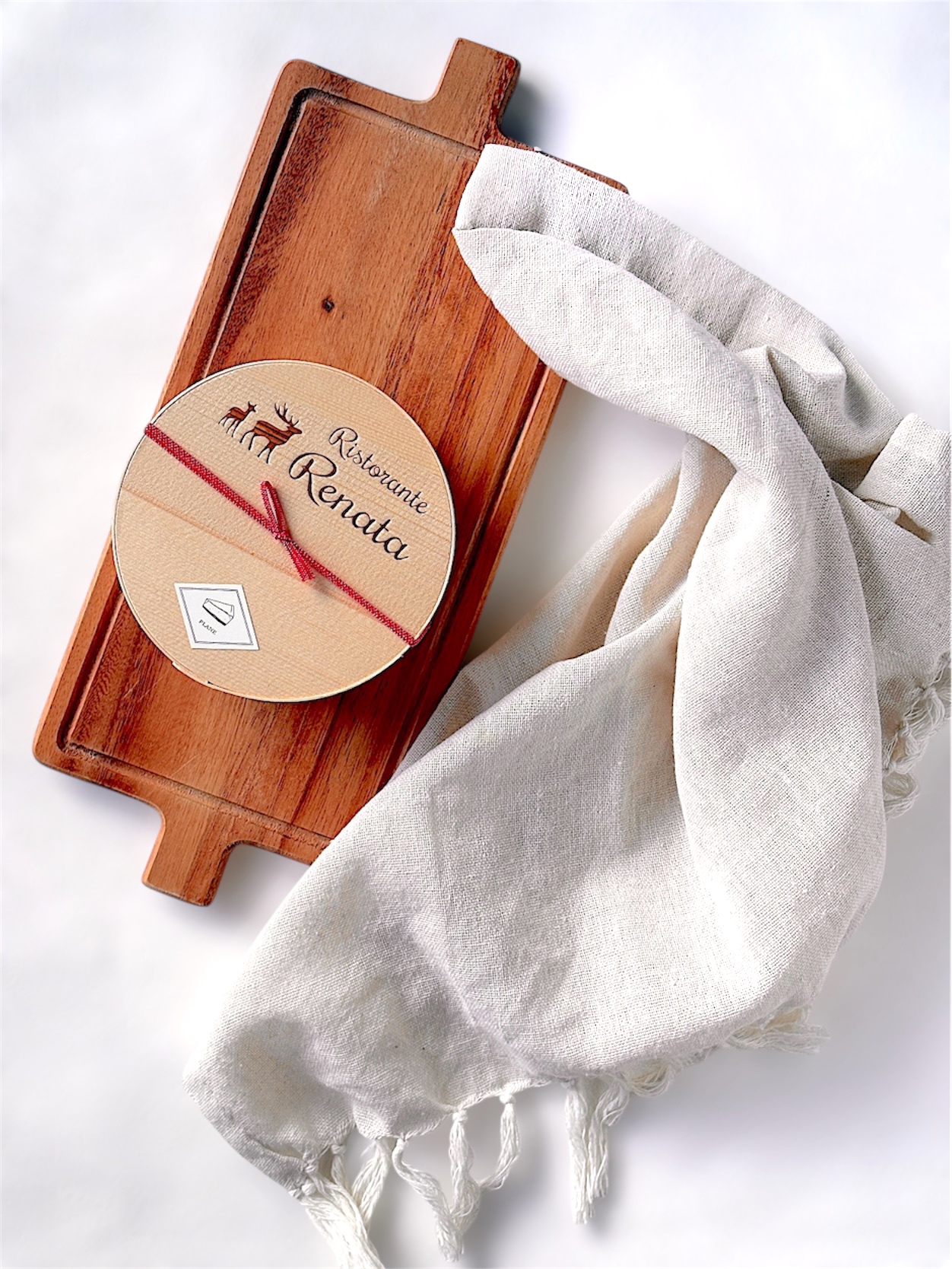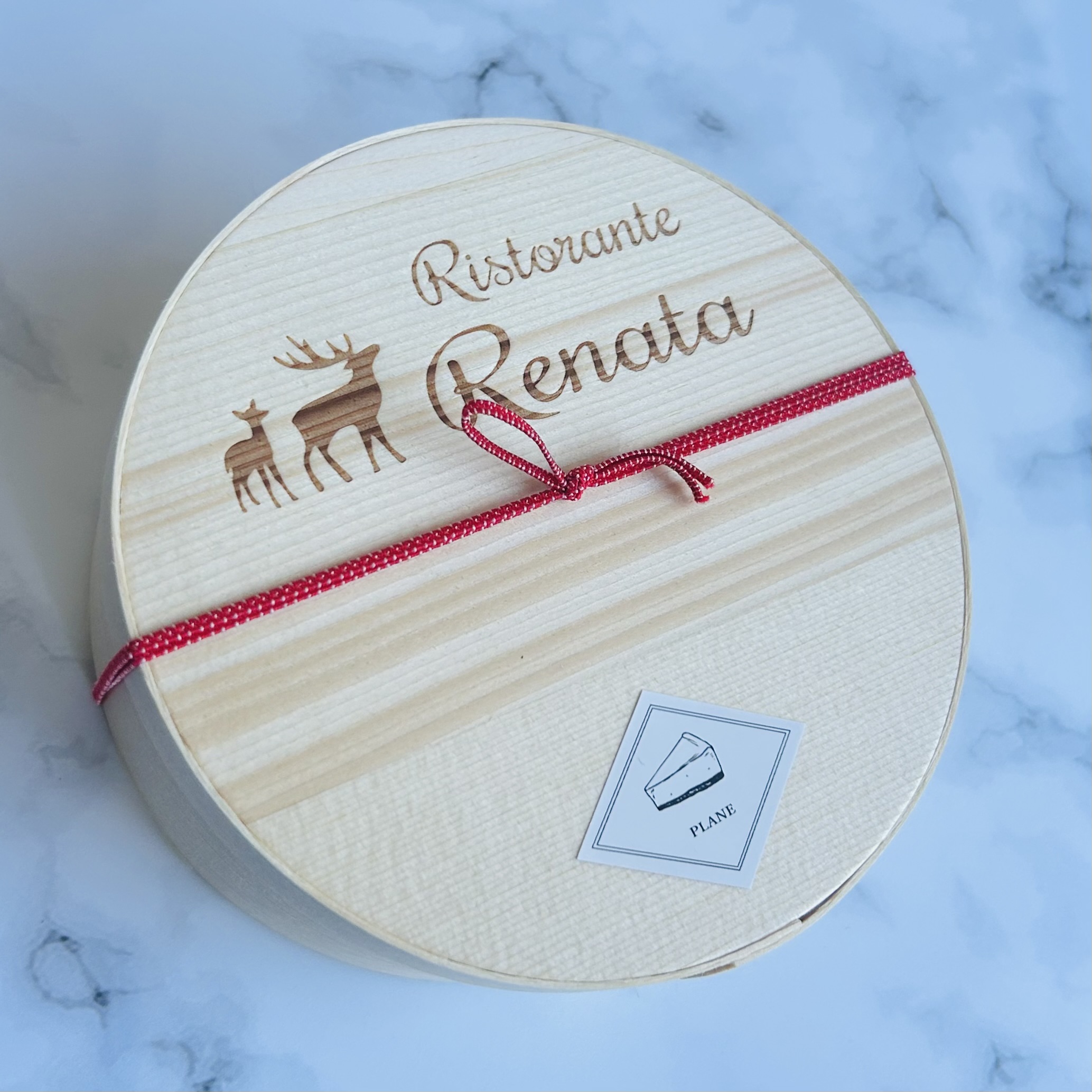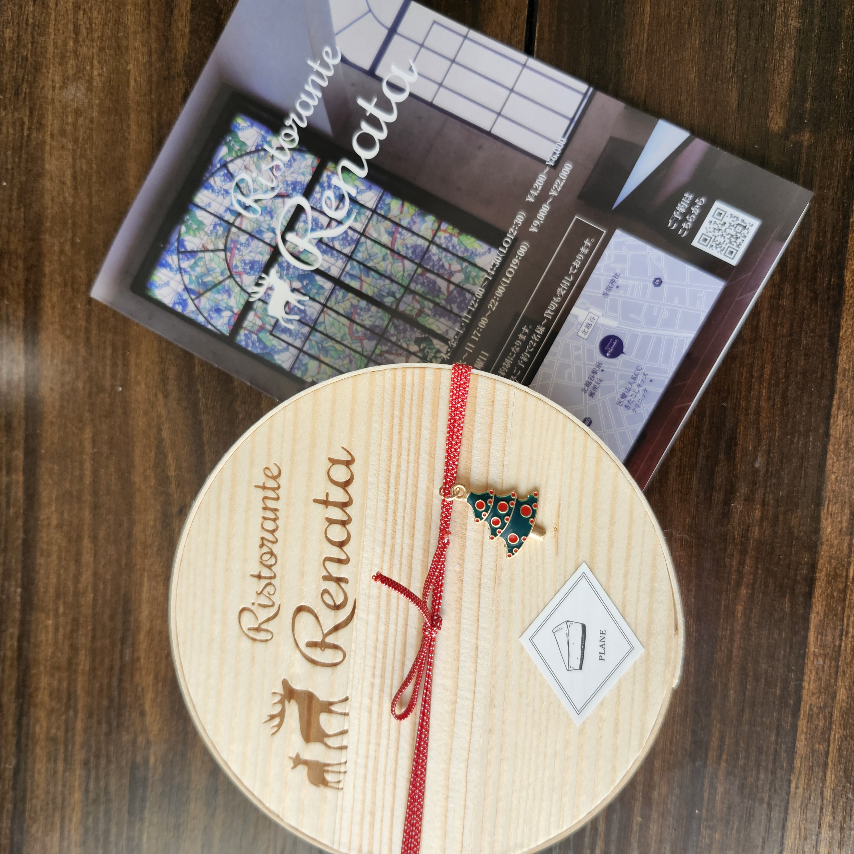 当店のロゴを焼き印で施した4号サイズ(12cm)のワッパに平織リボンをかけてお送りいたします。
