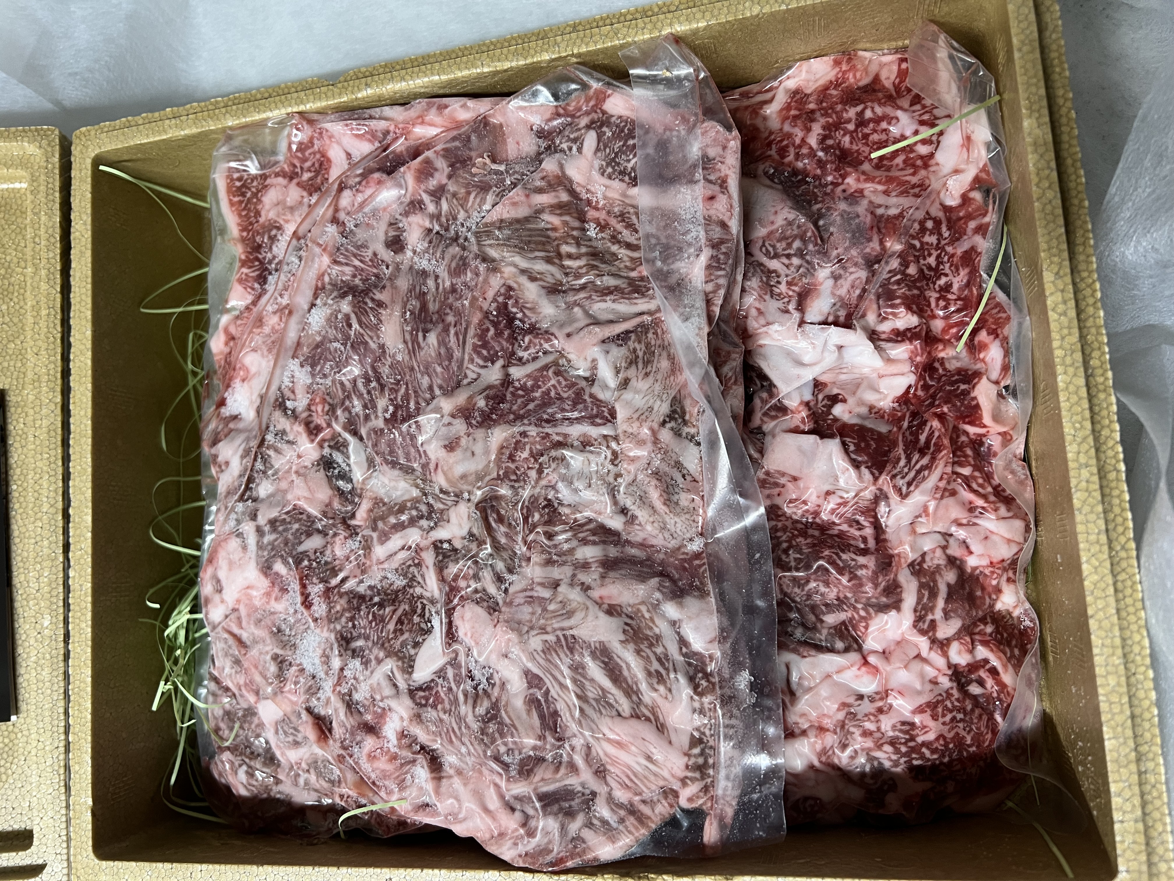 冷凍されていた際には全体が白っぽく見えていたお肉も、解凍されるにつれて赤味に贅沢にサシが入っている様子がハッキリと見えてきました。