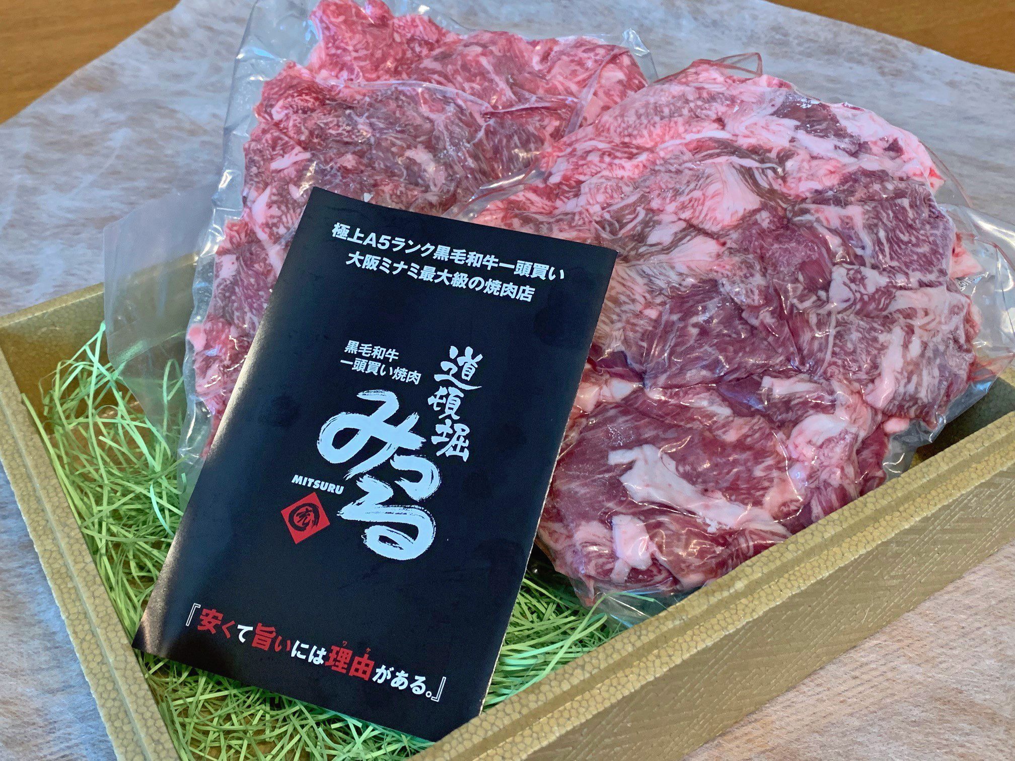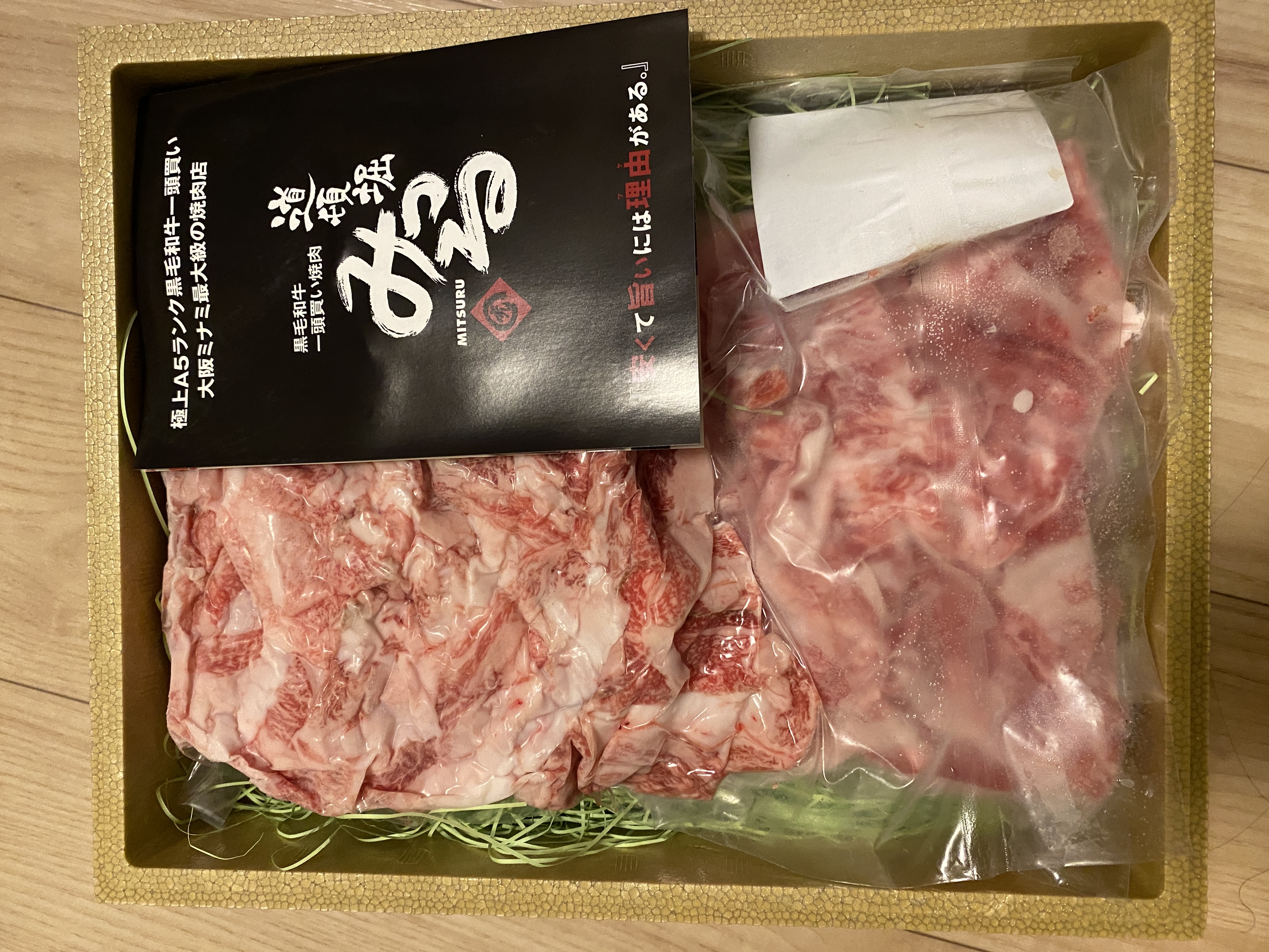 開いてみるとお店の紹介リーフレットと、500gに分けられた二袋のお肉が緩衝材のクッションに堂々並んでいました。