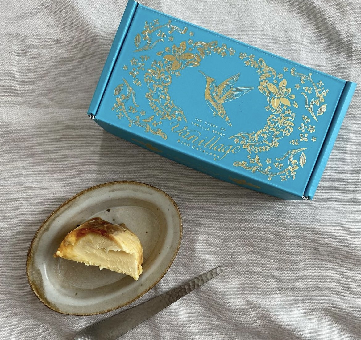 北海道産の純生クリームとミルクを使用した、口どけのなめらかな「カタラーナ」です。温度に気を付けながらブルボンバニラのバニラビーンズを煮出して香り付けし、北海道産純生クリームは乳脂42%と35%をブレンド。濃厚さも感じさせながら食べた後の余韻が重くなりすぎないようにしています。ひとつひとつ丁寧に手作りしています。金で描かれたイラストが印象的なボックスに入って届くので、手土産スイーツにもおすすめです。