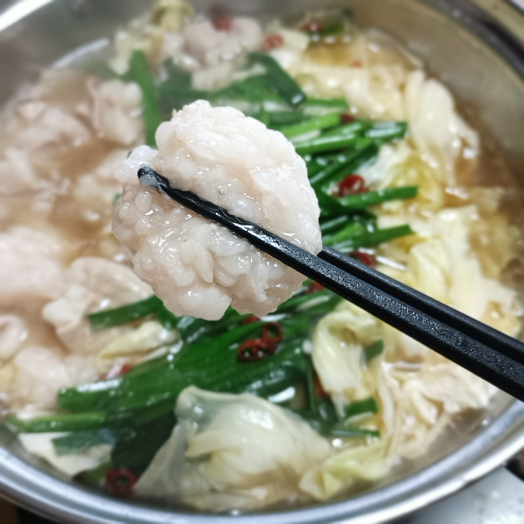 特製スープは、伊万里産の牛骨エキスが入っていて、佐賀・国産黒毛和牛伊萬里牛(伊万里牛)の小腸との相性もバツグンです。あっさりとした醤油スープが、もつの旨味を引き立てます。ちゃんぽん麺もセットになっていますので、シメまでお楽しみ頂けます。