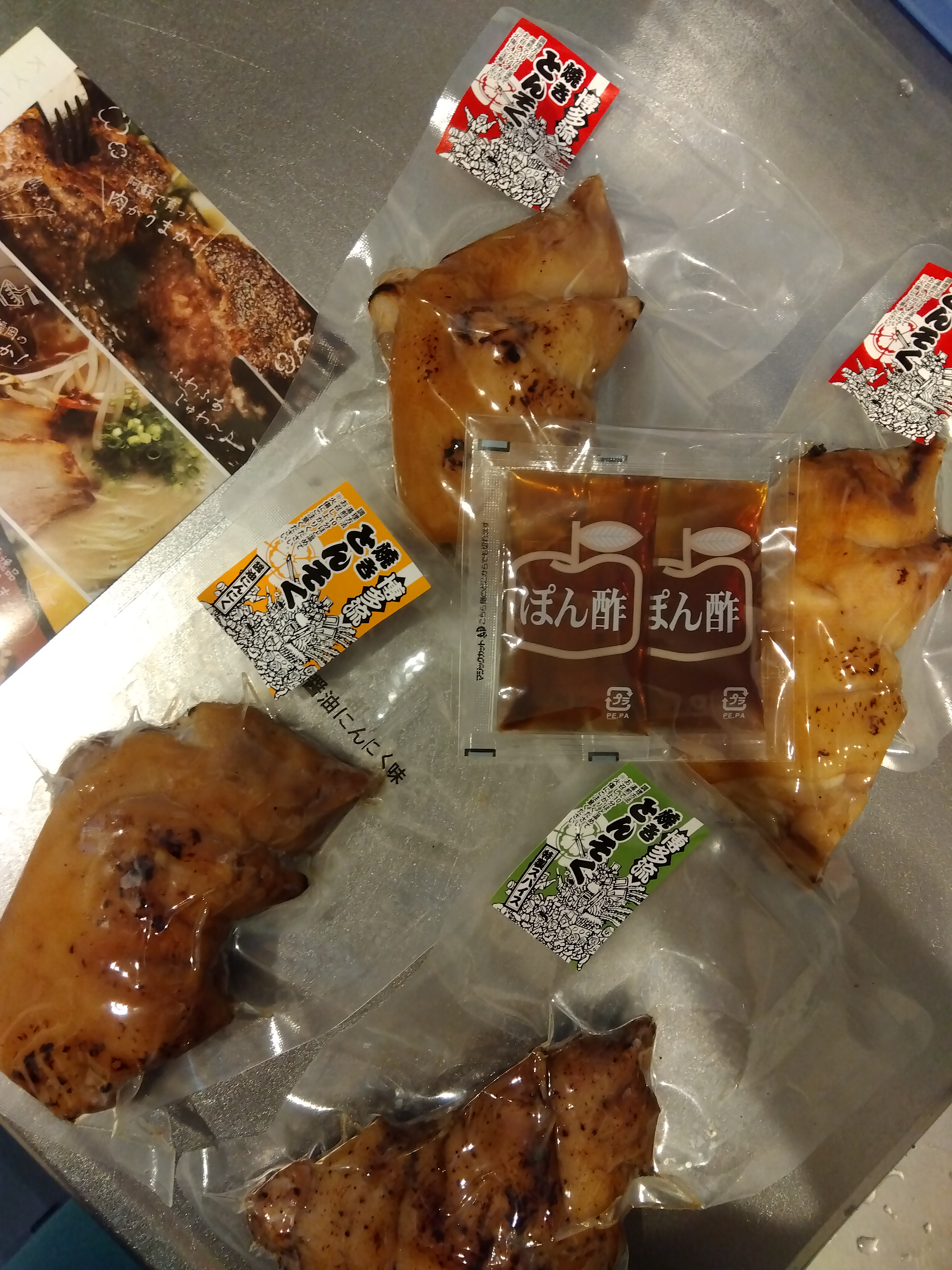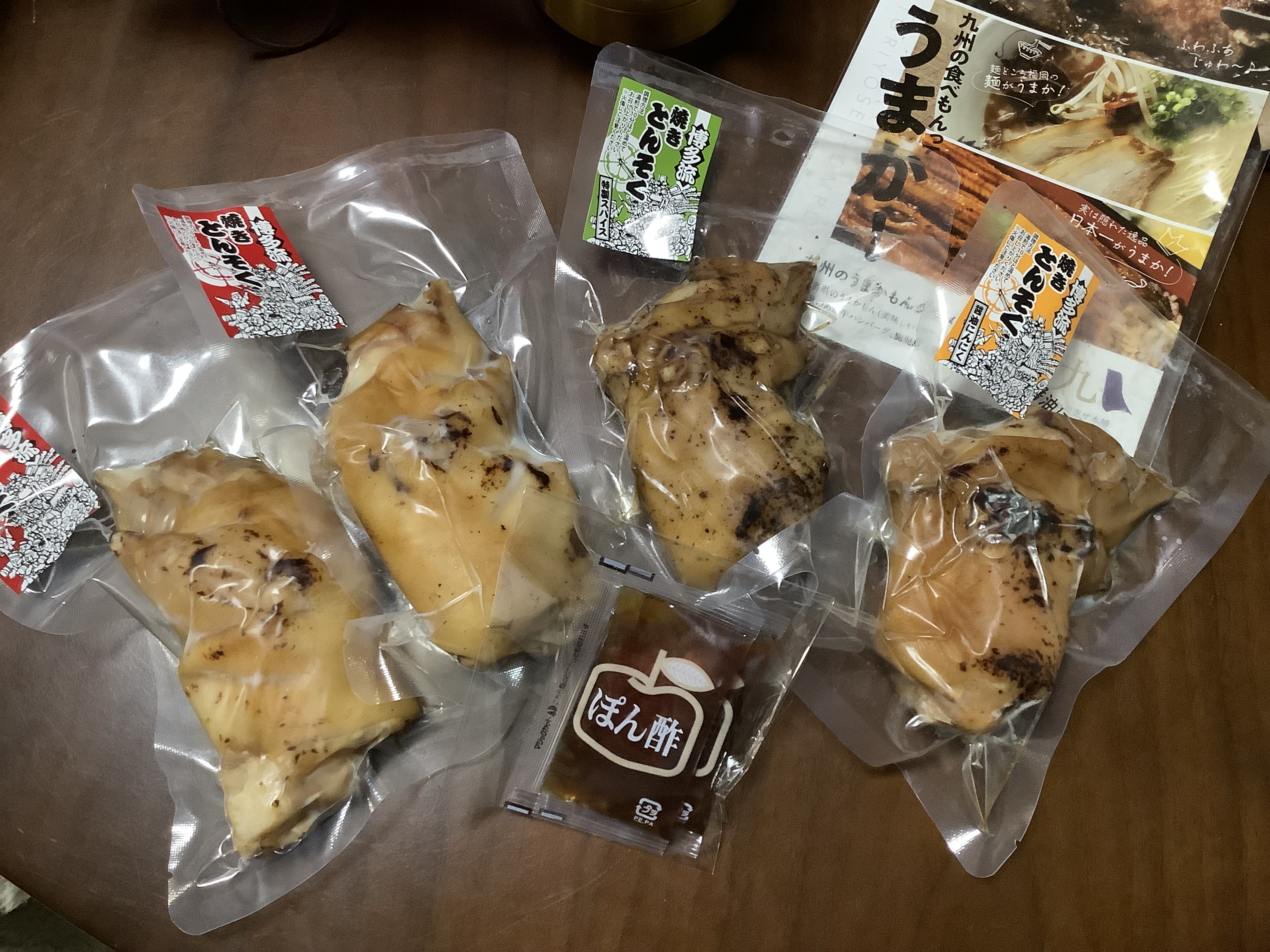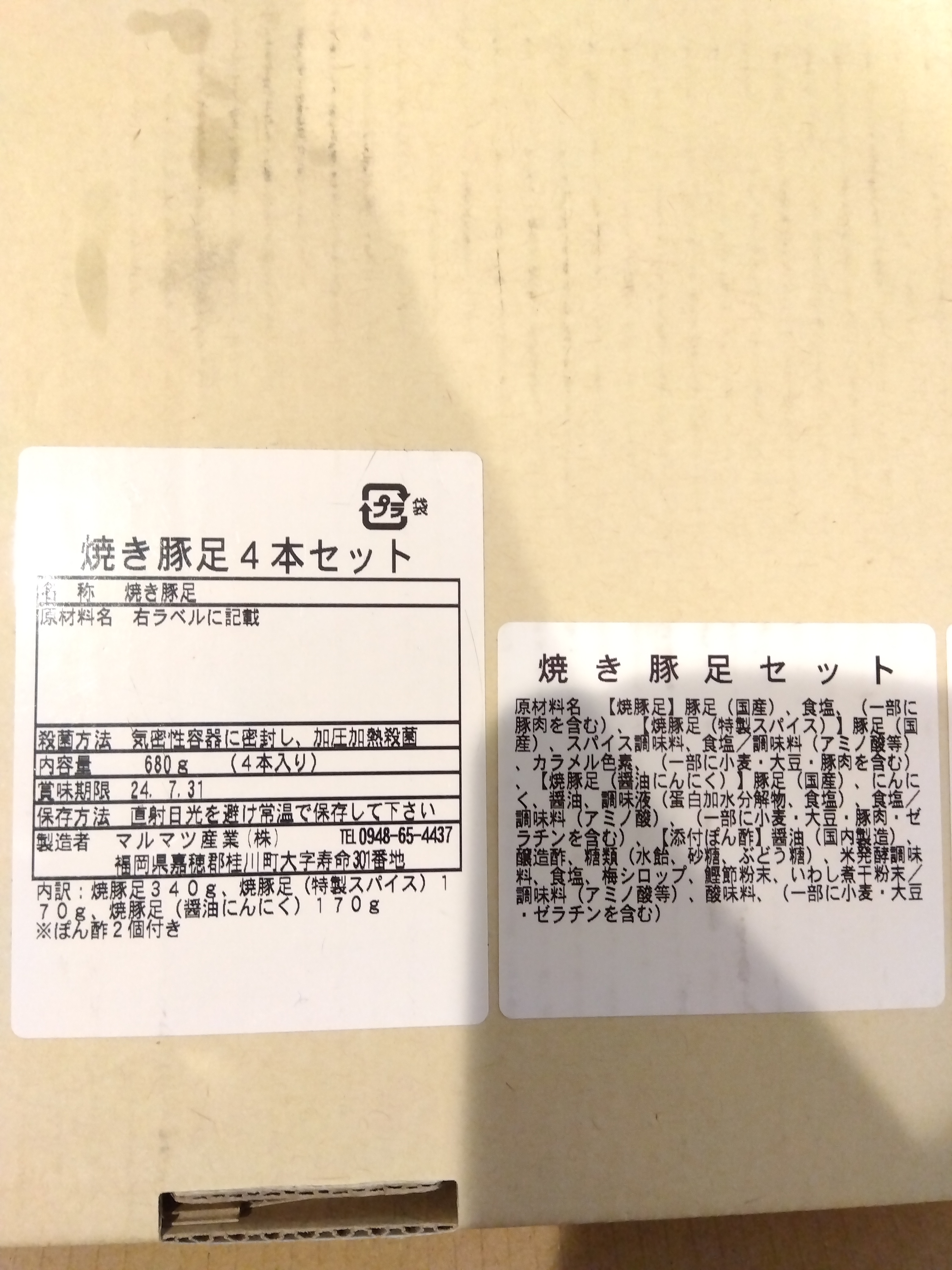 中身は、3種で各170g(焼き豚足 プレーン味×2、焼き豚足 にんにく醤油味×1、焼き豚足 特製スパイス味×1)、ポン酢(15g)