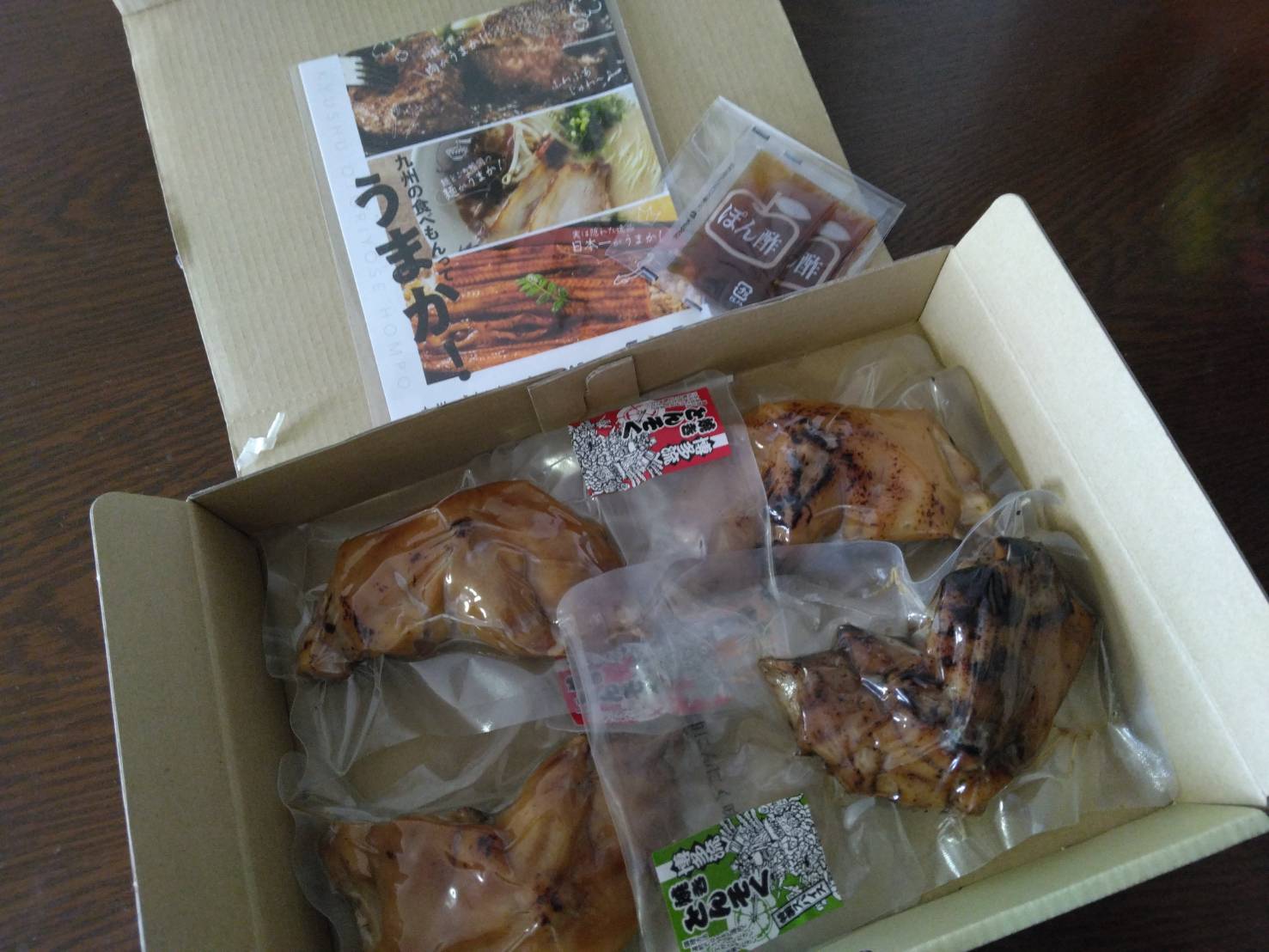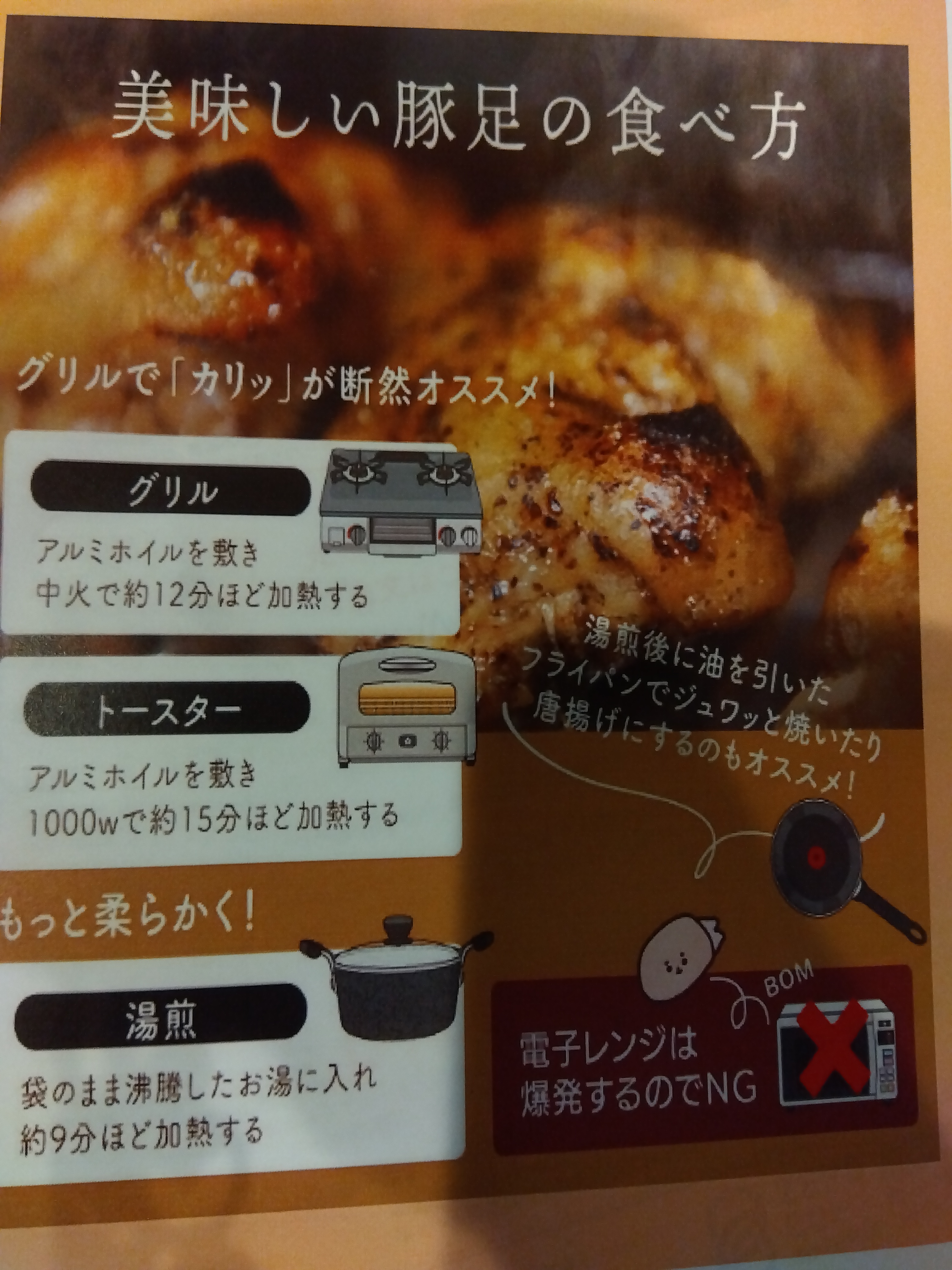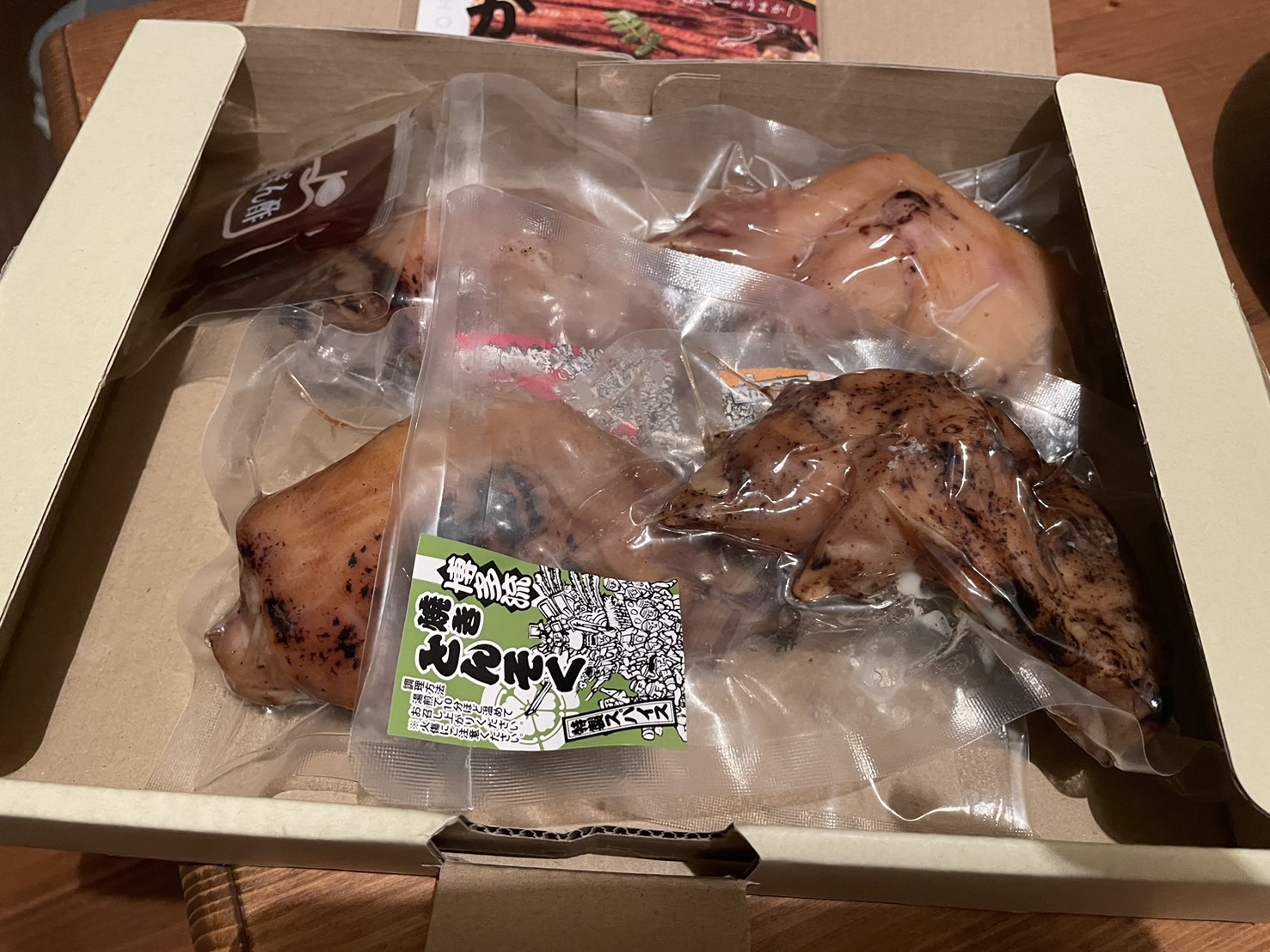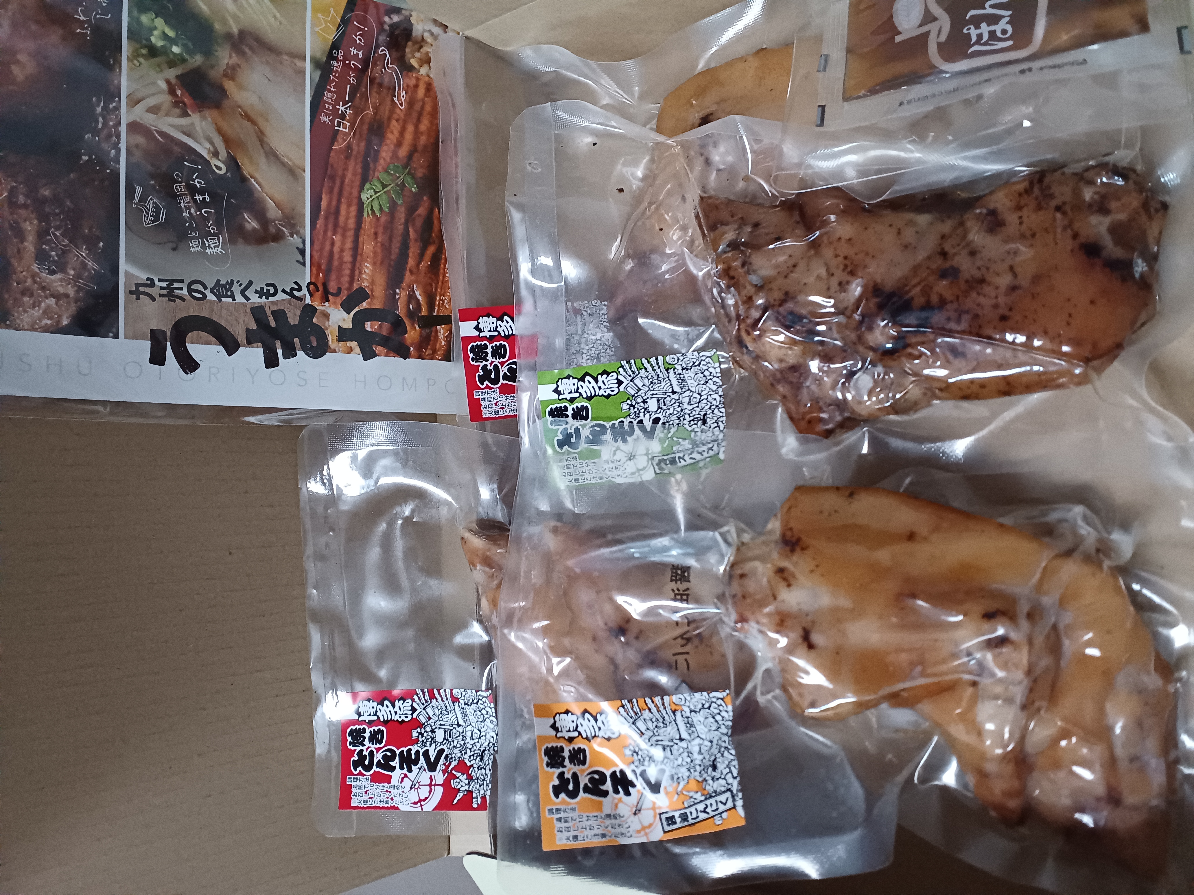 中身は、3種で各170g(焼き豚足 プレーン味×2、焼き豚足 にんにく醤油味×1、焼き豚足 特製スパイス味×1)、ポン酢(15g)