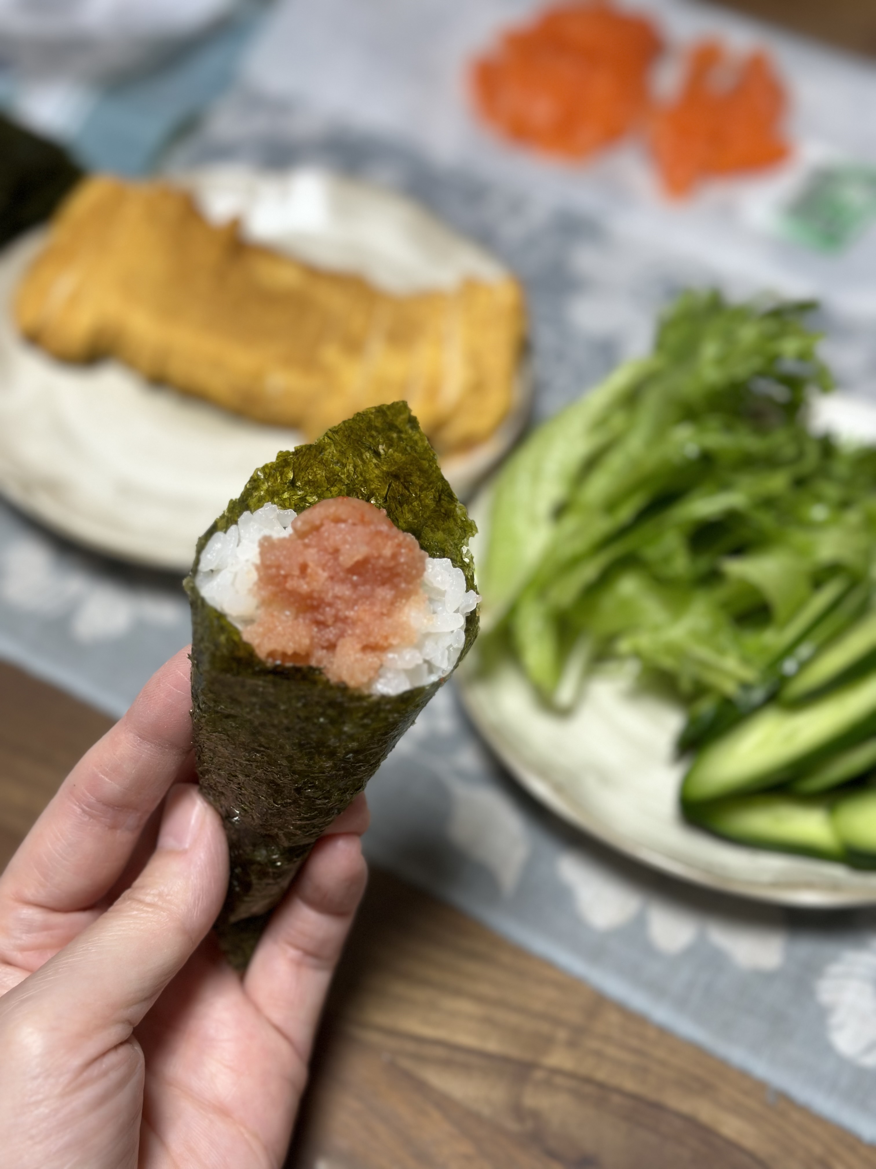 熱々ご飯にたっぷり乗せて!、手巻き寿司、明太子クリームパスタ、明太子卵焼き、全部美味しかったです。