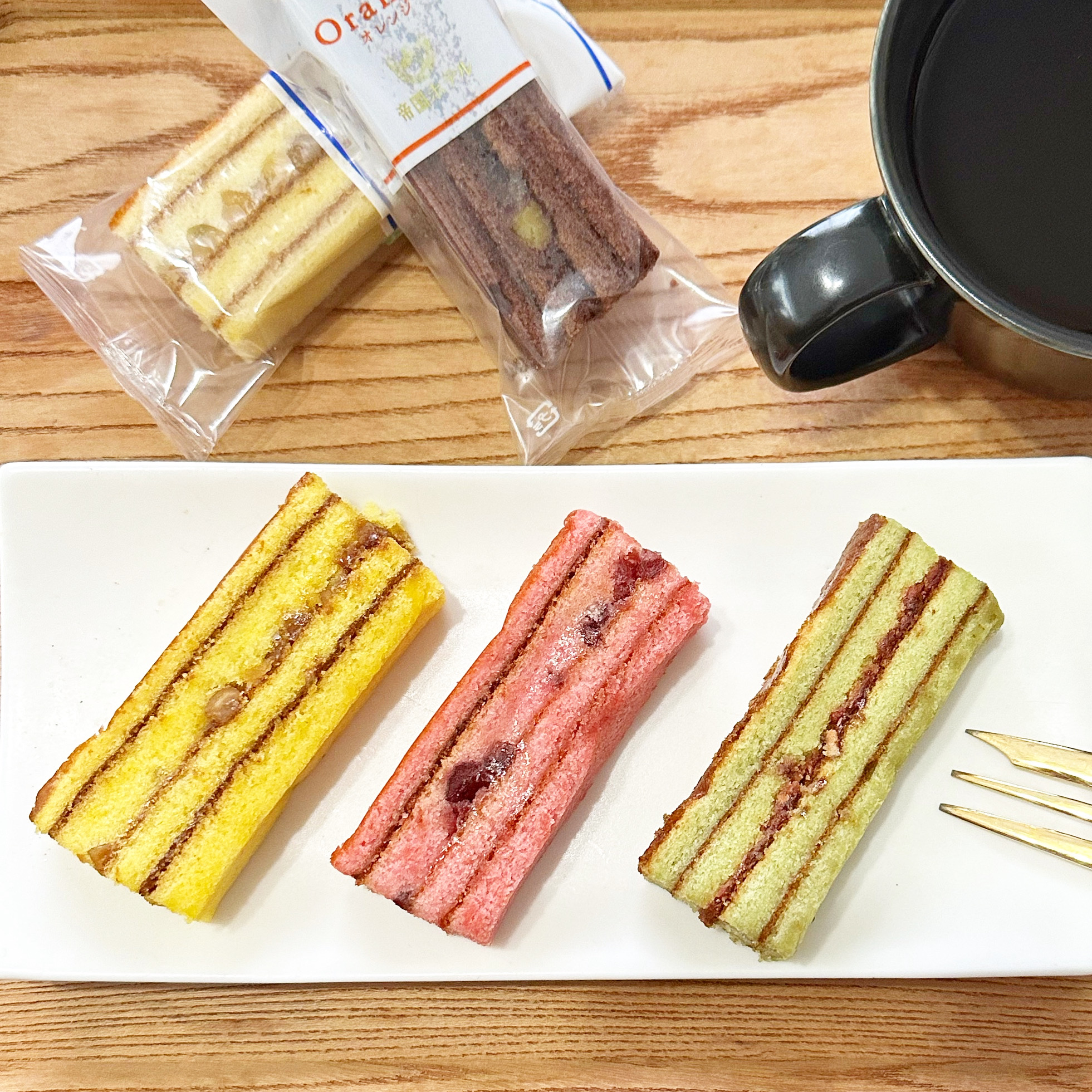 彩り鮮やかなスティック状の「バウムクーヘン」です。専用の設備で生地の表面だけをまんべんなく焼き上げ、しっとりとした食感に仕上げています。生クリームとラム酒が香る生地と、マカダミアナッツがやさしい味わいの「プレーン&マカダミアナッツ」、しっとりとしたチョコレート生地に、ラム酒に漬け込んだドライオレンジを合わせた「チョコレート&オレンジ」など5種。異なる味わいのセットなので食べ比べが楽しめます。化粧箱入りで、包装紙に包まれた状態で届くので、手土産スイーツとしてもおすすめです。