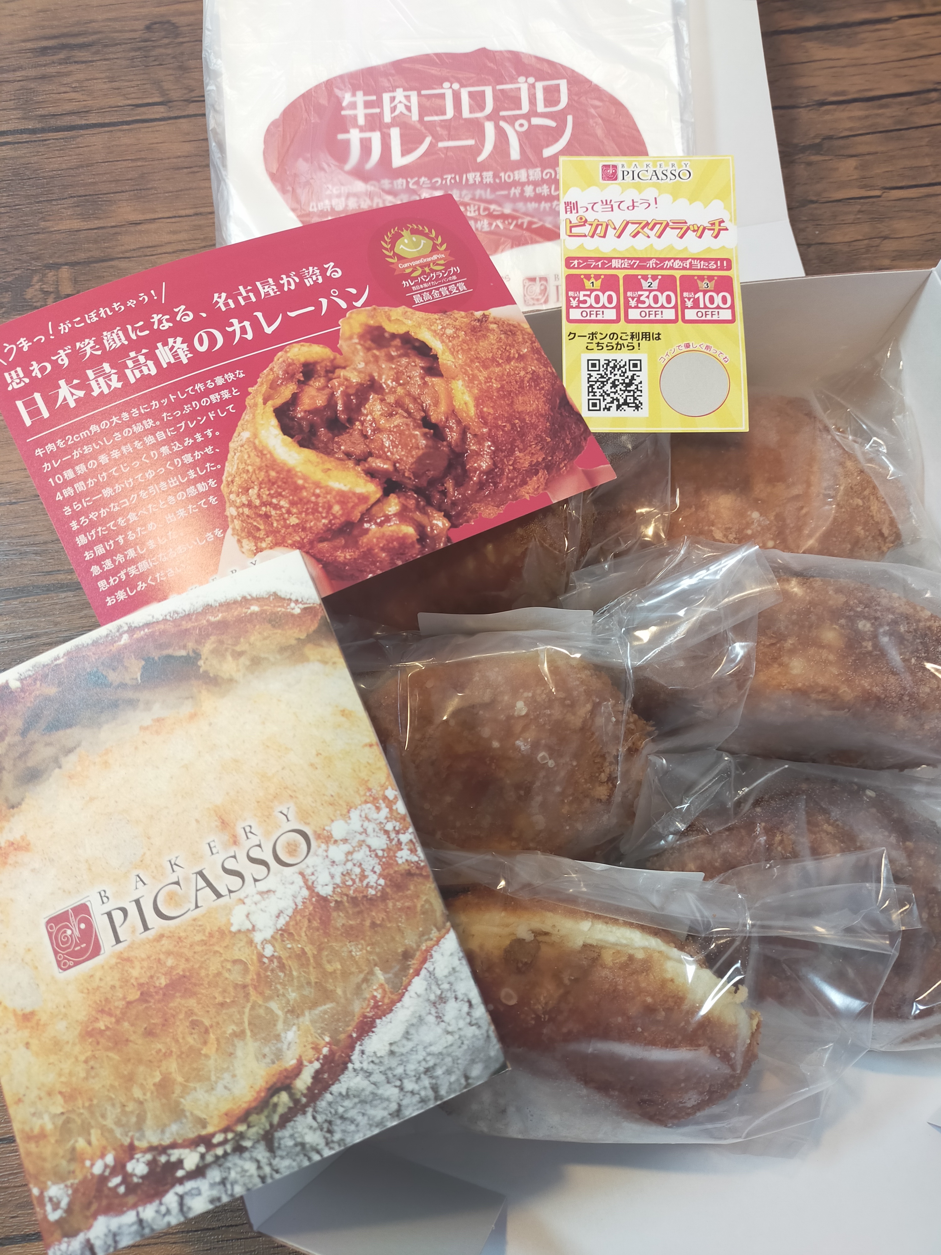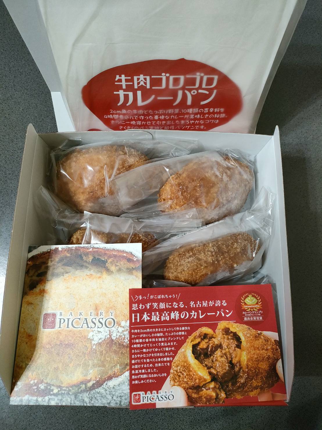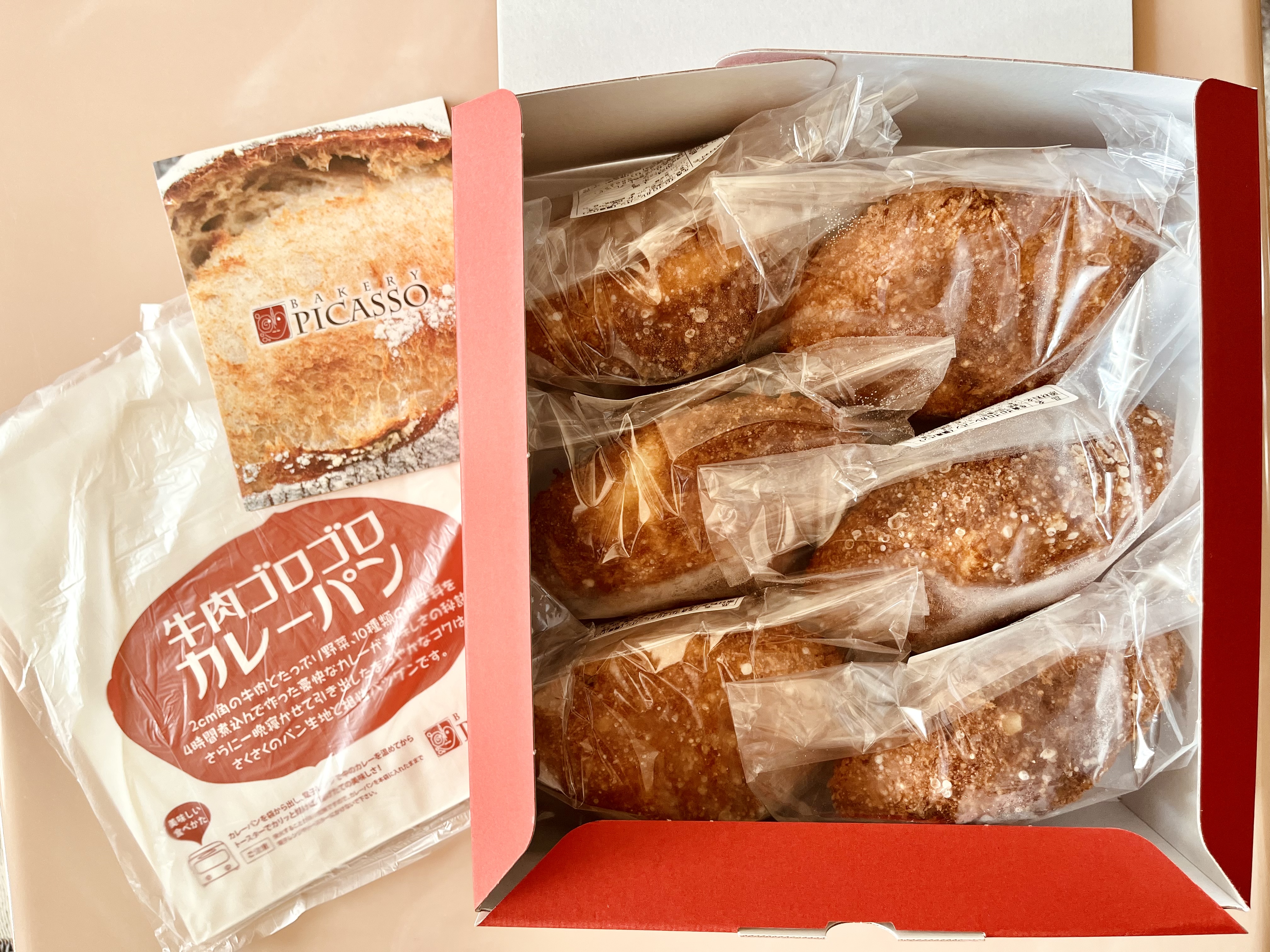 赤色が目を惹く、大人っぽいシックな箱に入っていました。 中を開けると一つずつ包装されたカレーパンが6個。大きさは手のひらサイズでずしっとボリュームがあります。