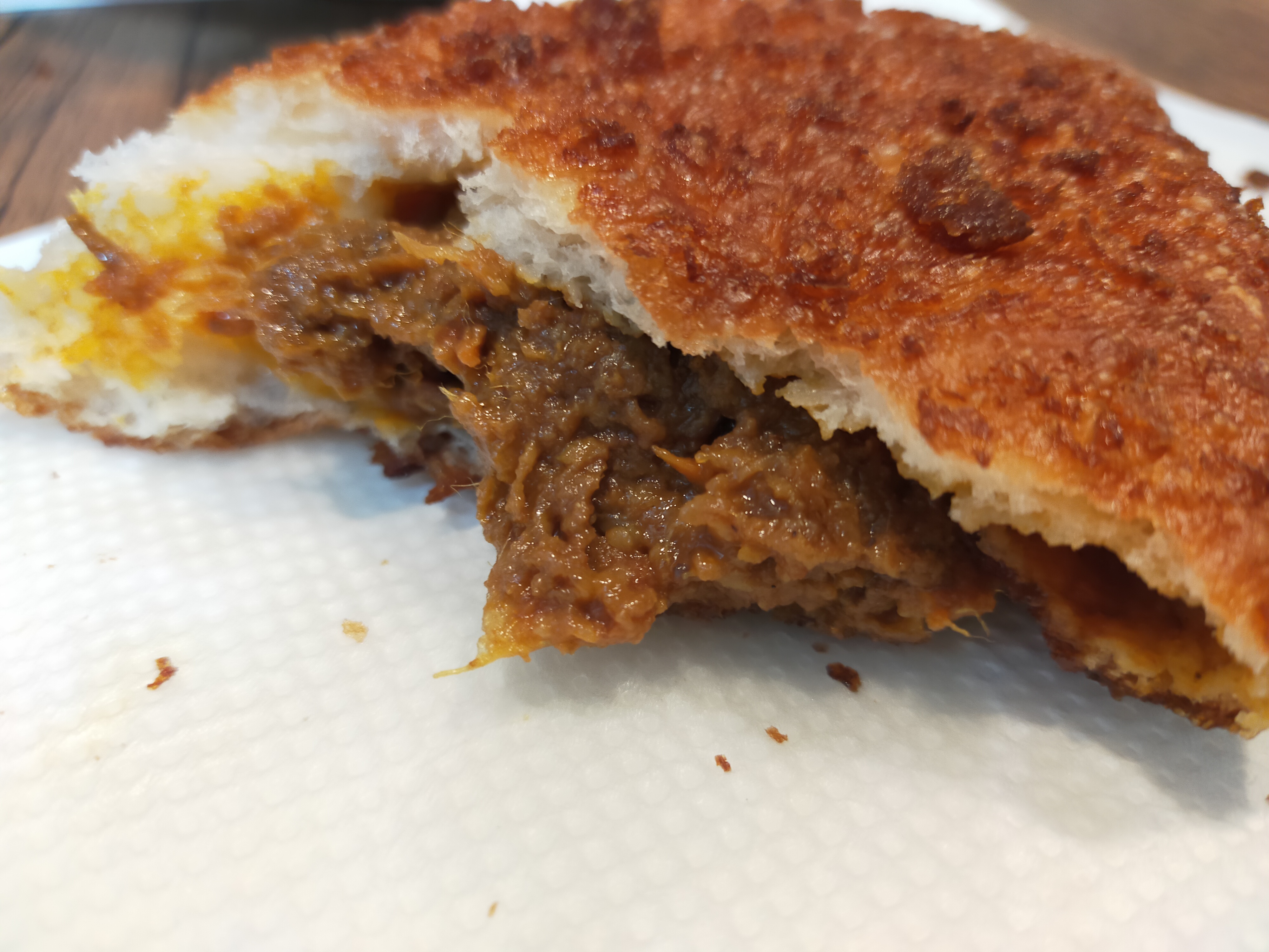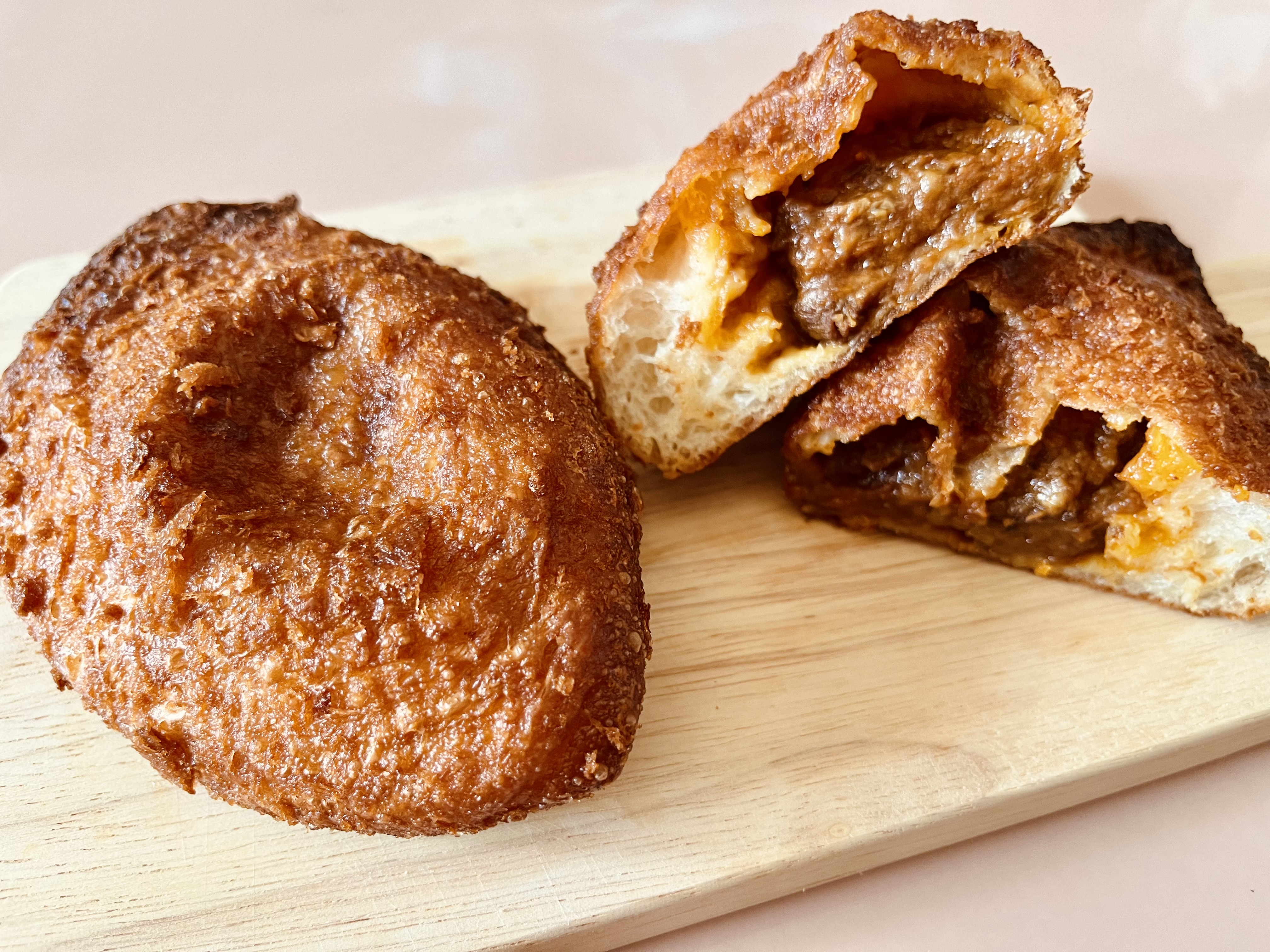 サクサクカリカリな薄めの生地は口当たりが軽く、誰にでも食べやすいです。何よりうれしいのが中から出でくる二種類のお肉。ゴロッとした牛バラ肉の食感と、小さめに切った牛すじ肉の柔らかさがいいバランスで楽しめます。