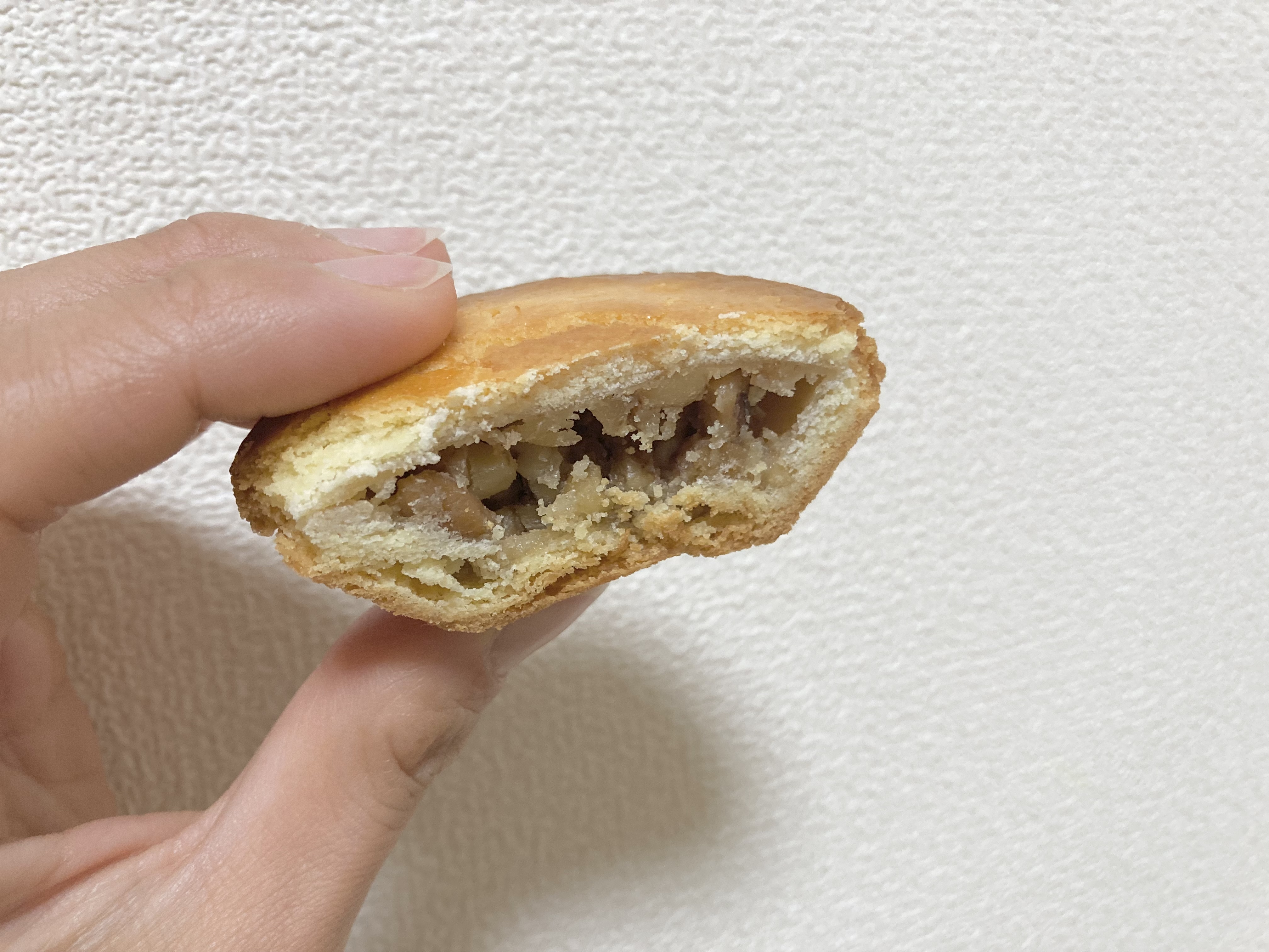 少し固めに焼き上げたクッキー生地の中に、キャラメルクリームとくるみが詰まっているので、食べごたえもしっかりあり、2 つの異なる食感のバランスも良いです。