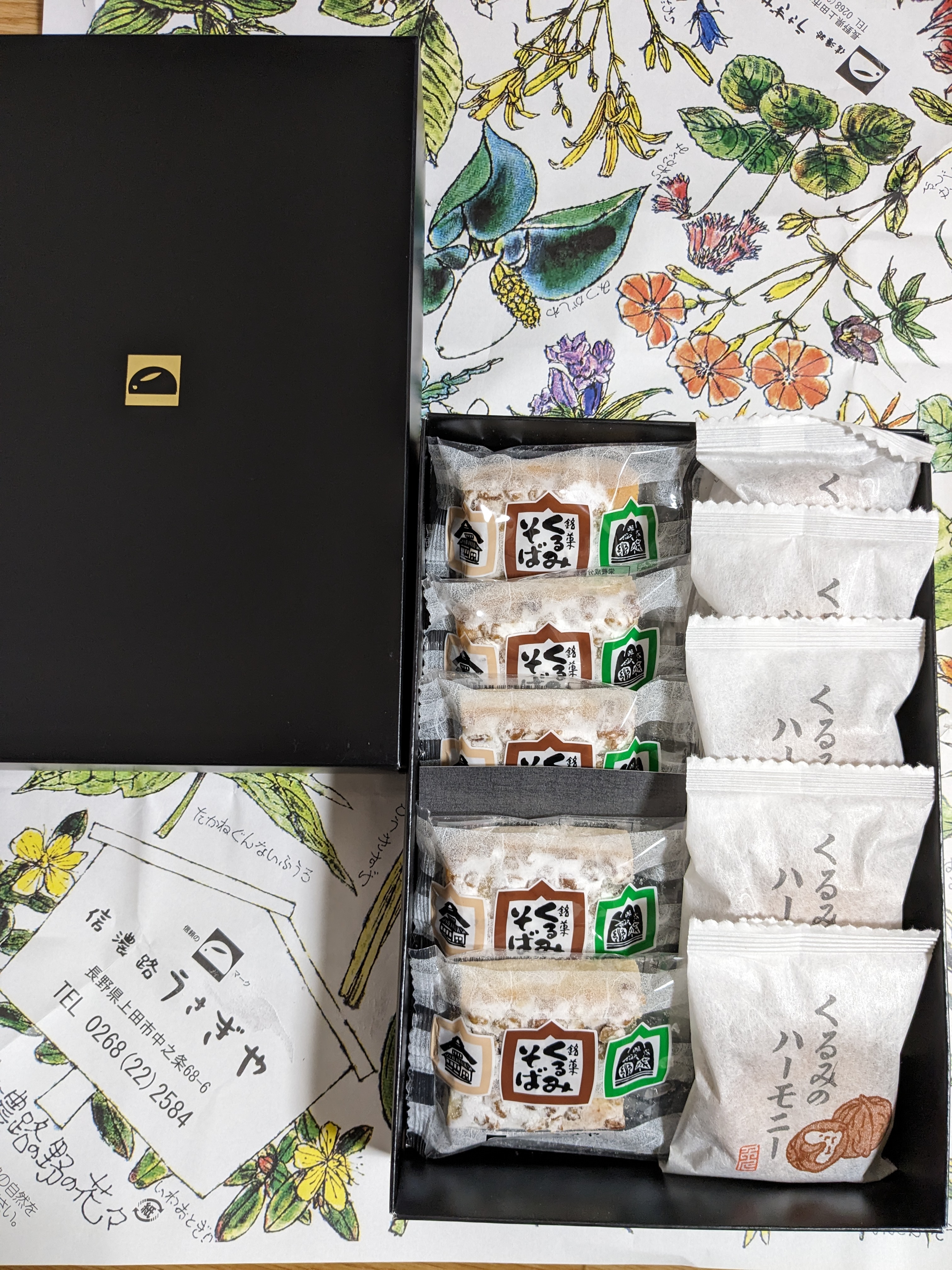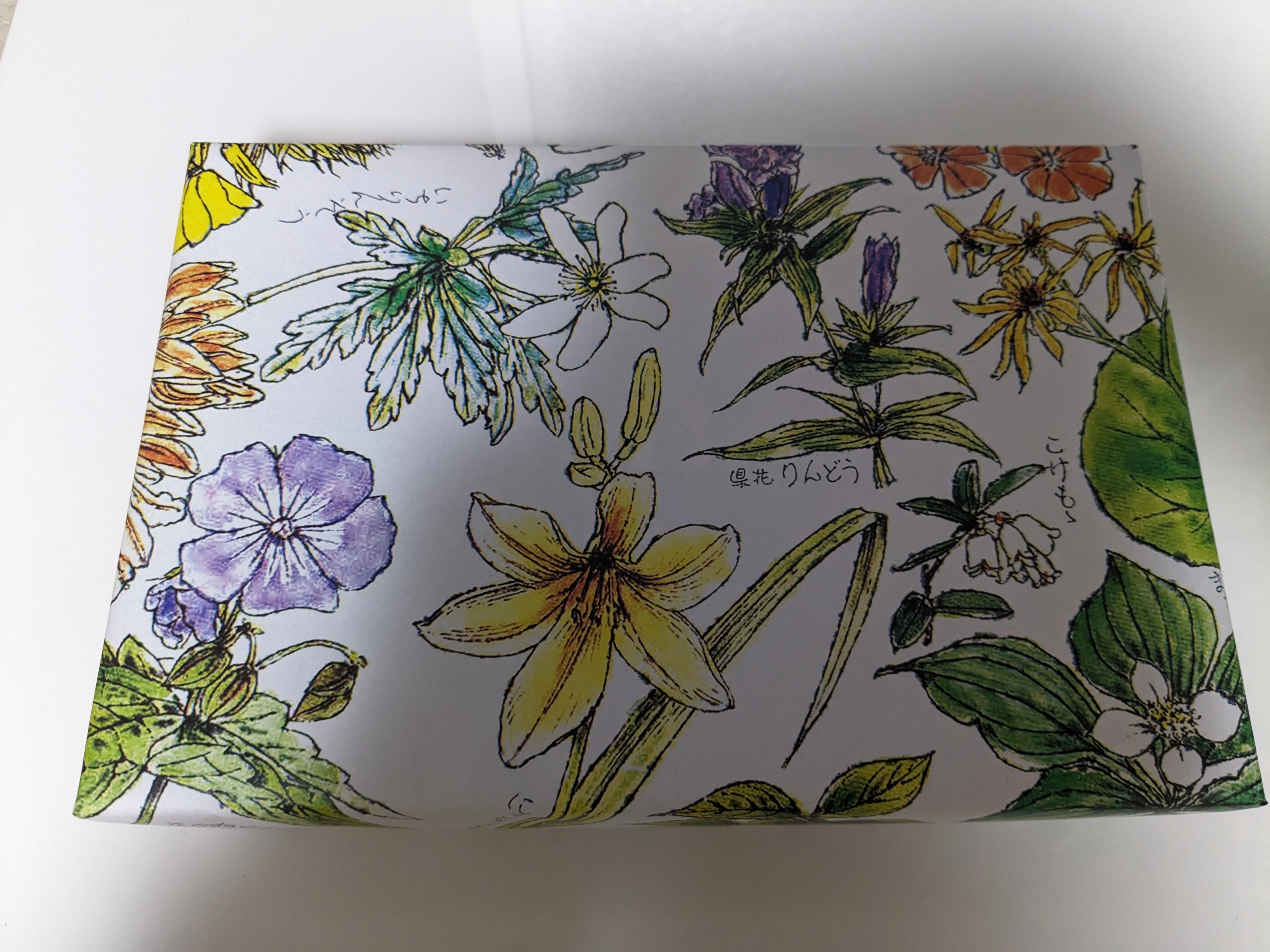 お菓子が入っている箱は、黒くシンプルなものに、中央にお店の看板マークのうさぎが金で描かれています。高級感を感じる箱でした。箱を包んであるのが、手書きで描かれたであろう様々なお花がかわいく色とりどりに載ってる包装紙です。信濃の野花らしく、自然豊かな信濃路を思い浮かべられます。