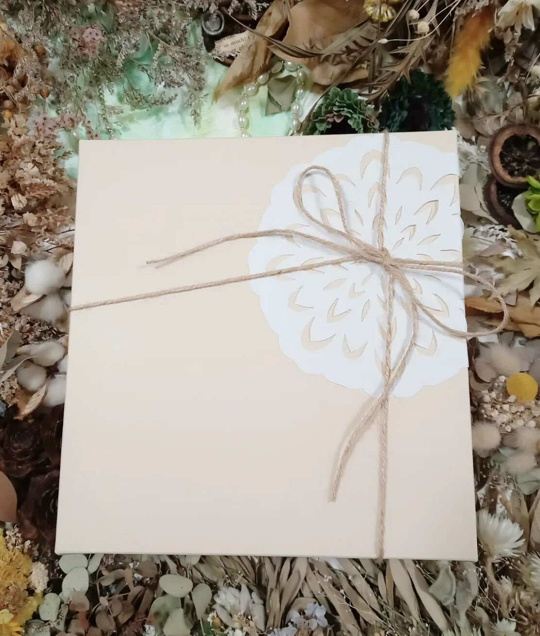 切り細工されたホワイトのペーパー飾りがボックスの蓋に貼り付けられていて、ハンドメイド感があって素敵