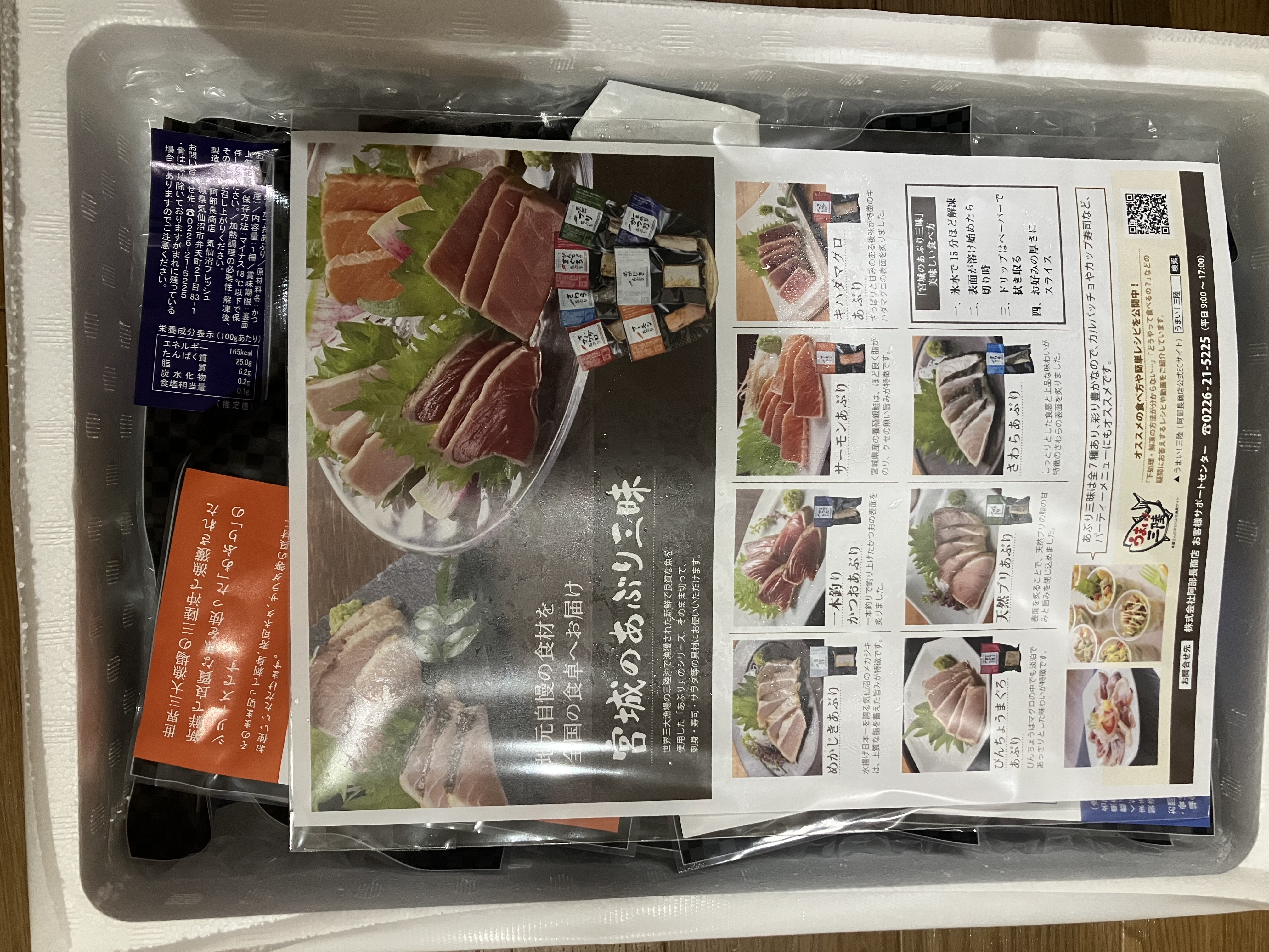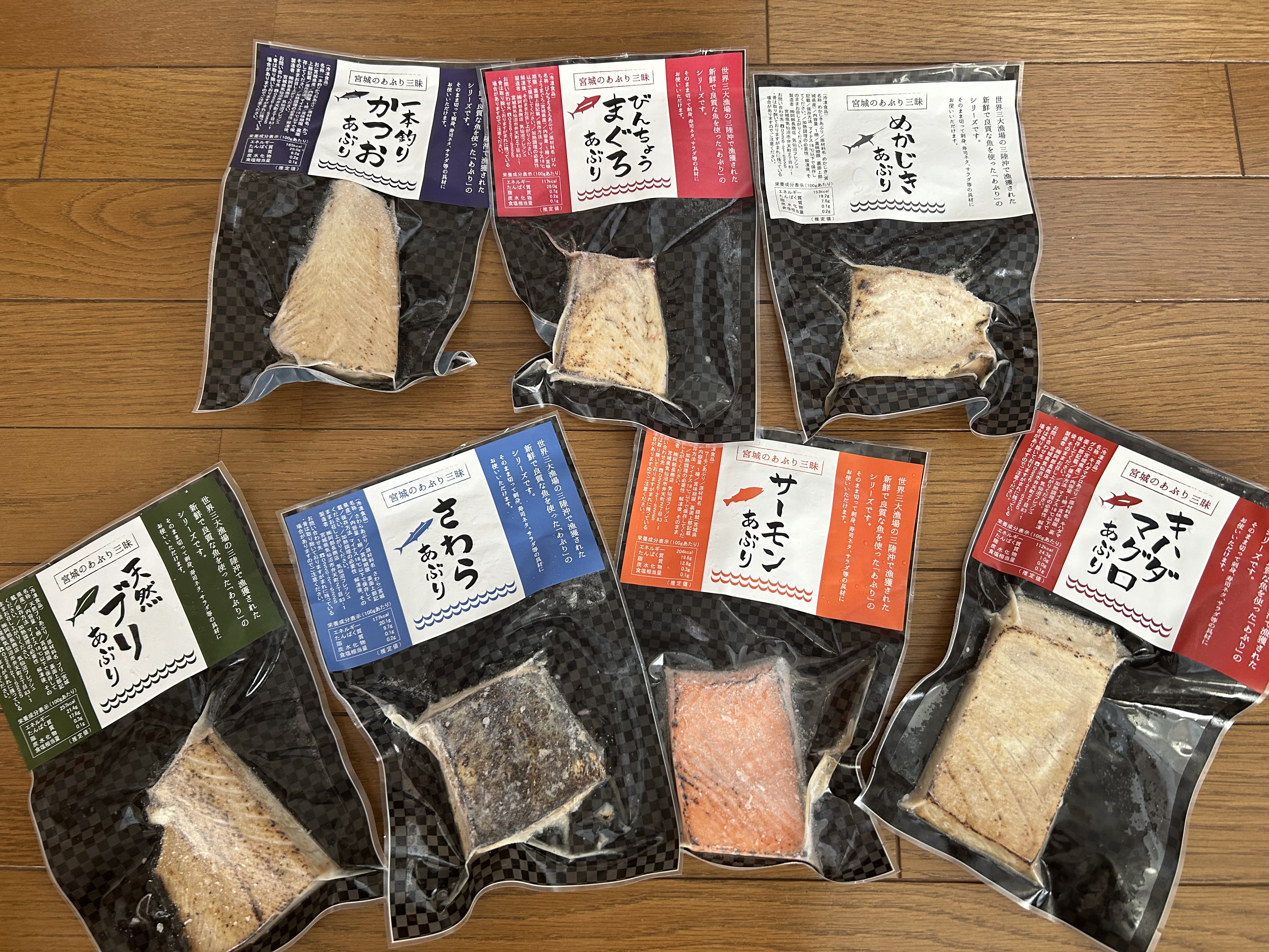 定番のマグロやサーモン、気仙沼港で水揚げされたかつおなどの刺身、全7種類をあぶって詰合せた商品です。世界三大漁場の三陸沖で漁獲された新鮮で良質な刺身用の魚を使用。そのまま切って刺身・寿司・サラダ等の具材に利用可能です。鮮度を保つ独自の技術で冷凍しているので、解凍後もドリップが少なく、生の食感を楽しめます。化粧箱に入って届くので贈り物にもおすすめです。