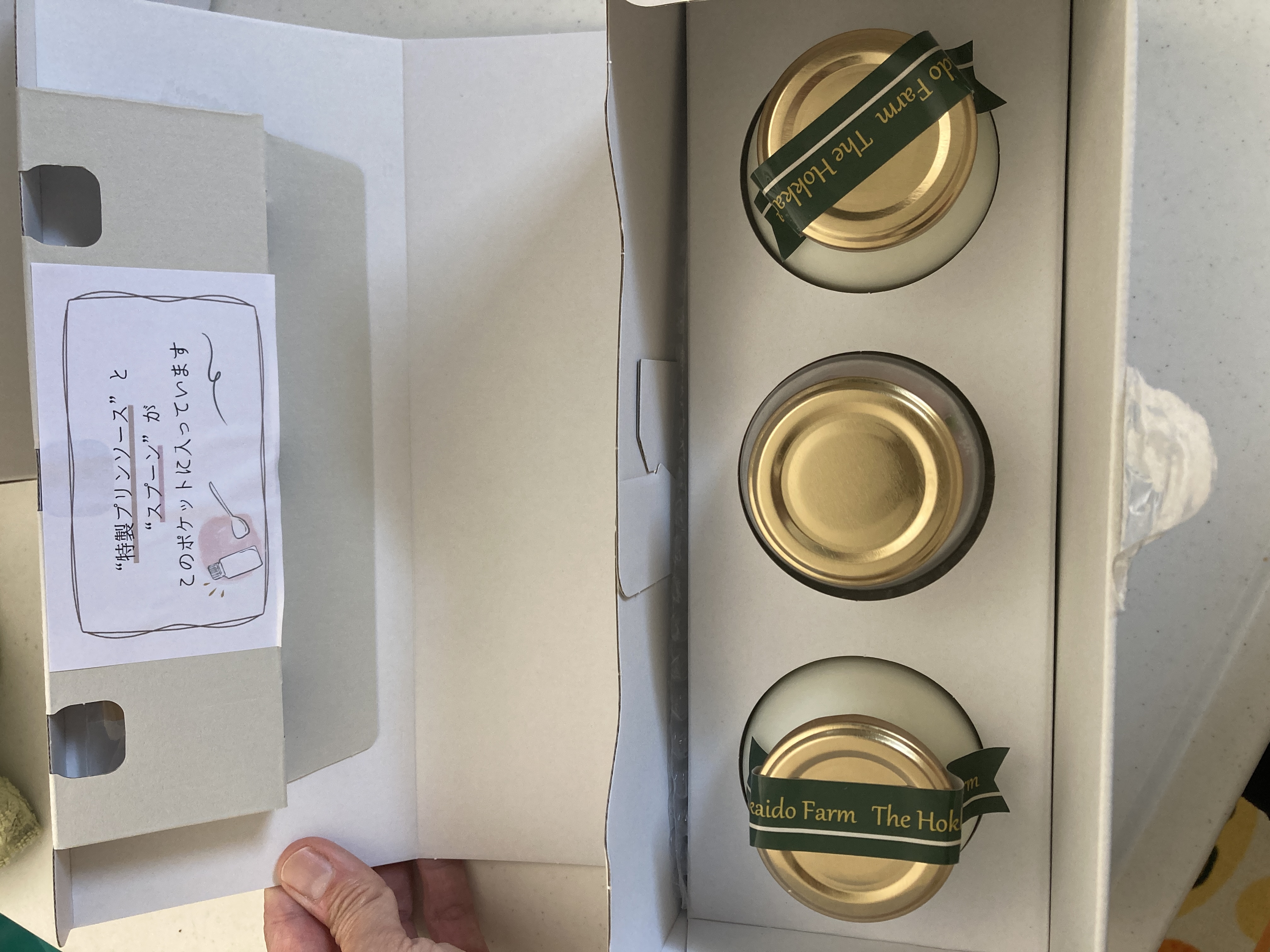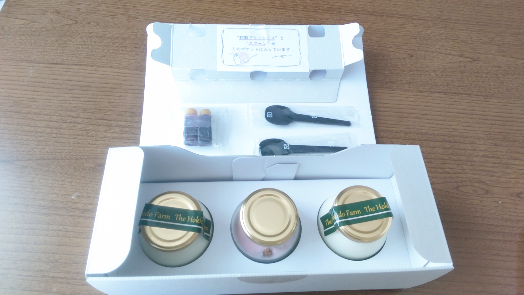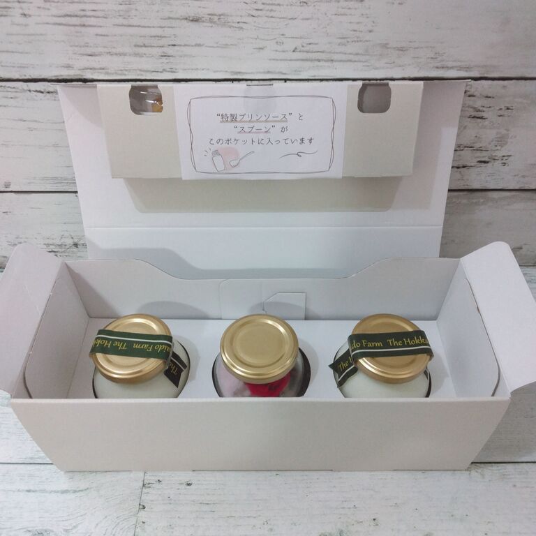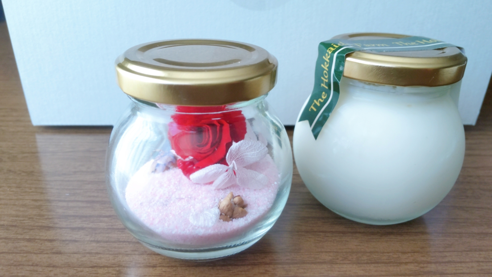 箱を開けると左右に白いプリンが入っていて、その真ん中にプリンと同じ瓶に入ったプリザーブドがあり、こちらはなんとも可愛らしい詰め合わせに。女子が開けたら可愛いっと言ってしまうやつです。