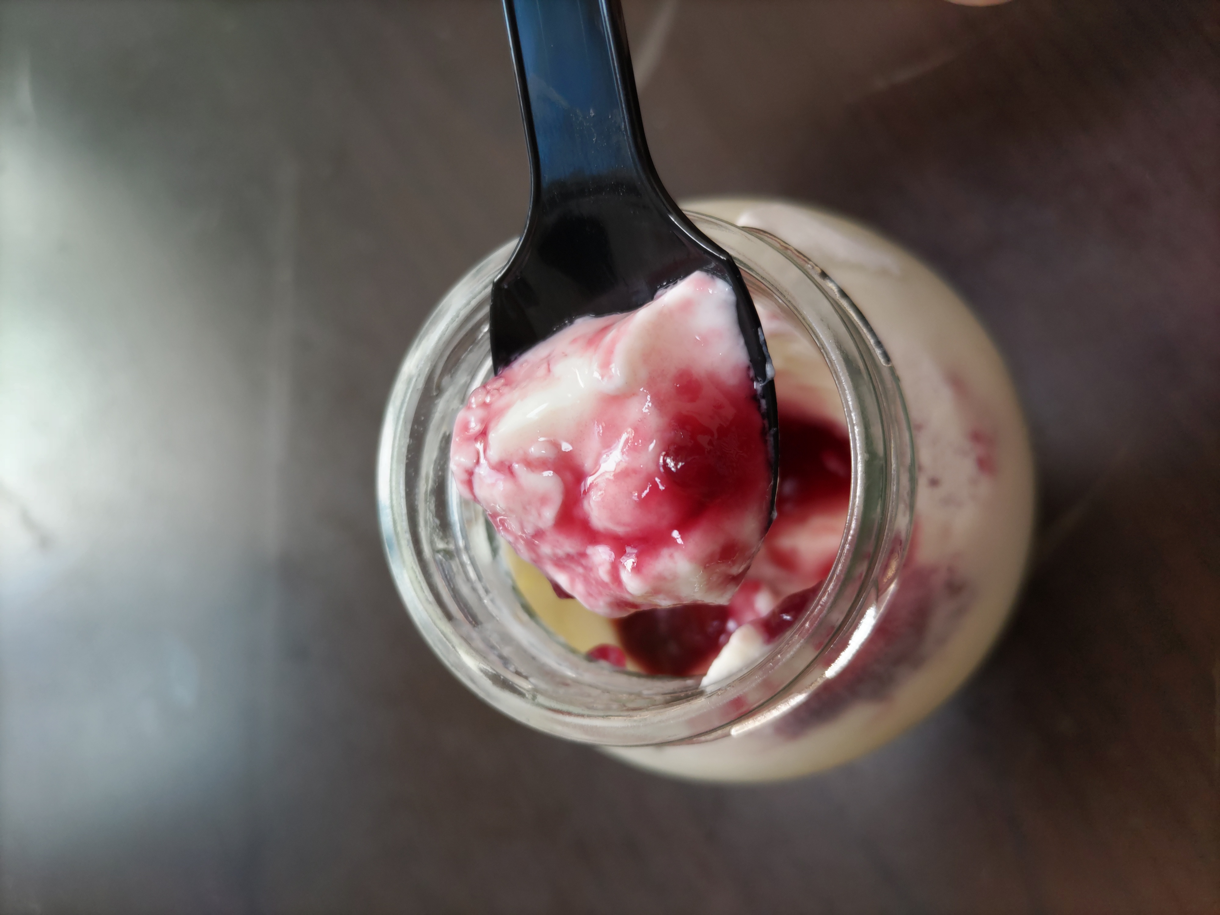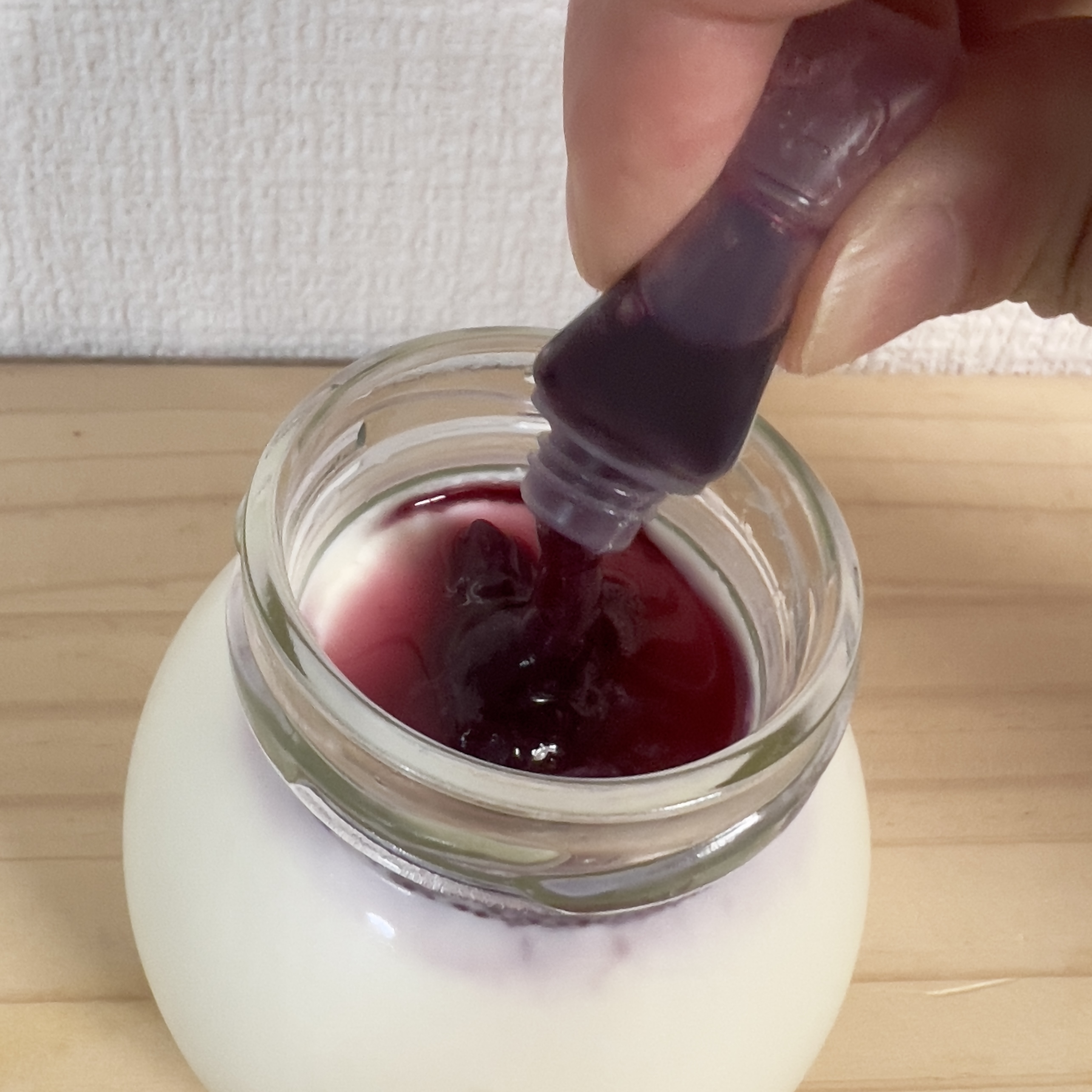 付属の山葡萄のソースをかけてみると、軽いプリンの甘さに、輪郭が出て来て、より強くプリン甘さを感じることができます。