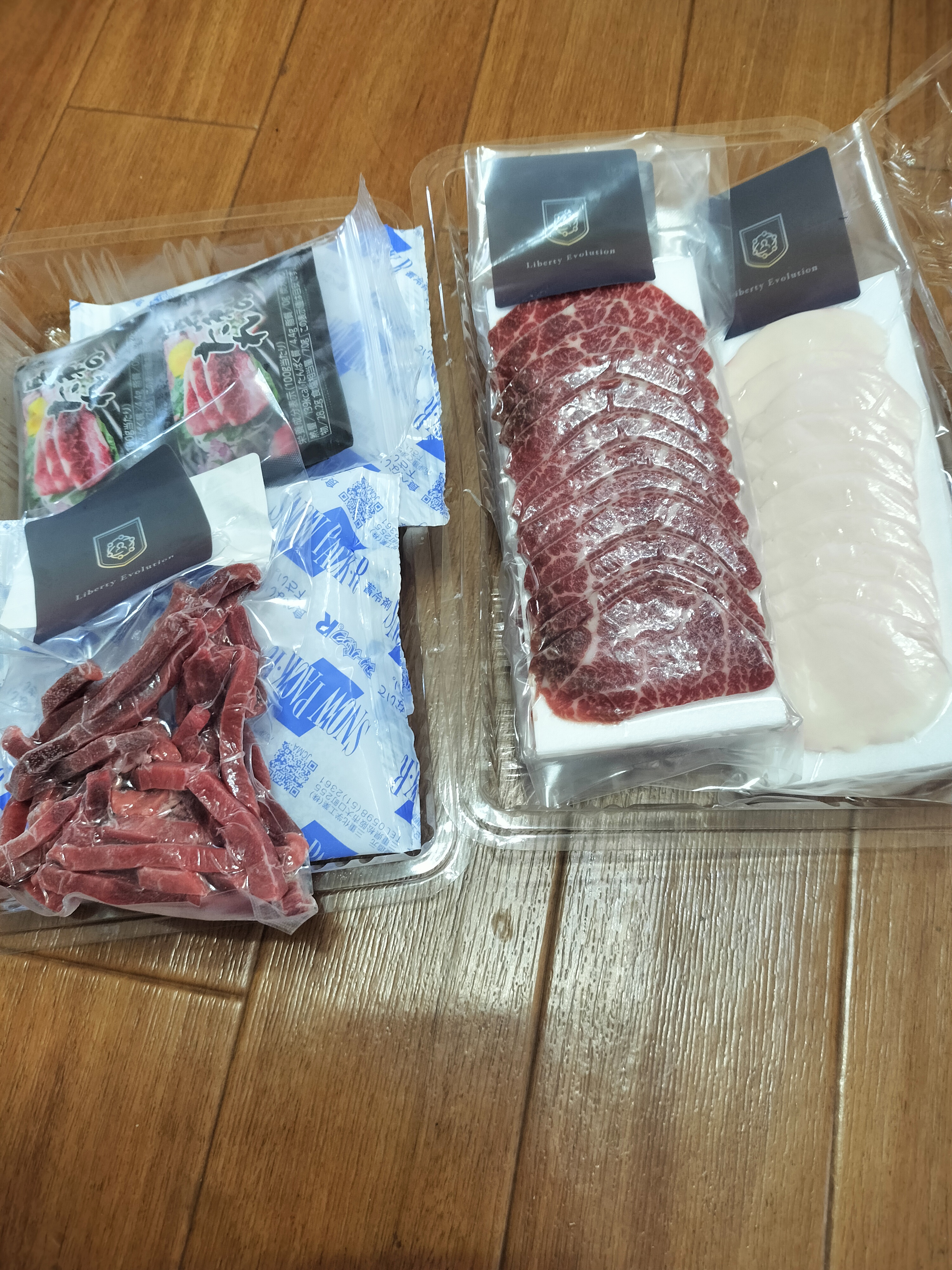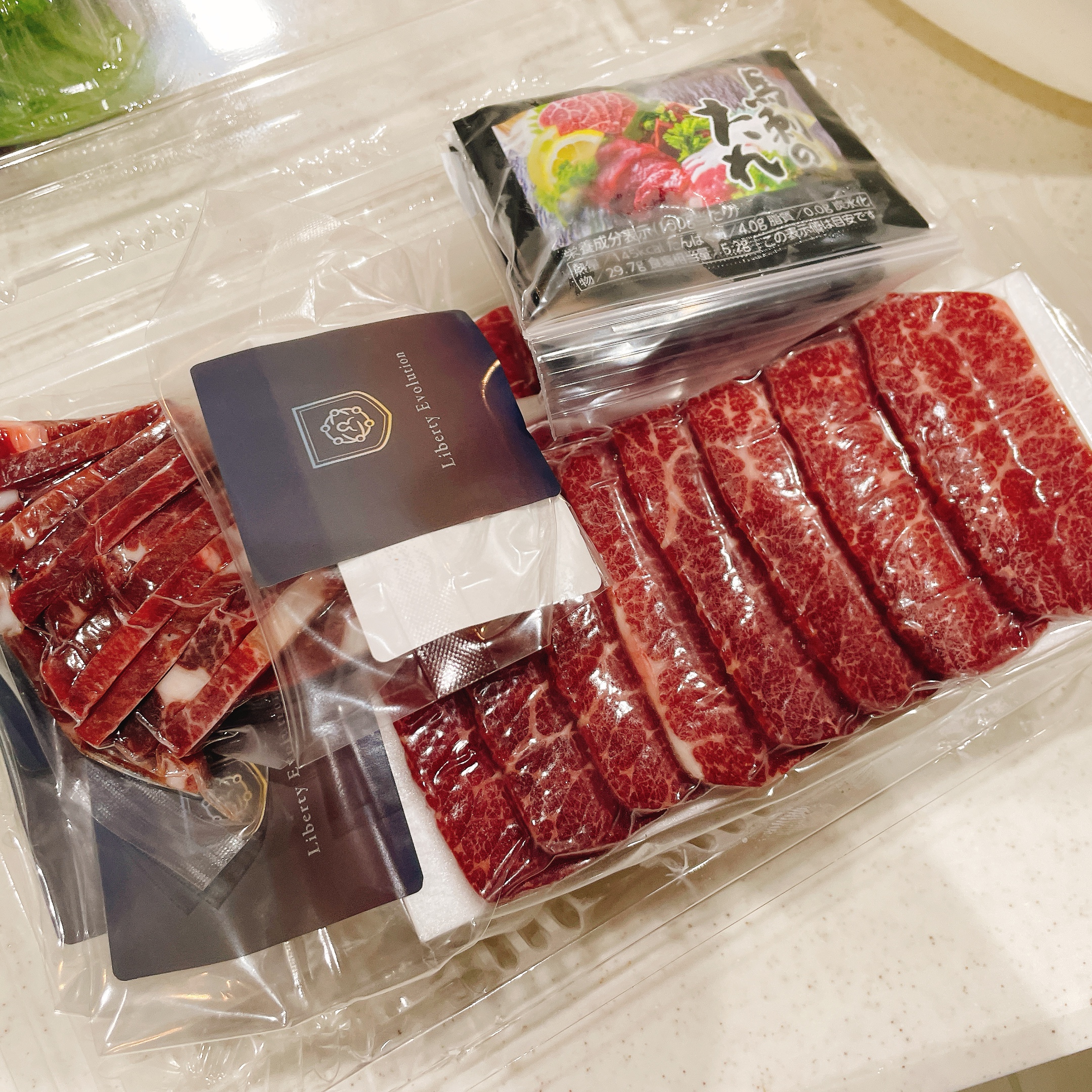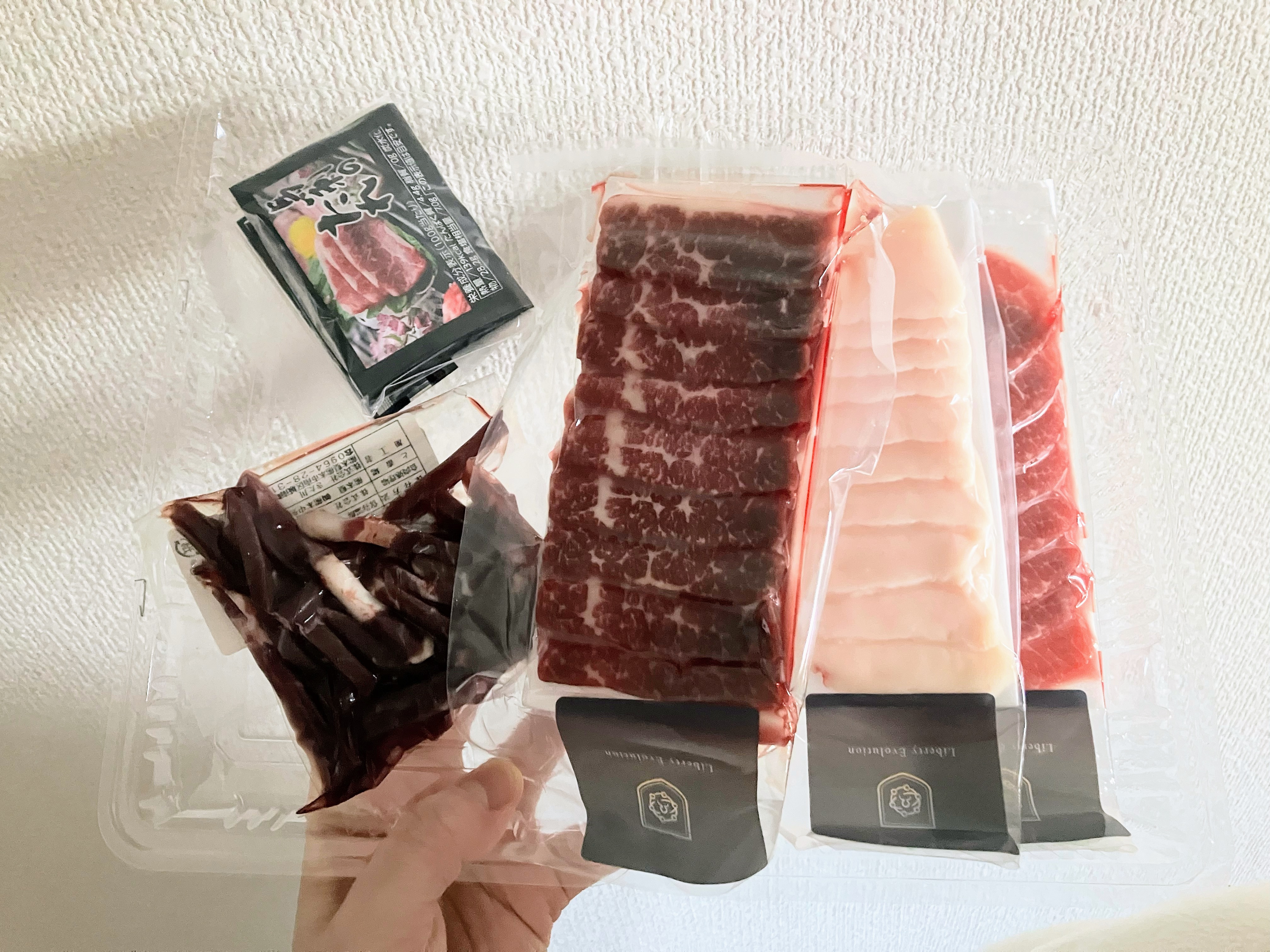 霜降りスライス、赤身スライス、たてがみスライス、馬肉ユッケと4種類も届きます!