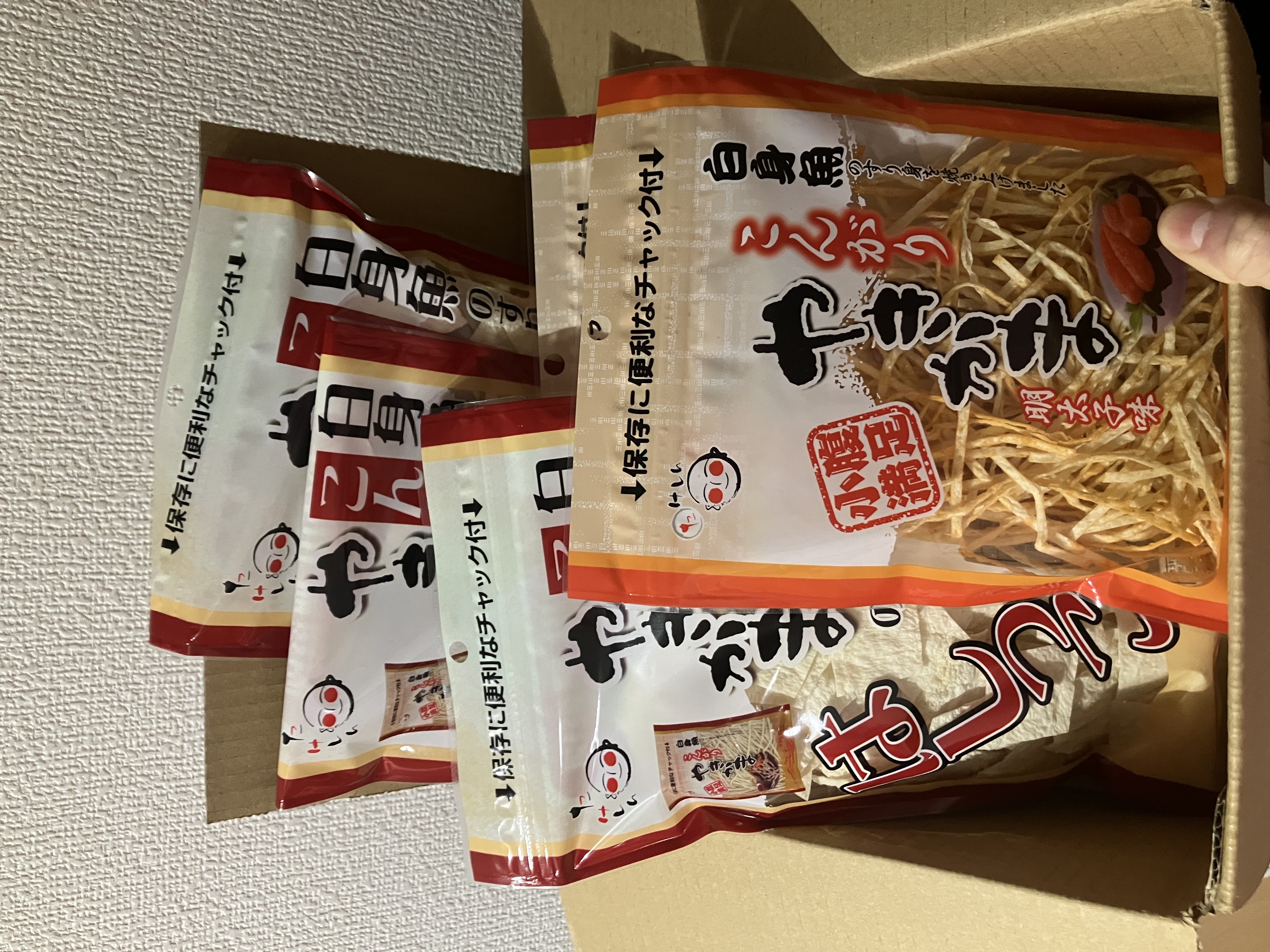 白身魚のすり身を薄く伸ばし、こんがり焼き上げた「やきかま」です。通常の「細切りタイプ」、ピリ辛の「明太子味」、やきかま製造時に発生する、魚肉シートのはしっこ等をお徳用パックとして詰め合わせた「やきかまのはしっこ」の3種。食感や味が異なるセットなので食べ比べが楽しめます。賞味期限が150日もあり、そのまま食べるだけでなく、料理にも利用できます。チャック付パッケージなので保存するのに便利です。