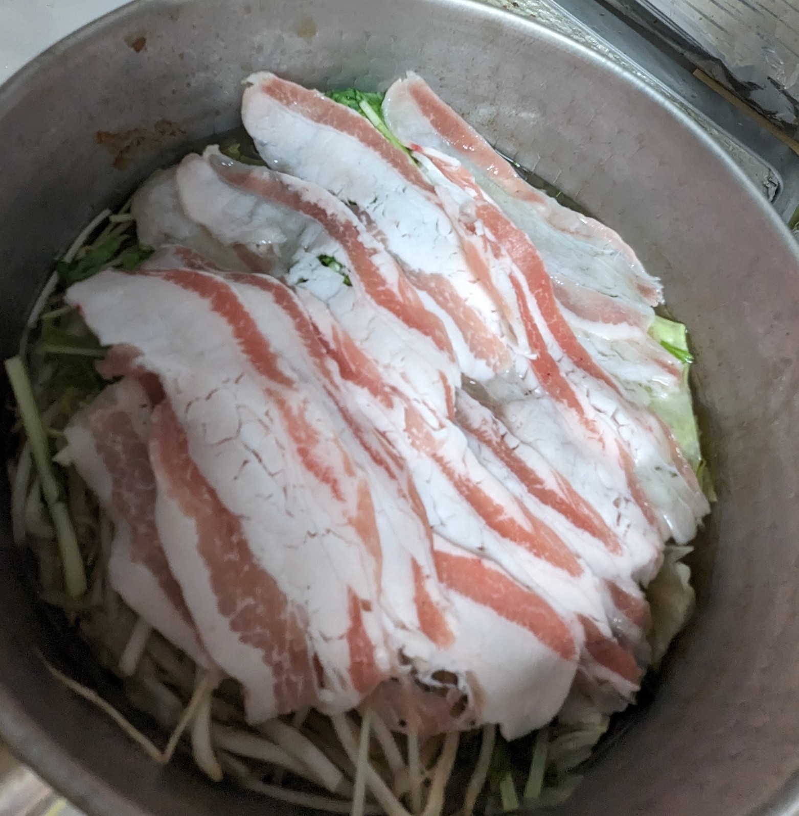白菜・長ネギ・えのき・豆腐での食材を食べやすい大きさにそれぞれ切り、鍋にだしを入れ、モニターの豚肉を出汁にくぐらせてしゃぶしゃぶしました。