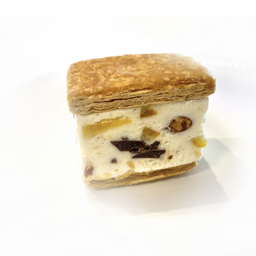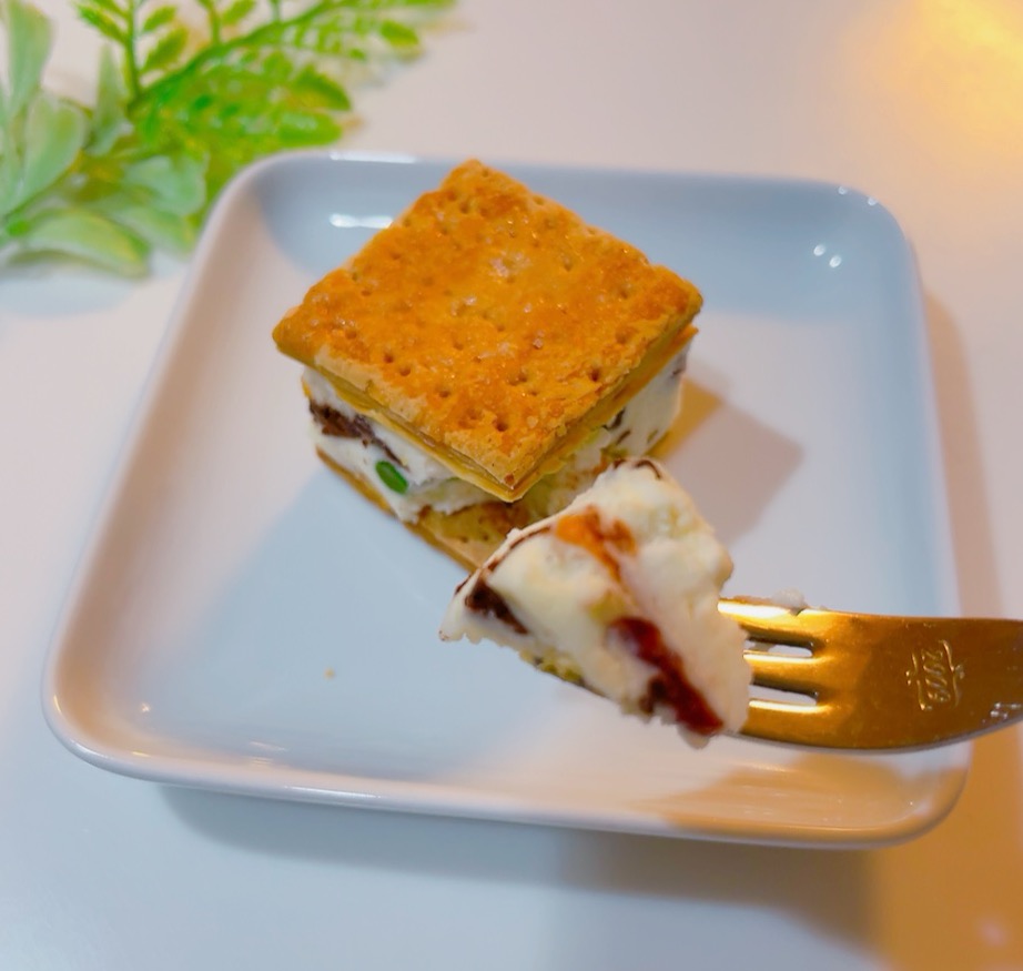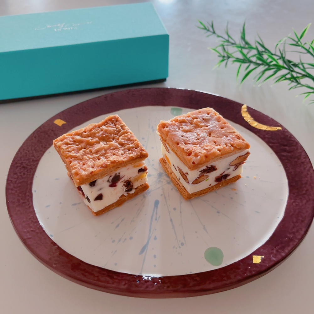 クリームが甘すぎないので、なかのドライフルーツやナッツの味を強く感じることができ、食感の良いアクセントになって、アイスサンドととして、新食感の絶品スイーツです。