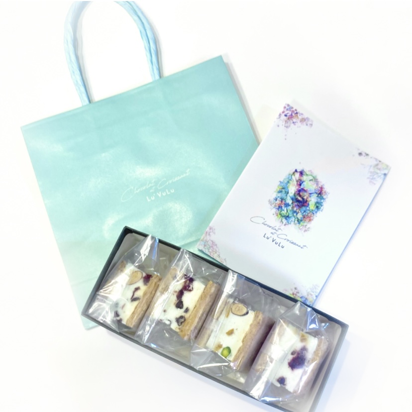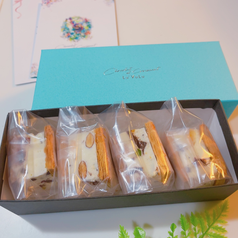 フランス産発酵バターを使用したクロワッサン生地で、カッサータをサンドした「カッサータサンド」です。「カッサータ」とは、ドライフルーツとナッツを贅沢にミックスしたシチリアの伝統的なアイスチーズケーキのこと。濃厚なアイスチーズケーキと、バターの香り豊かな生地の異なる食感が楽しい商品です。解凍時間によって味わいの変化を楽しめる新感覚スイーツ。高級感のあるブルーのボックスに入ったセットで届くので、ギフトとしてもおすすめです。