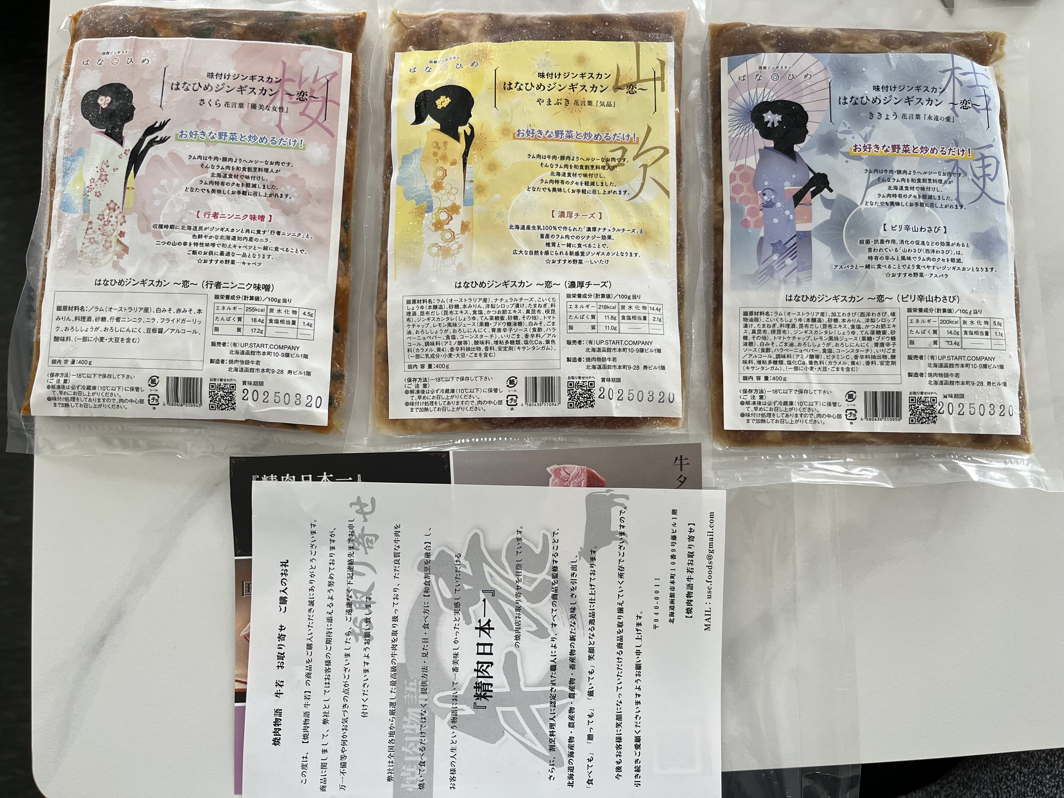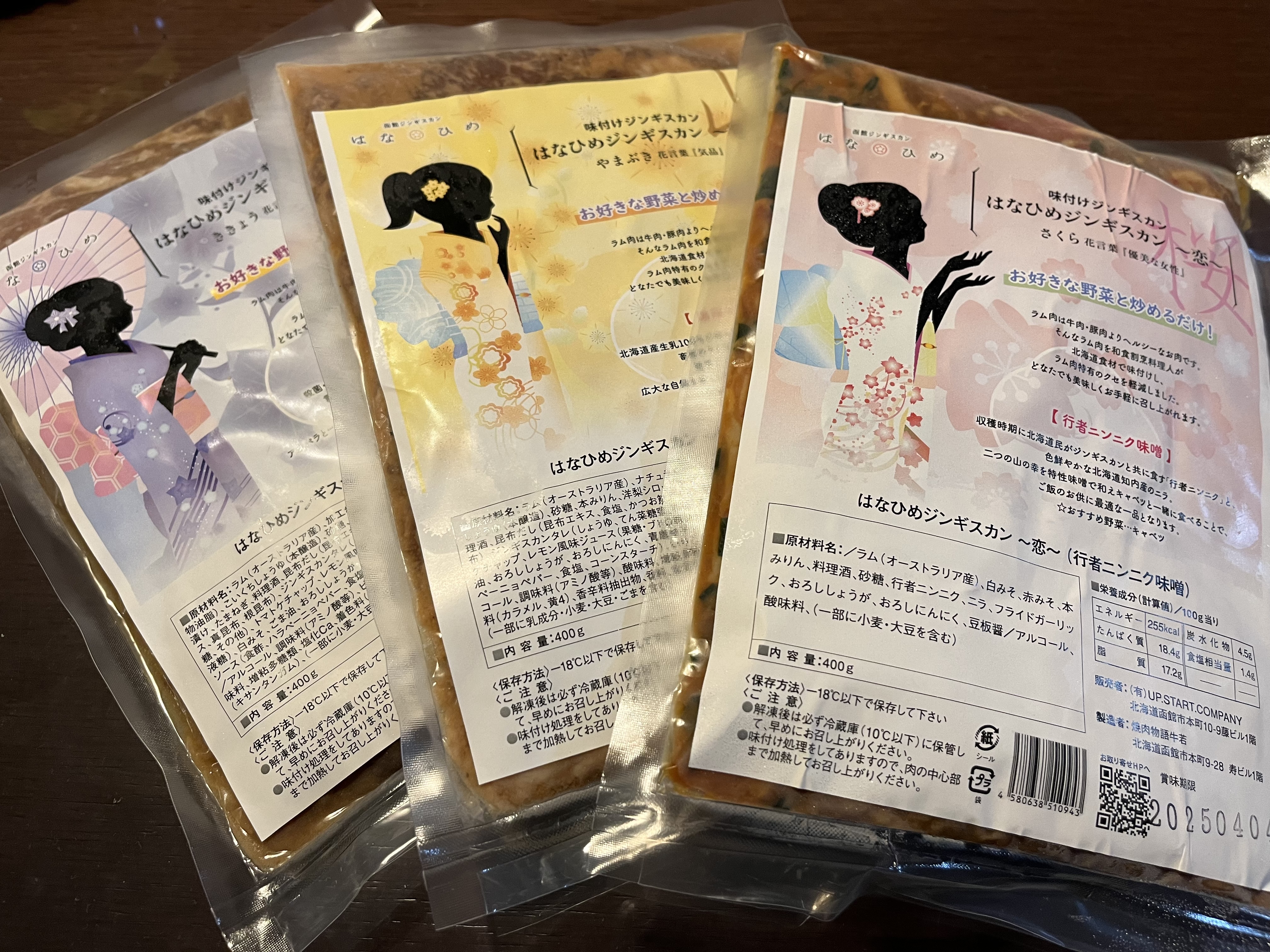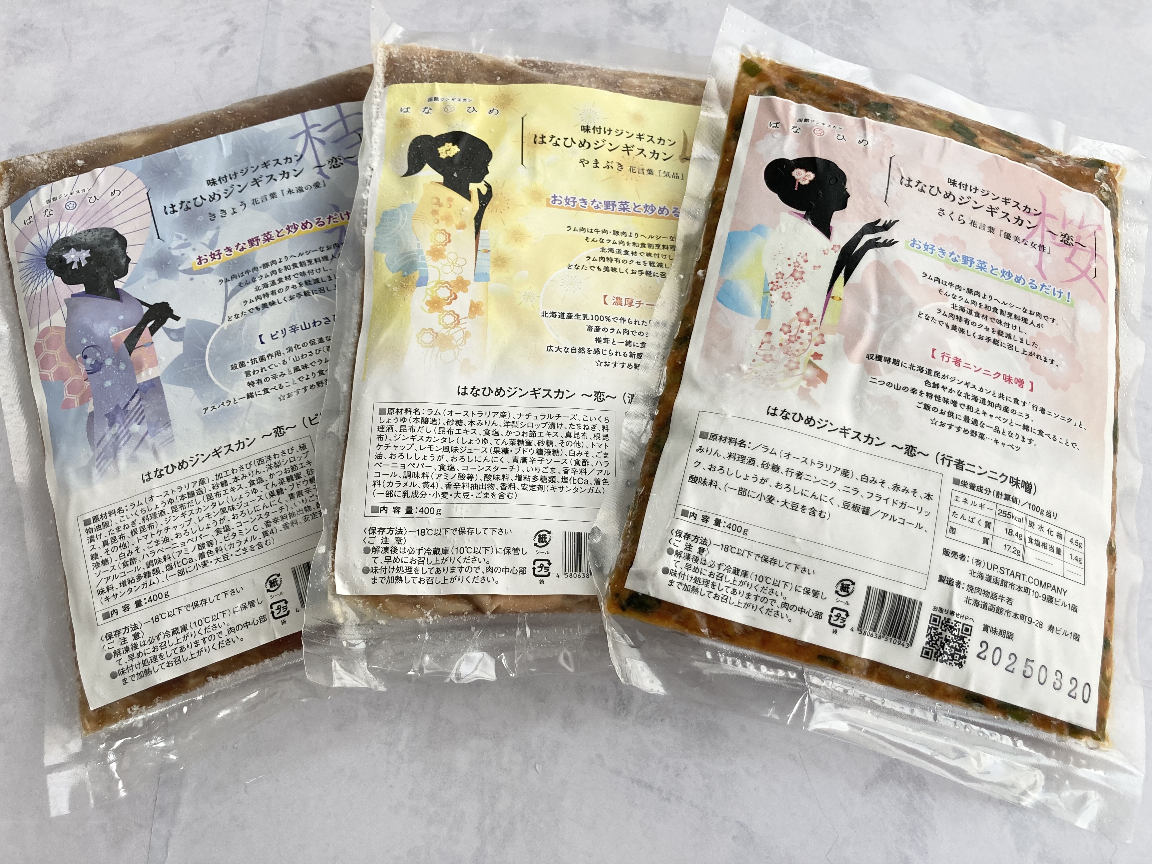 北海道のご当地グルメ「ジンギスカン」です。知内町特産「ニラ」と北海道産「行者ニンニク」を特製味噌で和えた「さくら【行者ニンニク味噌】」、北海道産生乳100%の濃厚ナチュラルチーズを使用した「やまぶき【濃厚チーズ】」、辛みと風味でラム肉のクセを軽減した「ききょう【ピリ辛山わさび】」の3種。異なる味わいのセットなので食べ比べが楽しめます。賞味期限が、製造日より360日もある商品が冷凍で届くので、ストック食材としてもおすすめ。北海道の味が自宅で手軽に楽しめます。