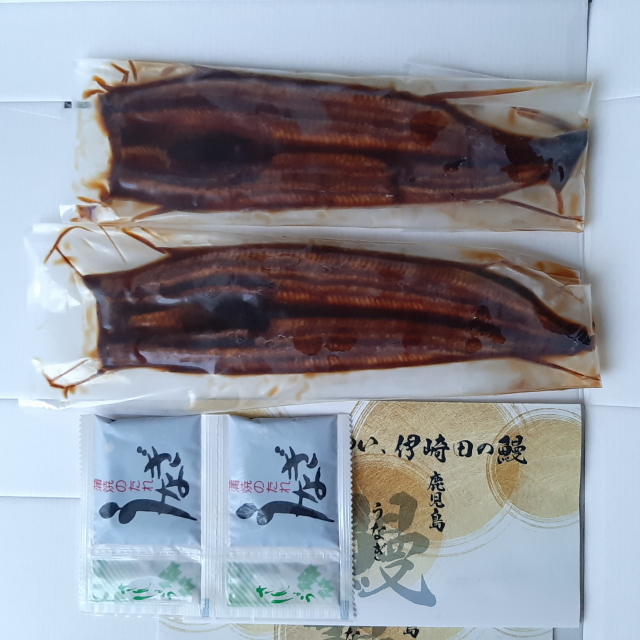 乾燥グァバ茶とハーブを配合したこだわりの餌で稚魚から育てた伊崎田の鰻は1尾が約26cmで169gもある大きなうなぎとタレと山椒のセット✨