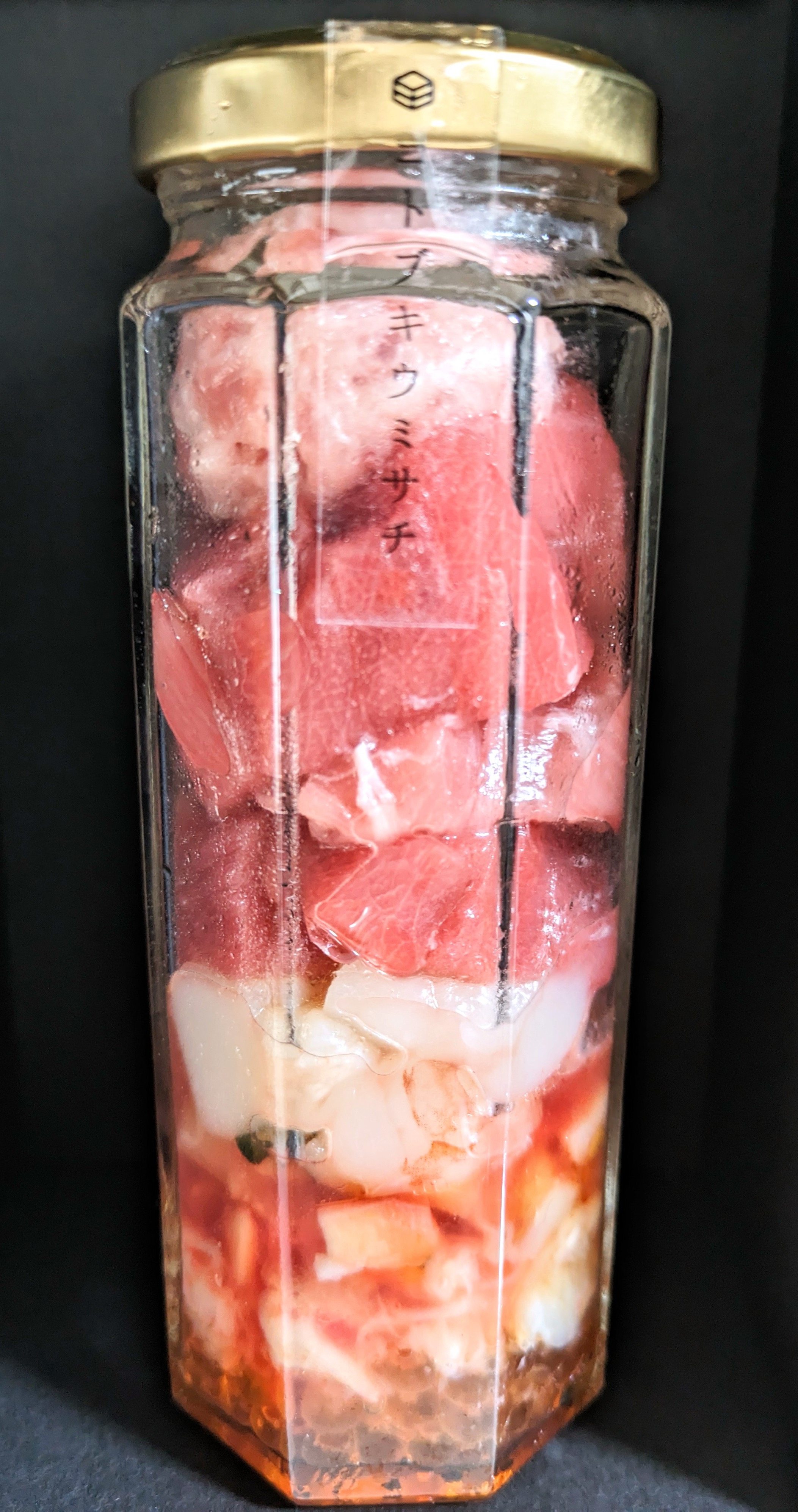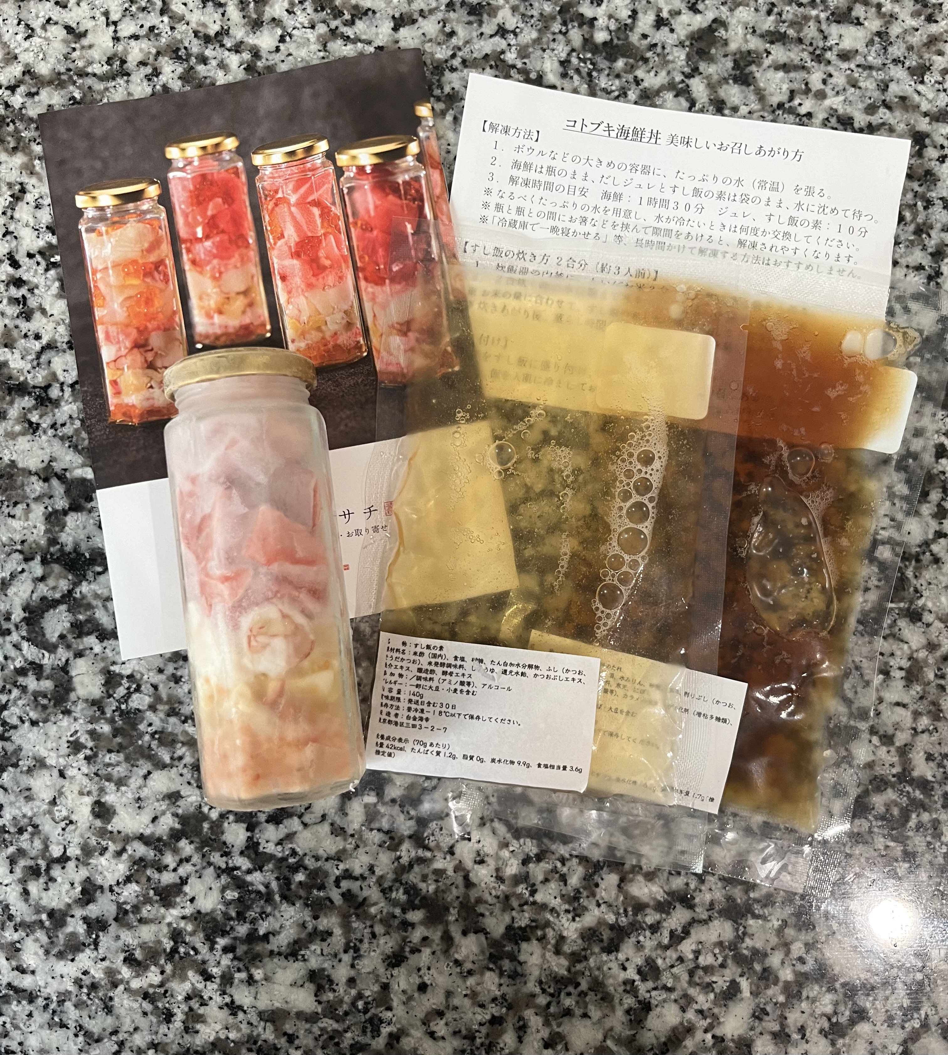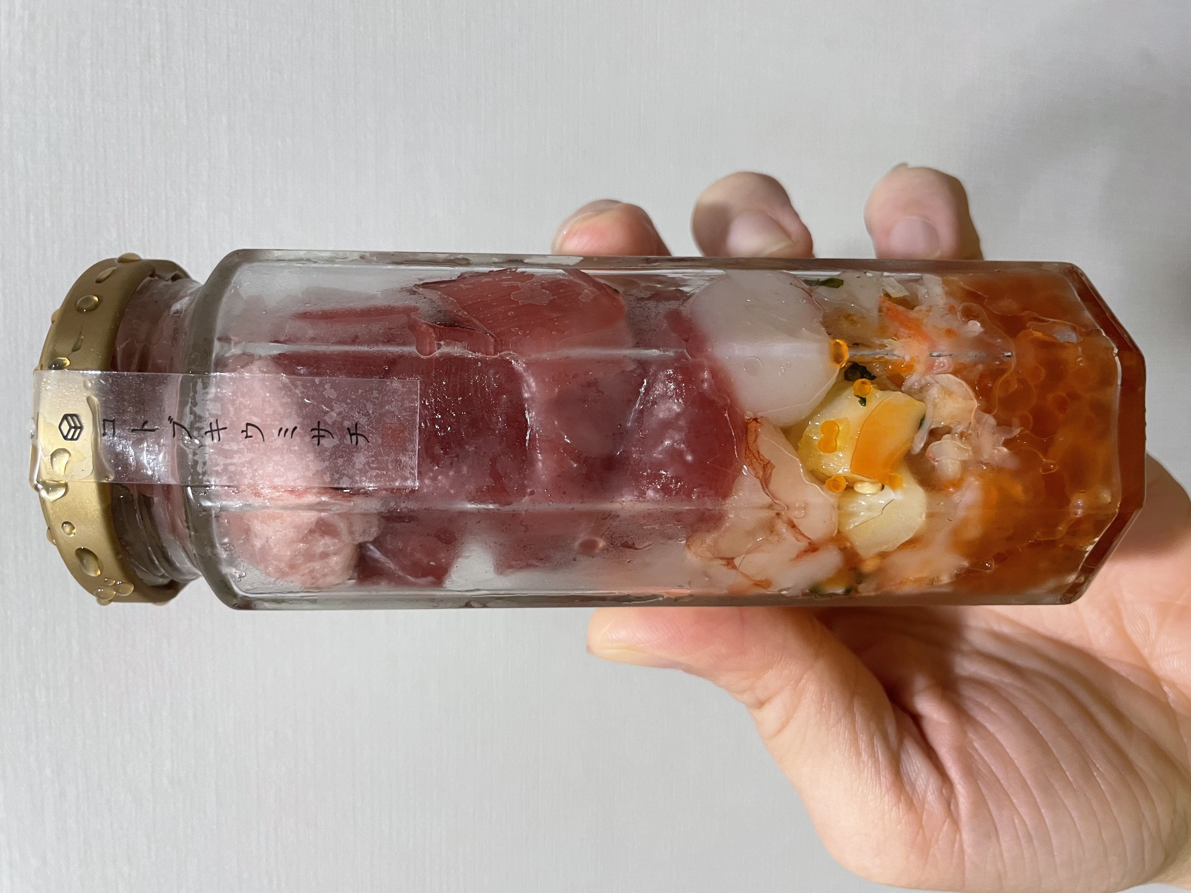 海鮮丼の具は、美味しそうな海鮮が層になって瓶に詰められています。本当に美しいです。すし飯にかけると、プラチナまぐろ、いくら、ずわい蟹、ほたて、赤えび、ねぎとろ、つぶ貝など様々な種類が入っていることが分かりました。ジュレをかけるときらきらして宝石箱のようです。