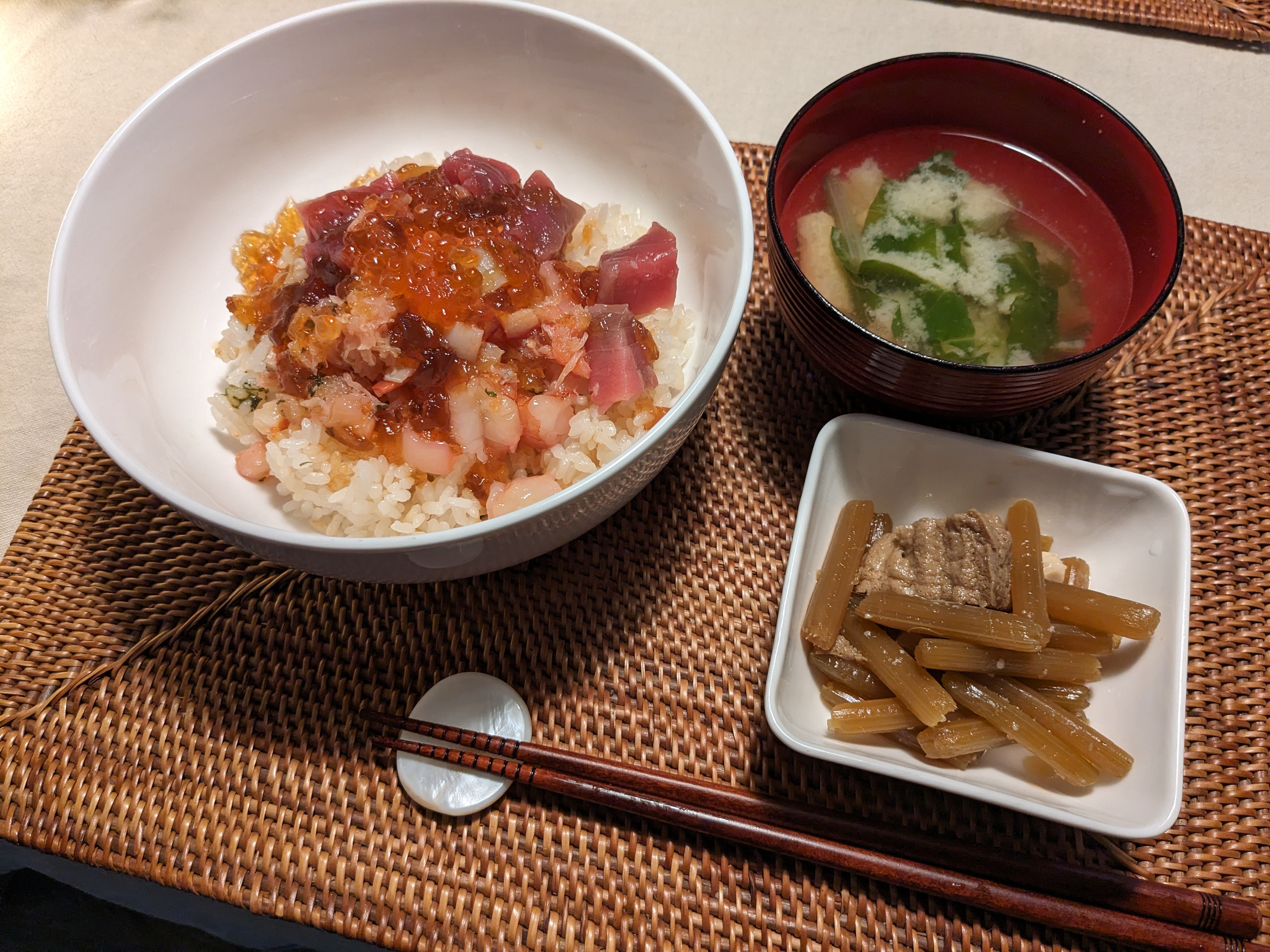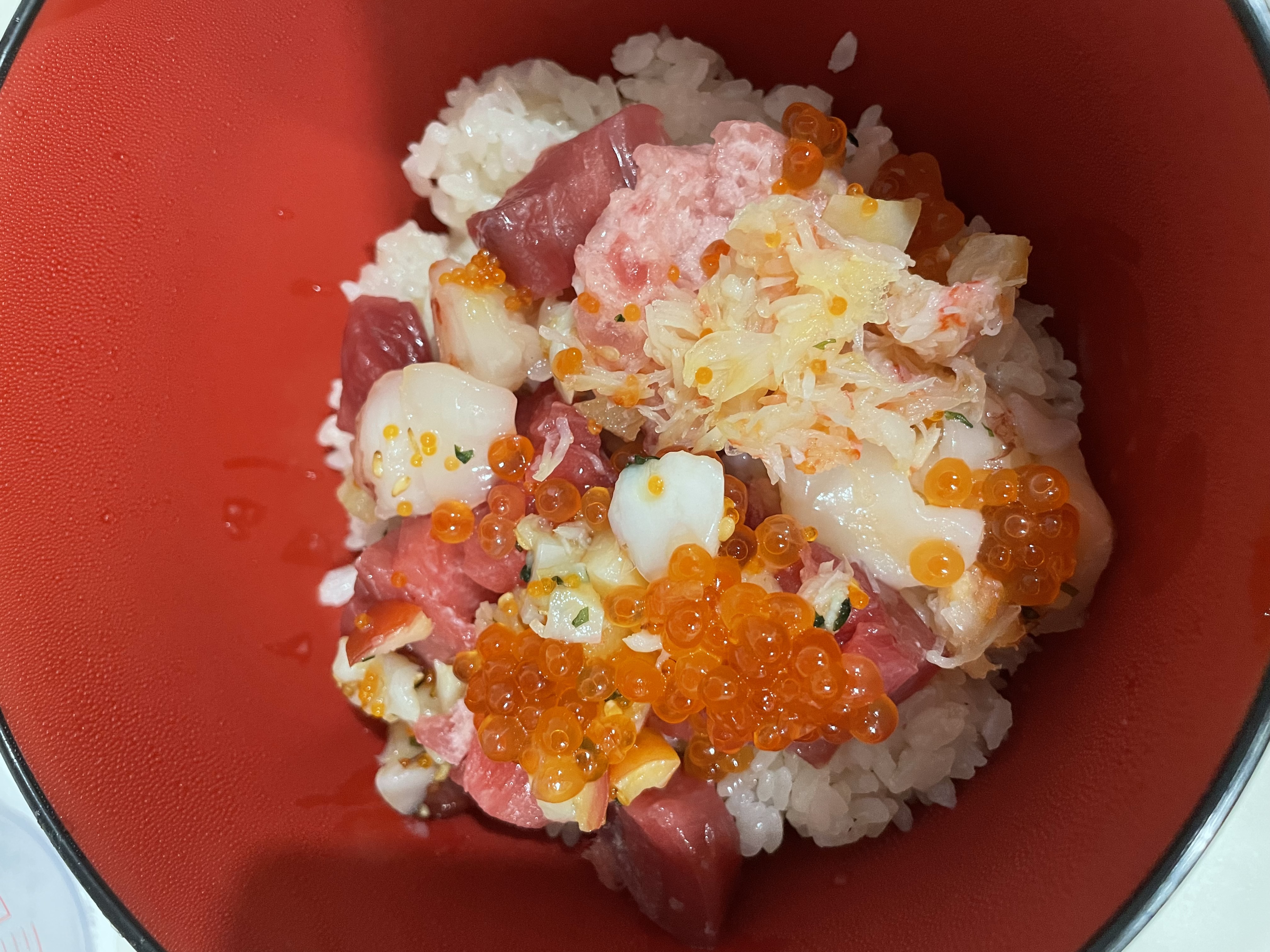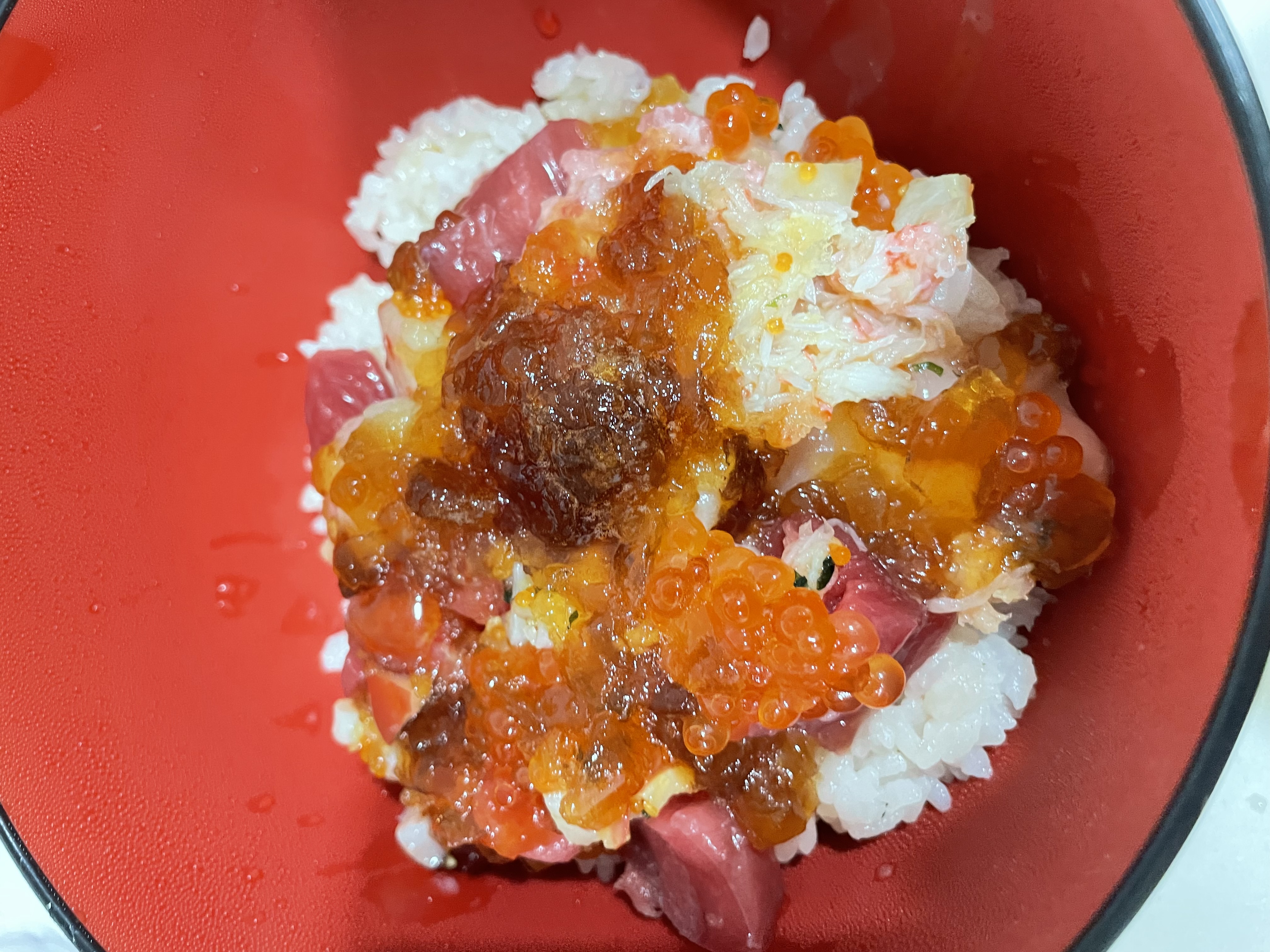 海鮮丼の具は、美味しそうな海鮮が層になって瓶に詰められています。本当に美しいです。すし飯にかけると、プラチナまぐろ、いくら、ずわい蟹、ほたて、赤えび、ねぎとろ、つぶ貝など様々な種類が入っていることが分かりました。ジュレをかけるときらきらして宝石箱のようです。