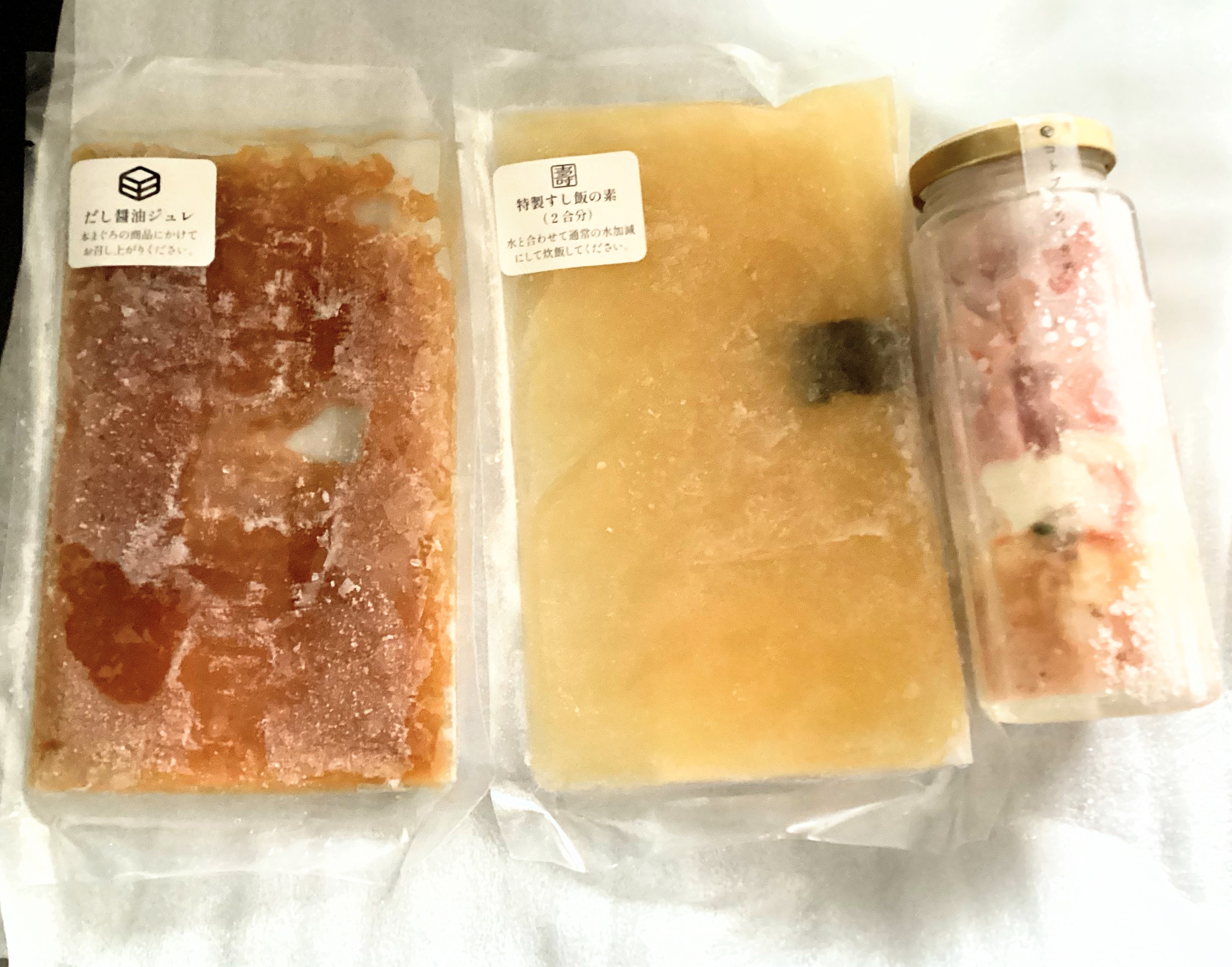 海鮮丼の具は1時間半で、すし飯の素と和だしジュレは10分で解凍できます。