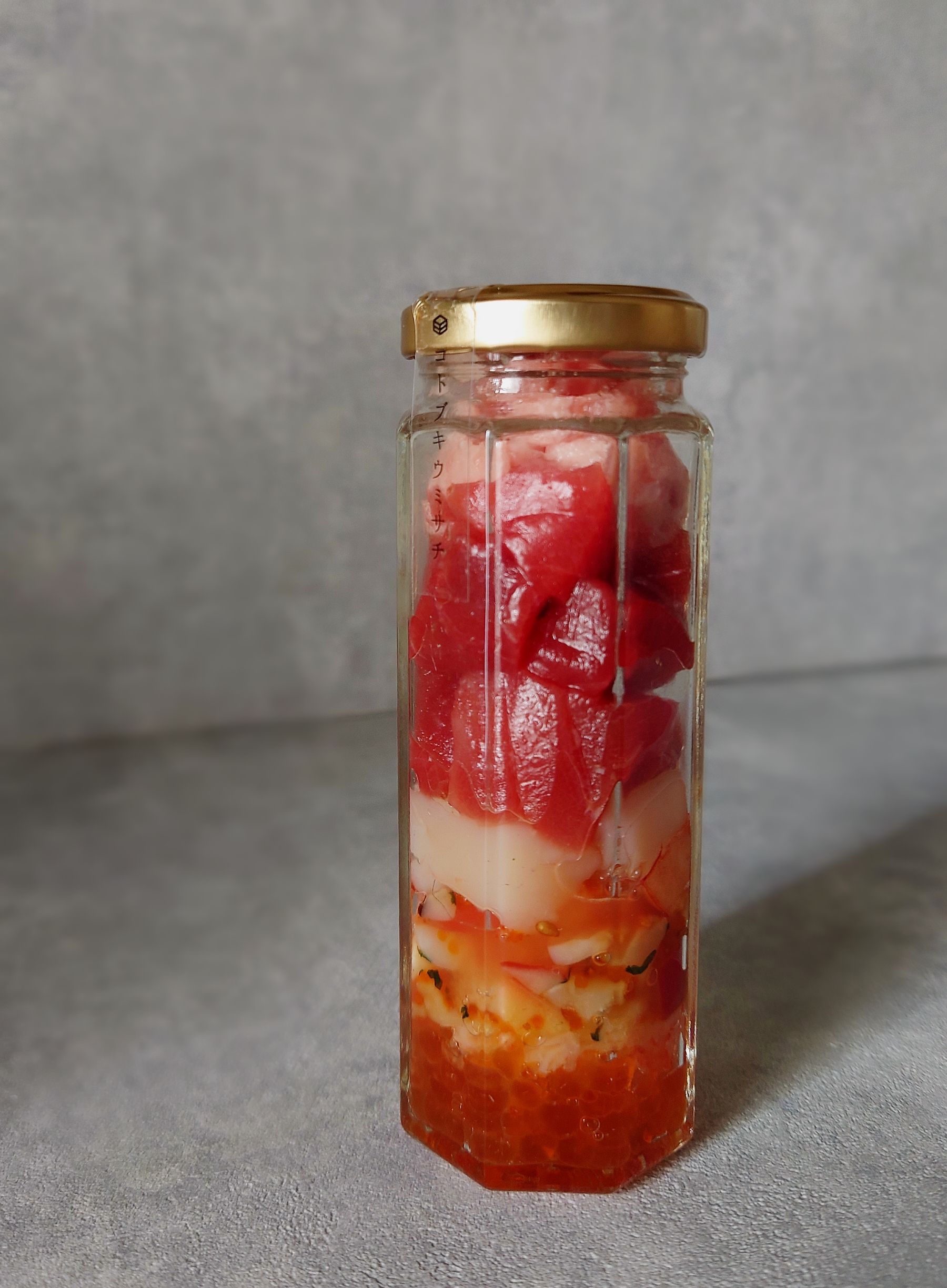 美しいガラス瓶に、一人前ずつ丁寧に盛りつけられ、スイーツのように層を織りなす海の幸。瓶を手に取り、だし酢の香るすし飯にゴロゴロと海の幸をのせてゆき、最後にキラキラの和だしジュレをドロリ。