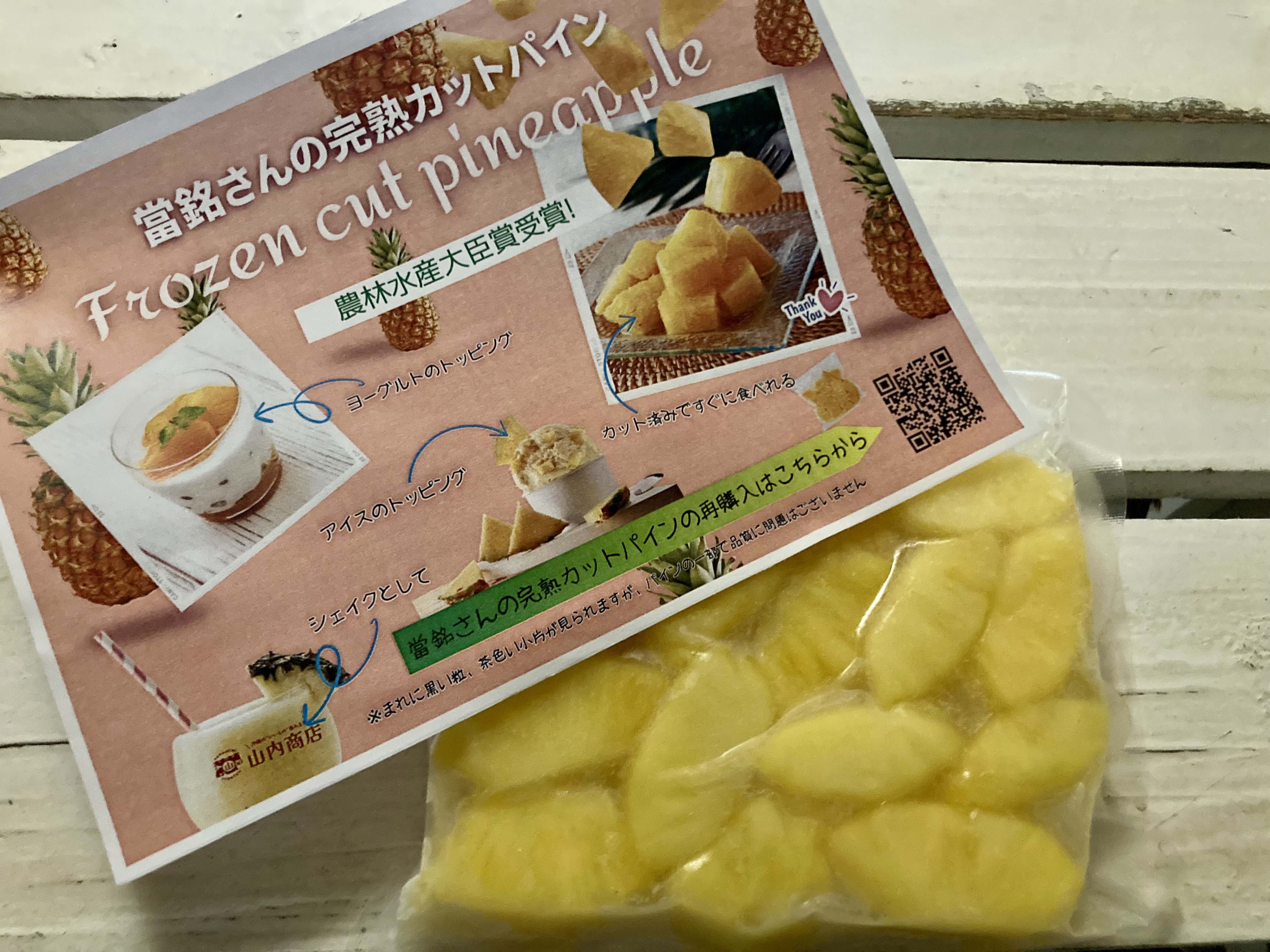 農林水産大臣賞を受賞した、沖縄県石垣島のパイナップル農家 當銘(とうめ)氏が作ったティダパインだけを使用した「完熟カットパイン」です。国内で流通するパイナップルの95%以上が輸入物である状況の中で、希少な国内産です。ティダパインは、酸味が少なく甘い、ジューシーで上品な香りが特長。完熟の状態で収穫し、石垣島内で加工しているので、甘みや香りはそのままに鮮度を保った状態で商品になっています。カット済みなので、案外面倒なカットが不要。賞味期限は加工から2年と長く、冷凍保存可能なので、ストック食材としてもおすすめです。