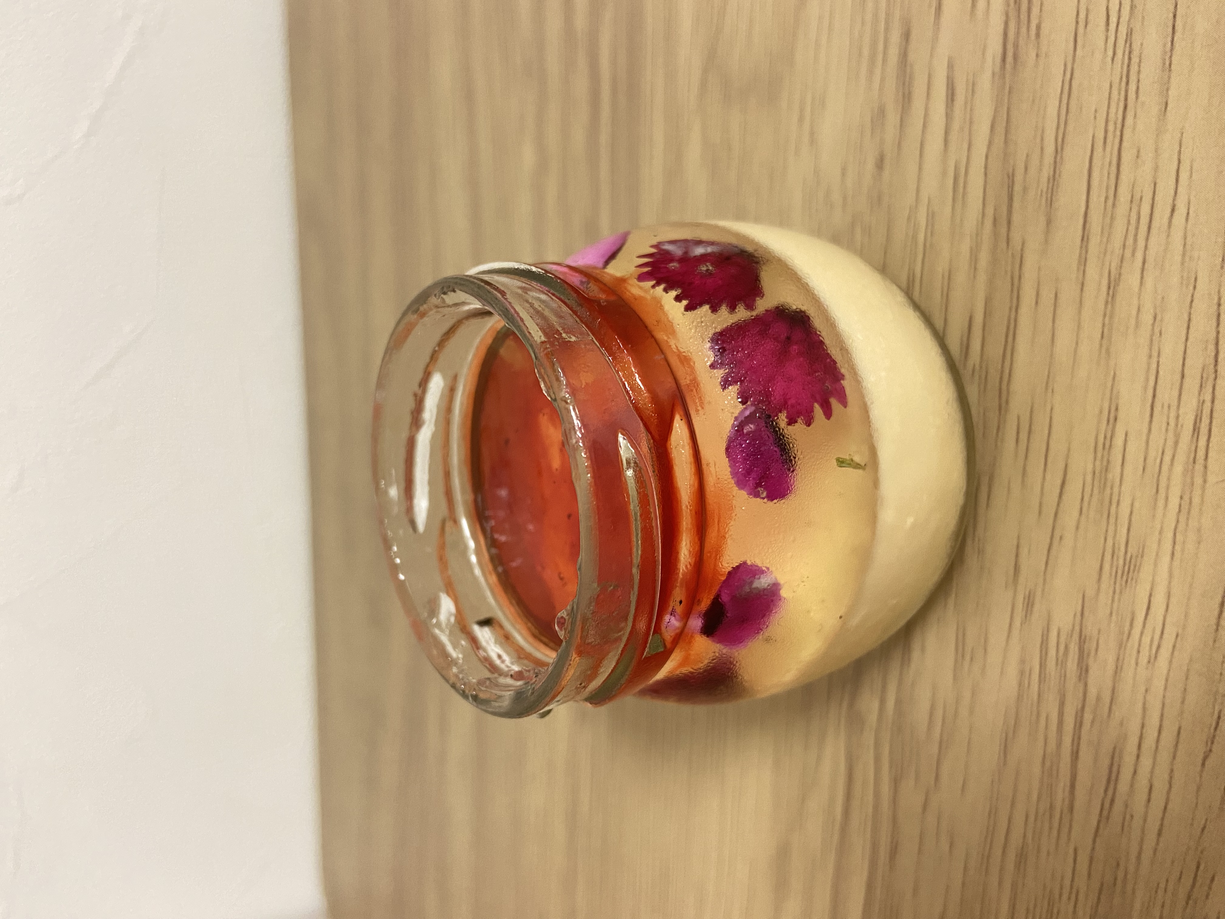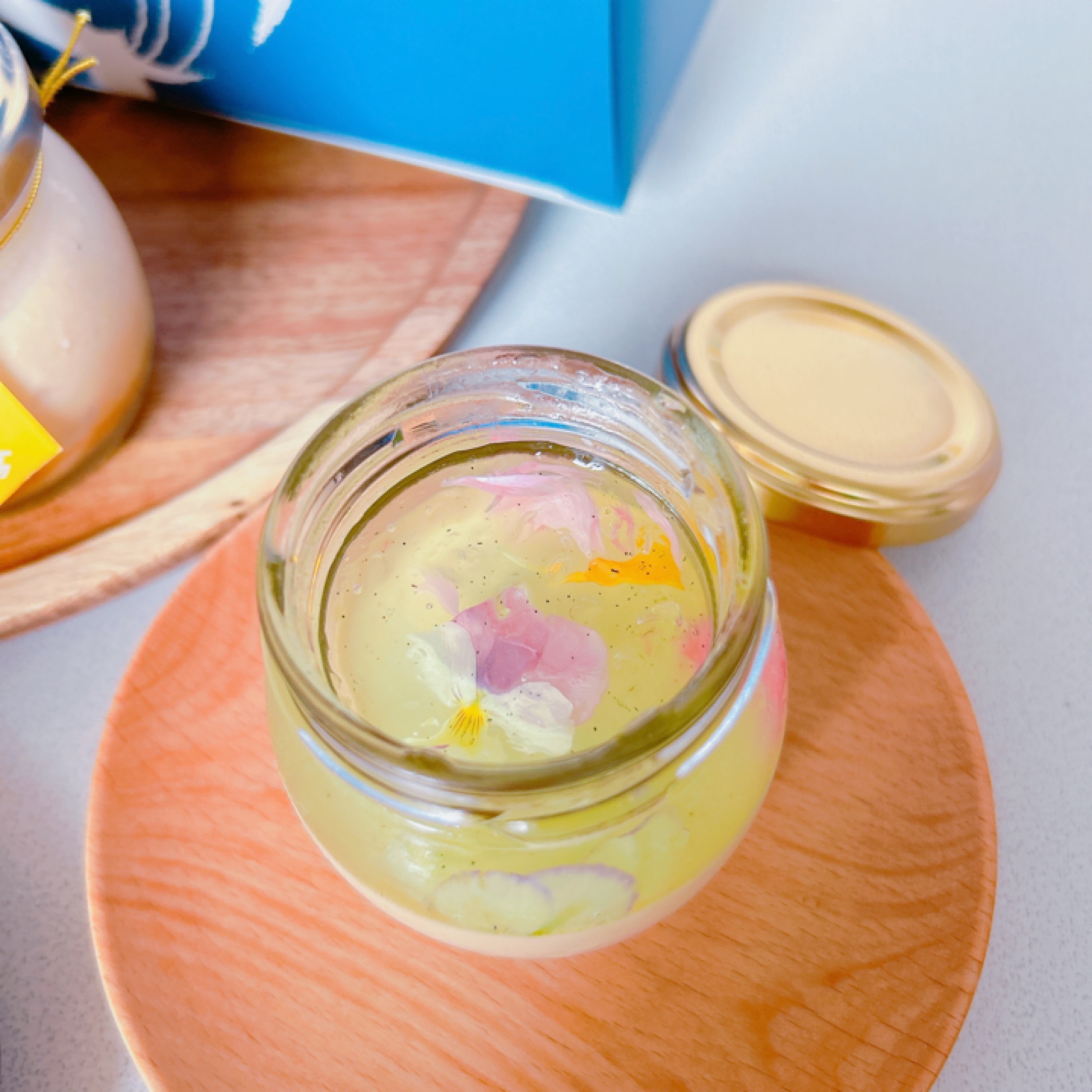 香りを楽しみながら、見た目だけでなく味覚でも楽しめるお花のプリンです。敷き詰めたなめらかでとろけるプリンと一緒に食べると、口に広がるお花の香りと、優しい甘さの中にもサッパリとしたジュレの味わい。特別な一日に添えたいスイーツです。