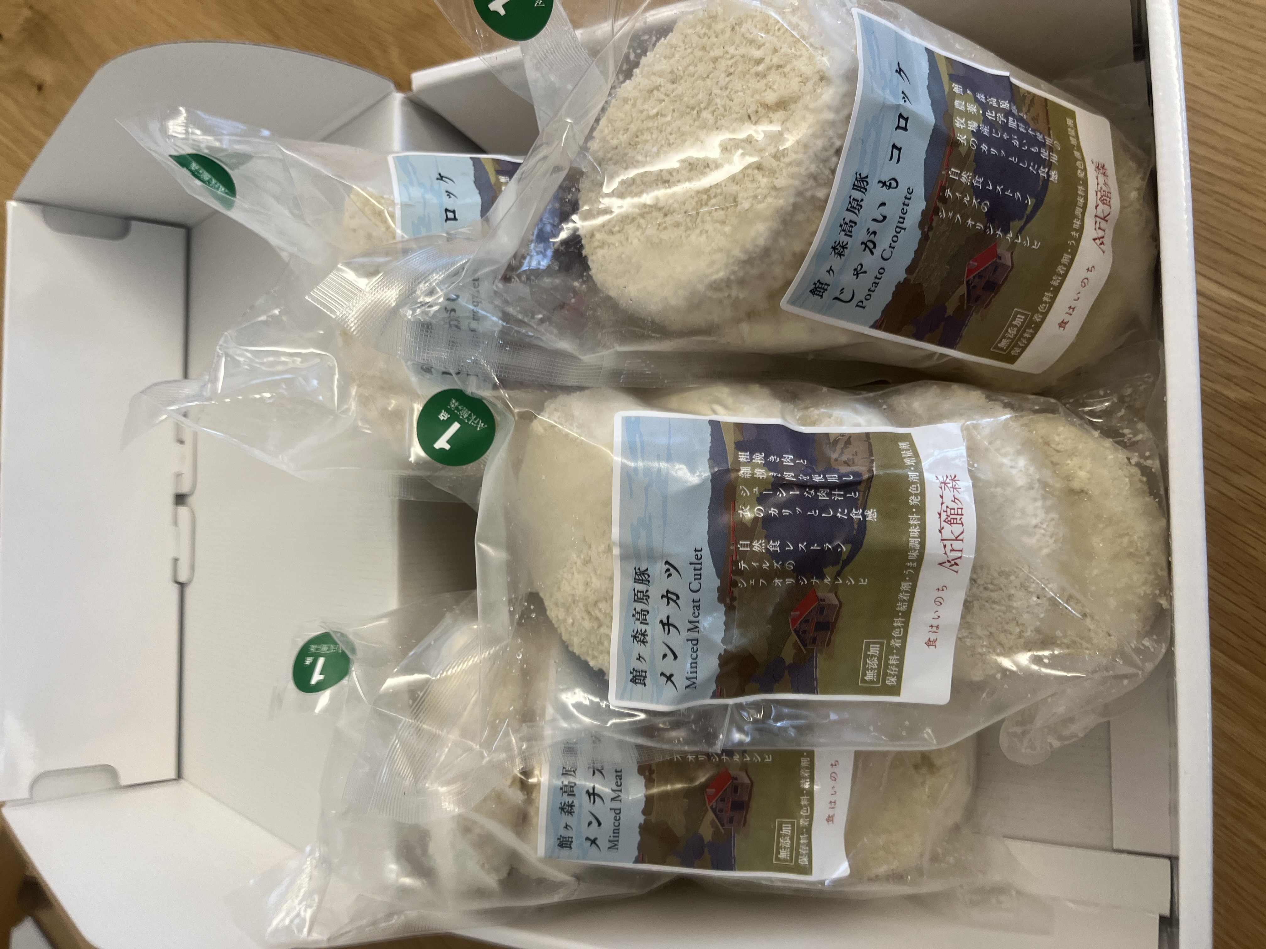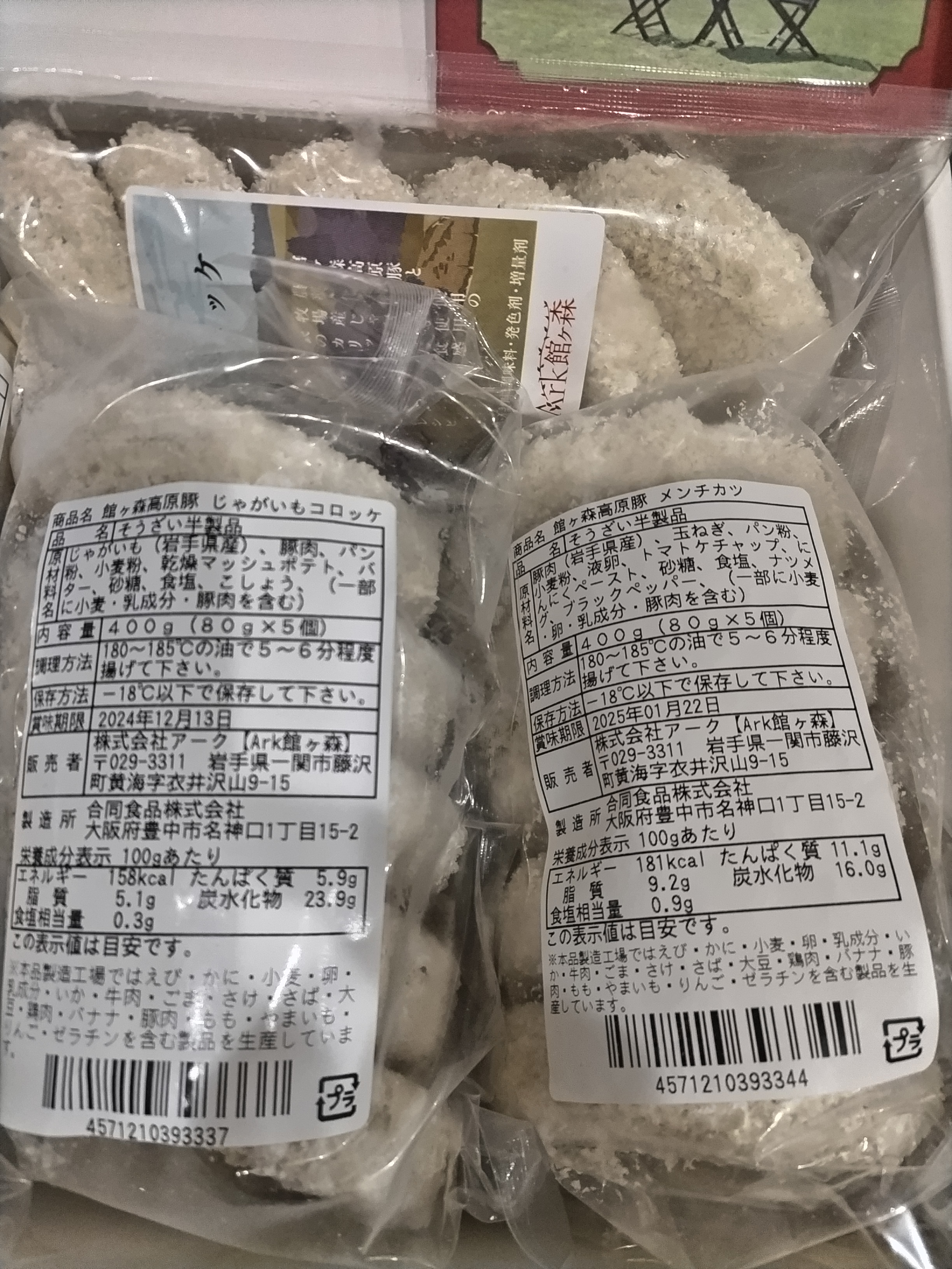 原材料:じゃがいも(岩手県産)、館ヶ森高原豚、パン粉、小麦粉、乾燥マッシュポテト、バター、砂糖、食塩、コショウ、(一部に小麦・乳成分・豚肉を含む)