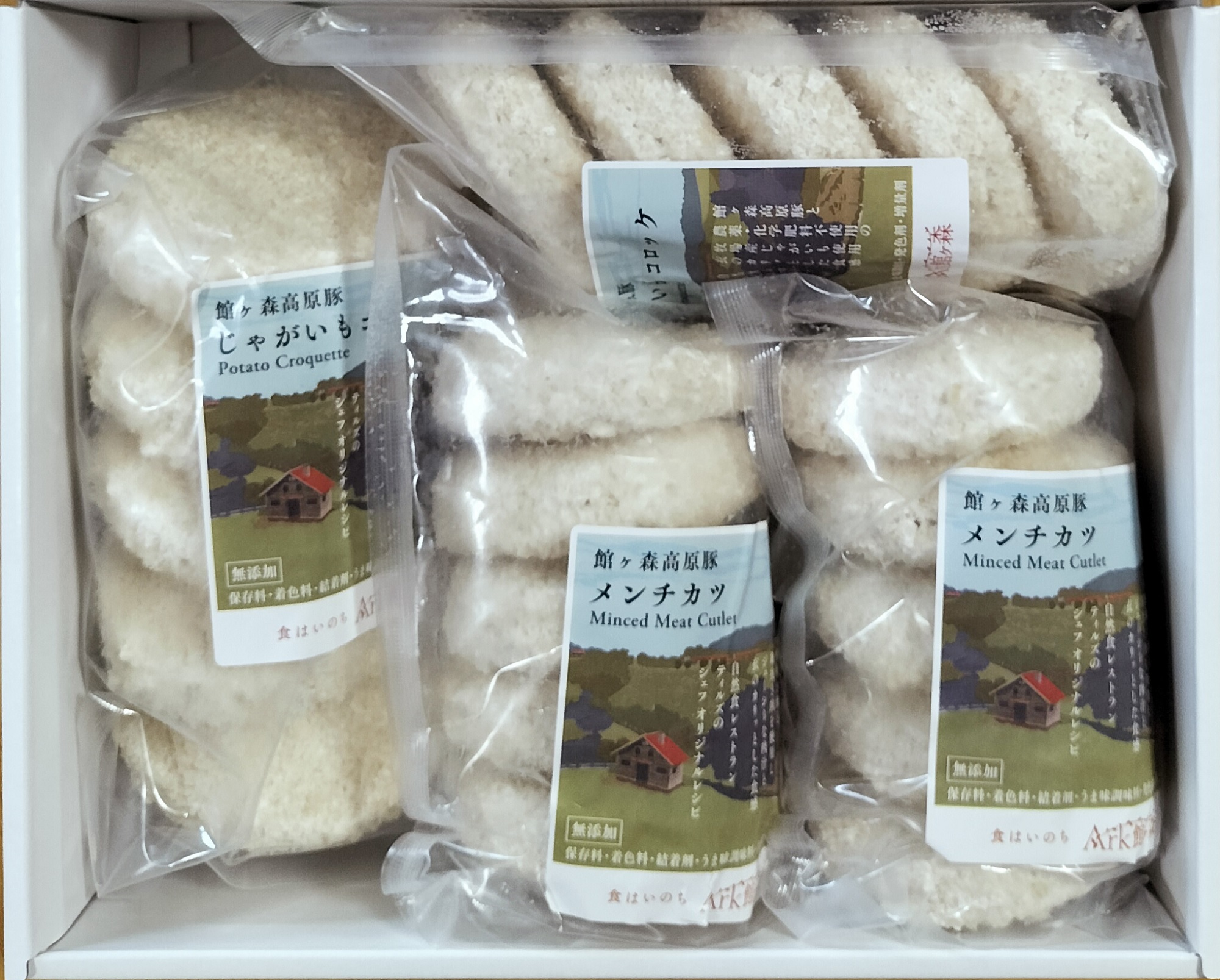 館ヶ森高原豚の挽肉と牧場産農薬不使用のじゃがいもを使用した「コロッケ」と、館ヶ森高原豚の挽肉をふんだんに使った「メンチカツ」のセットです。保存料や化学調味料などの食品添加物を加えずに自然な味わいに仕上げています。冷凍で届き、賞味期限が未開封時90日もあるので、ストック食材としてもおすすめ。揚げるだけで、本格的な味を自宅で楽しめます。化粧箱入りなので贈り物にもおすすめです。