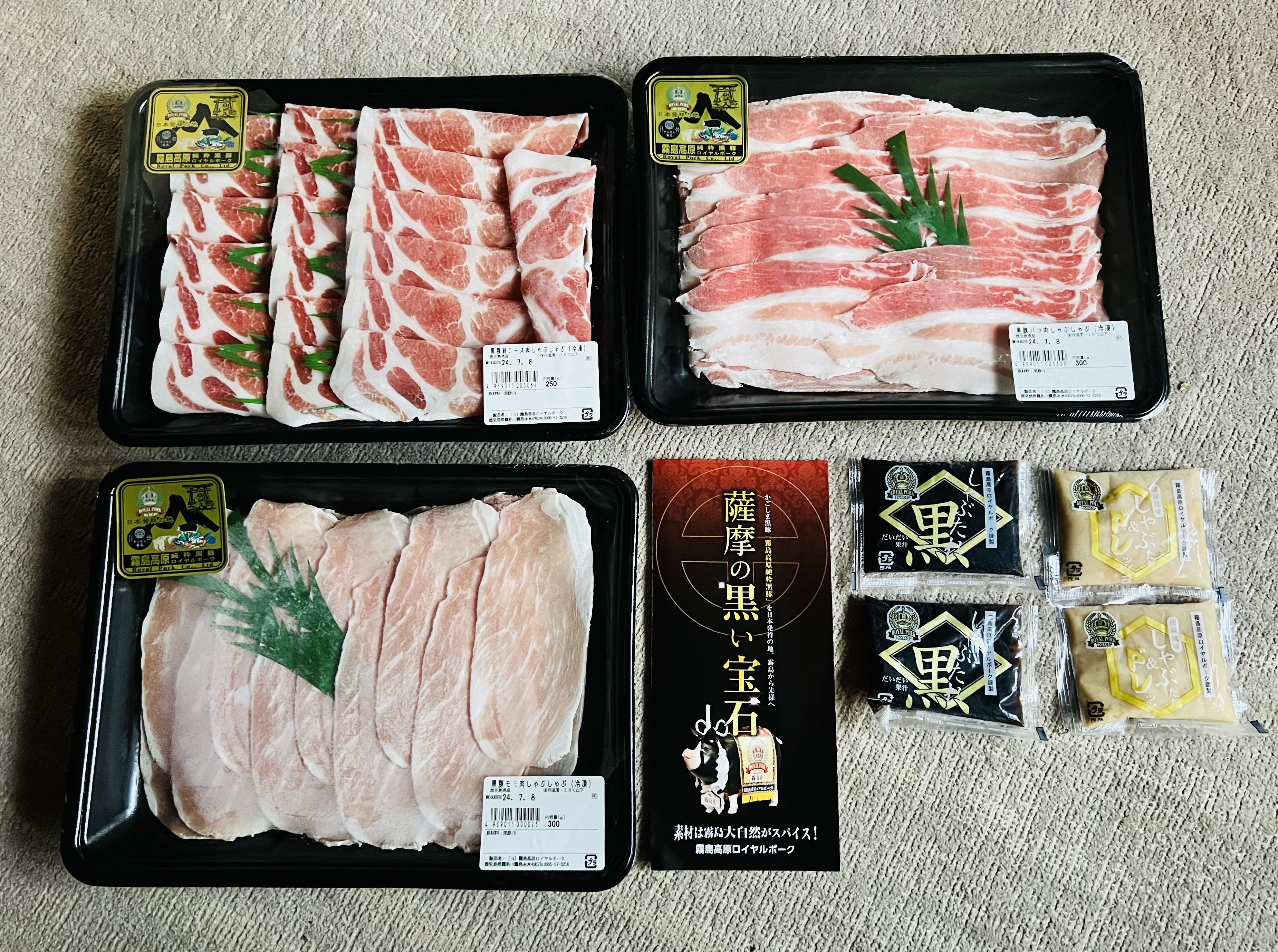 かごしま黒豚ブランド「霧島高原純粋黒豚」の「肩ロース」「モモ」「バラ」のセットです。赤身と脂身が霜降り状になっていて、程よい弾力で歯切れの良い肉質を楽しめる「肩ロース肉」、脂のうまさが秀逸で、噛めば噛むほど旨味が口の中に広がる「バラ肉」、脂身に厚みがあり肉のジューシーさを感じる「ロース肉」の3種。異なる味わいのセットなので食べ比べが楽しめます。相性抜群のタレ2種も一緒に届きます。しゃぶしゃぶも最適な厚さにスライスされた状態で、専用ボックスに入って届くので、贈り物にもおすすめです。