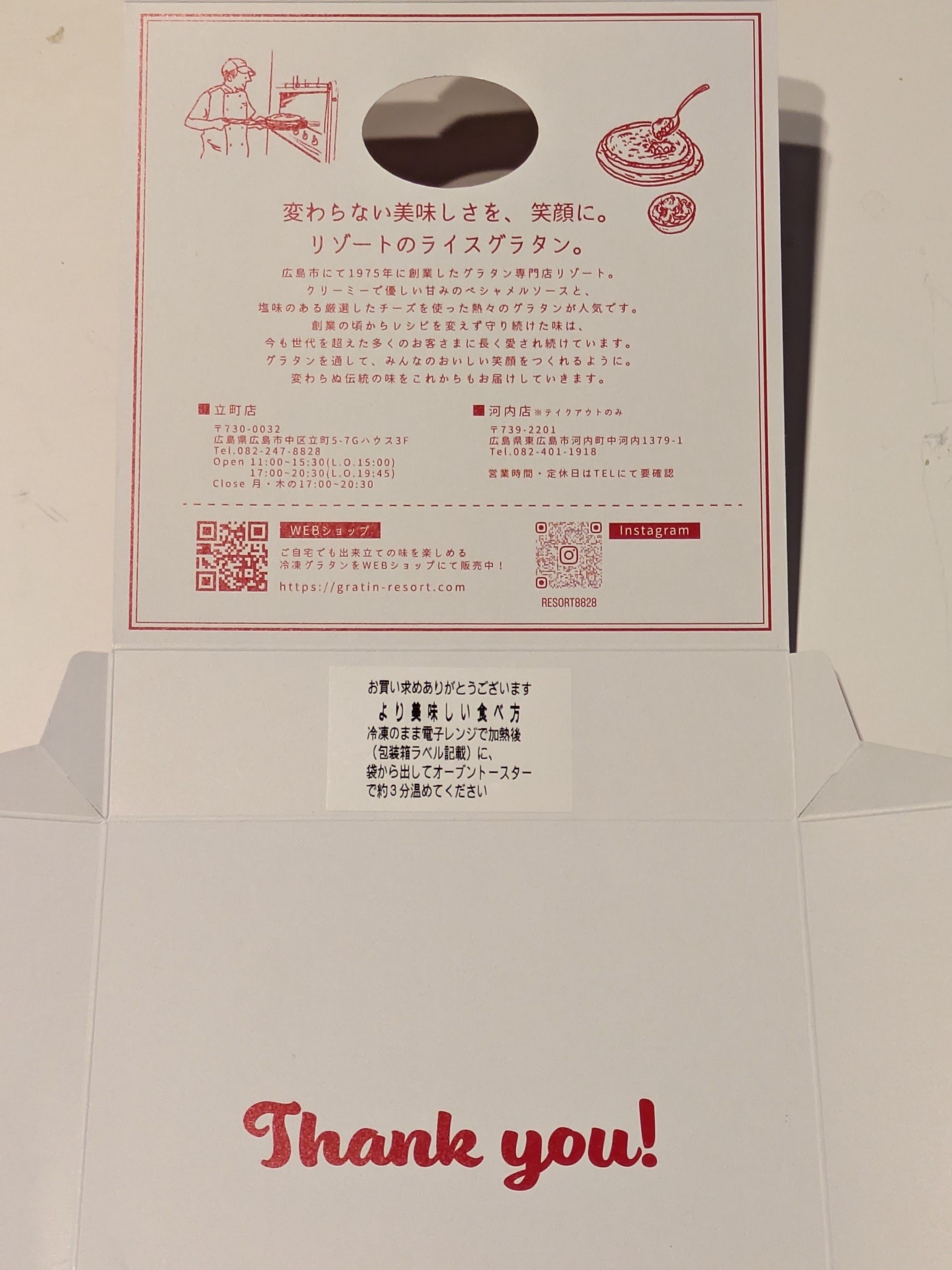 箱の裏側にはお店の案内とこだわりが書かれています。より美味しい食べ方が書いてあるのも良いですね。