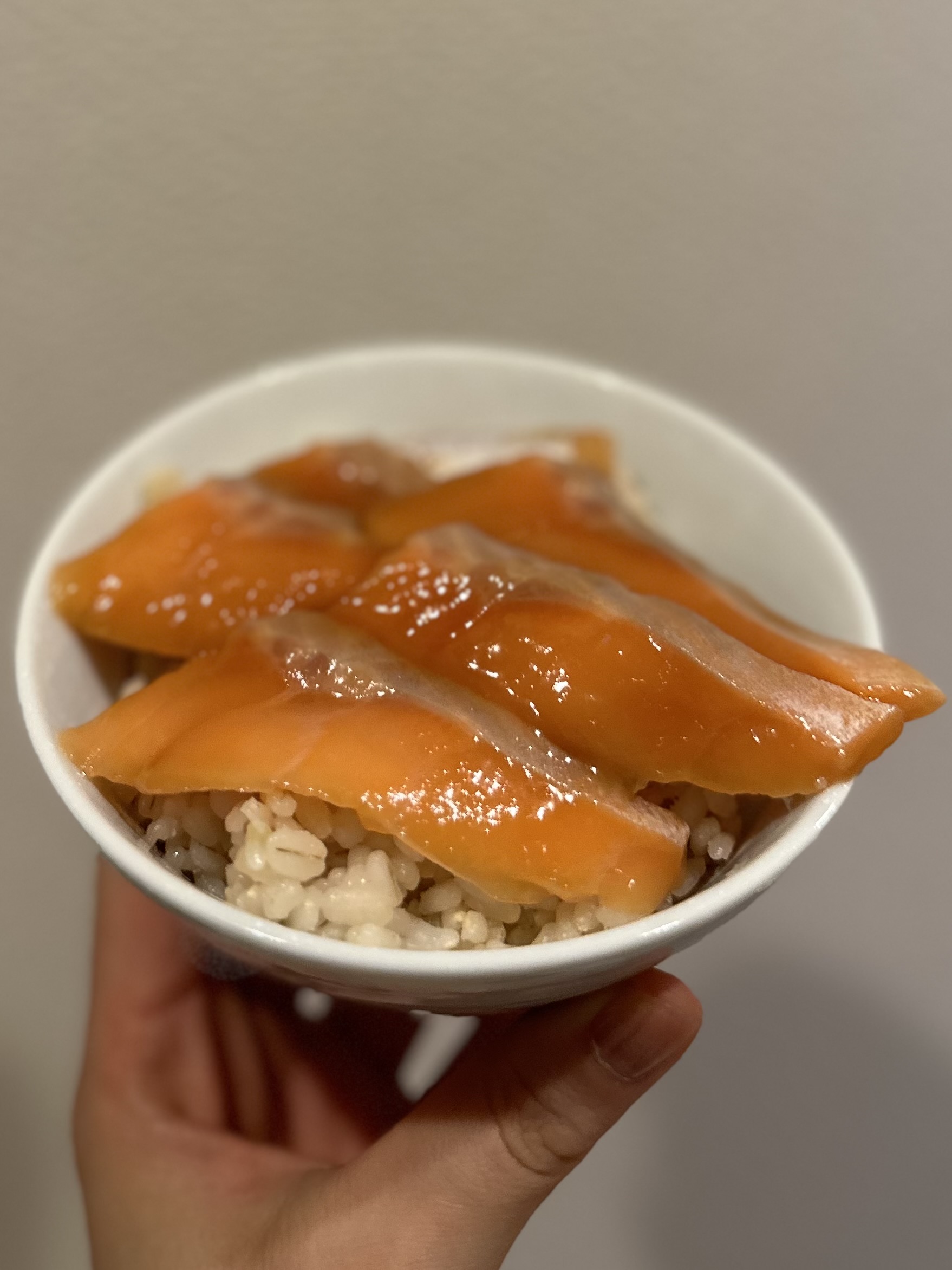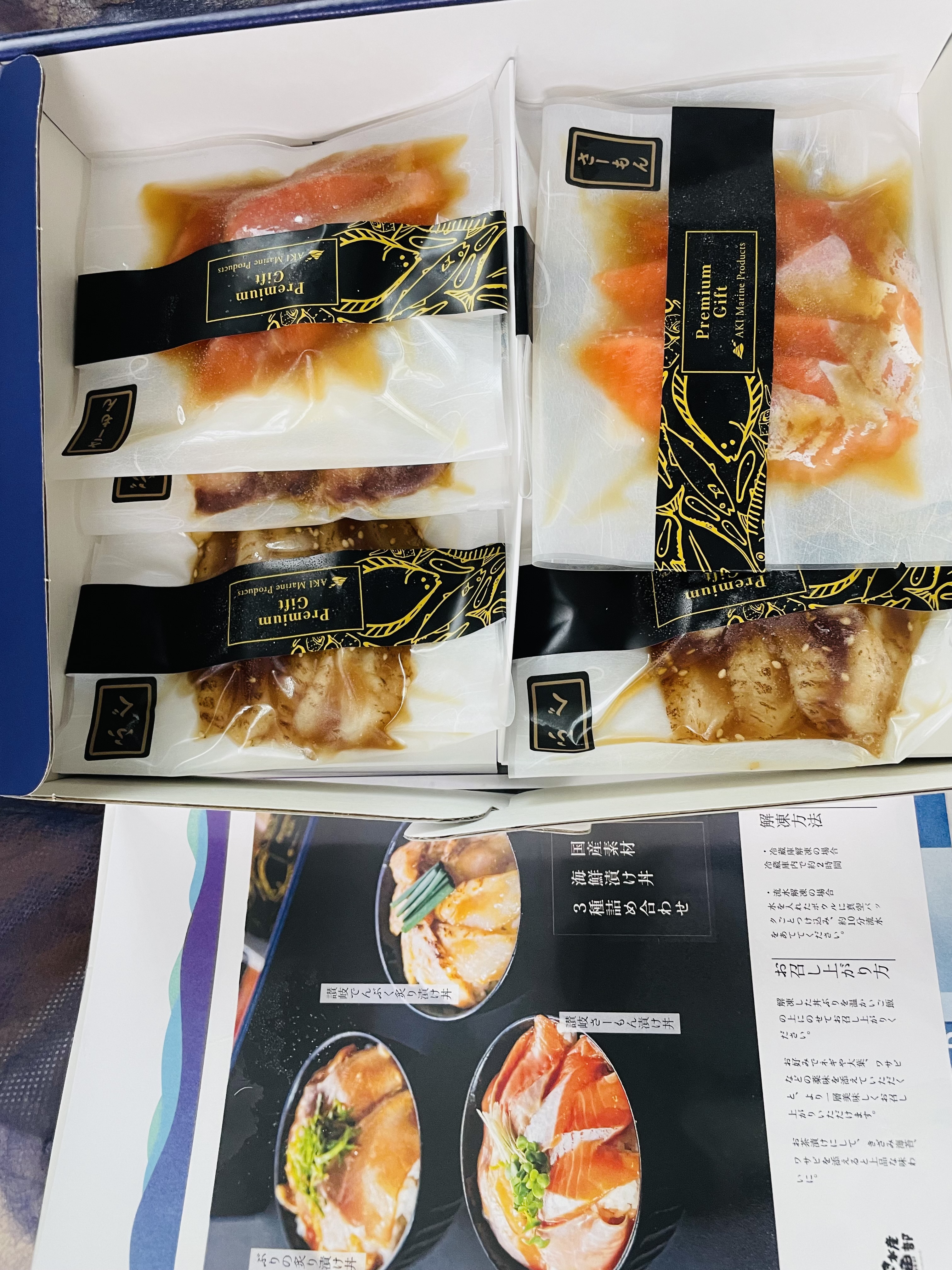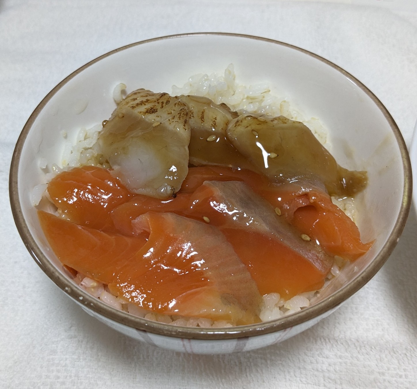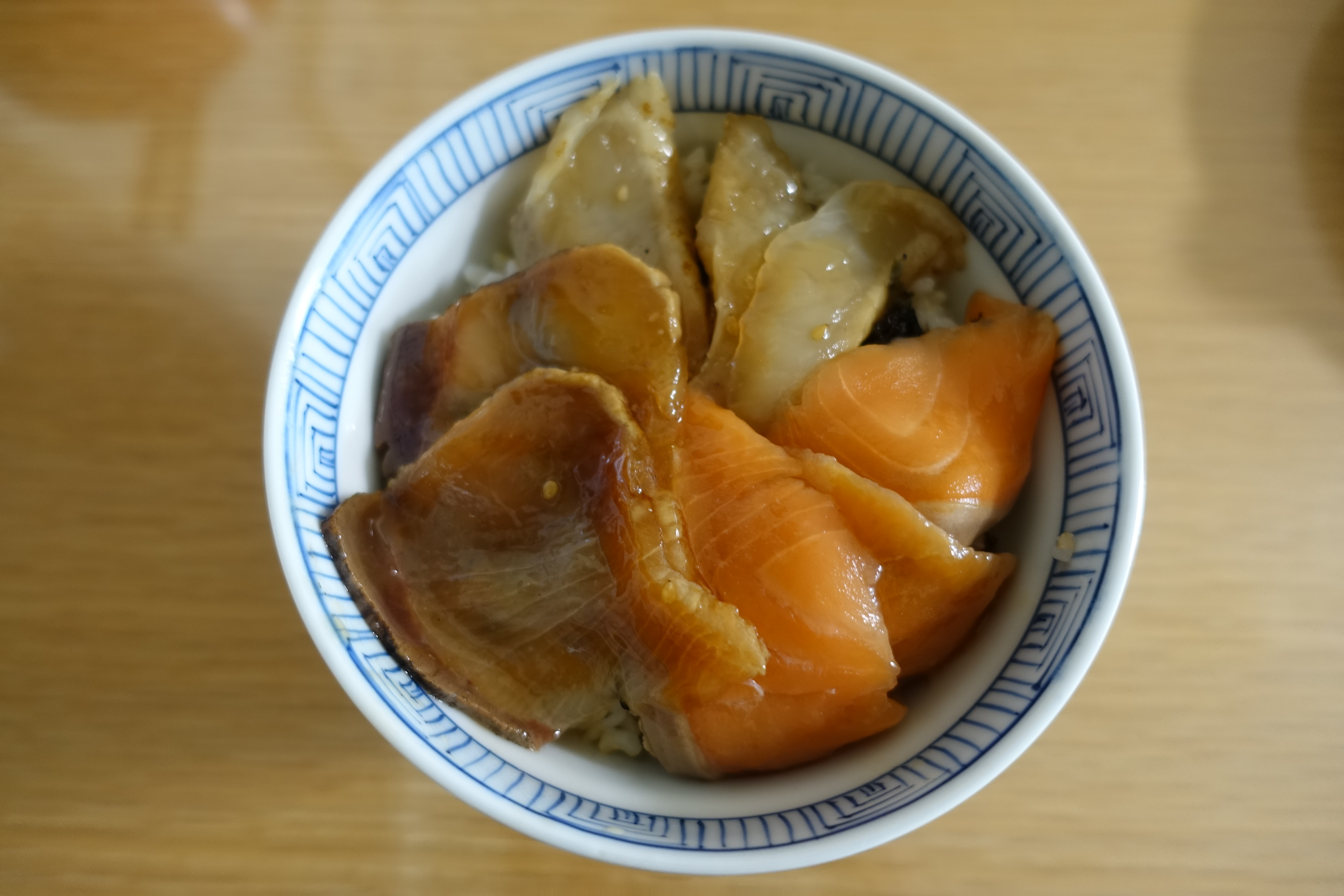 食べる2時間前に冷凍庫から冷蔵庫へ、厚みのあるフグだけ解凍が甘かったので流水に当てましたが、すぐに完全解凍。炊きたての新米に三種を全部乗せにして贅沢漬け丼の完成です。乗っけるだけなので実に楽でした。