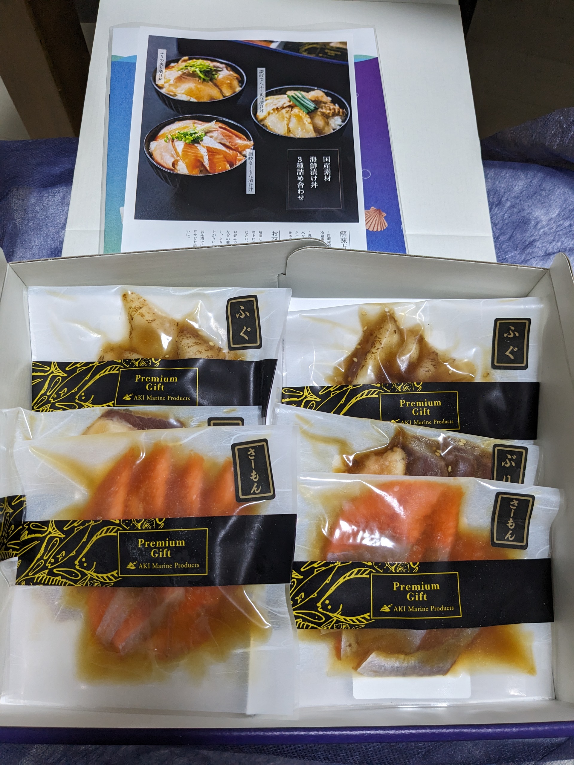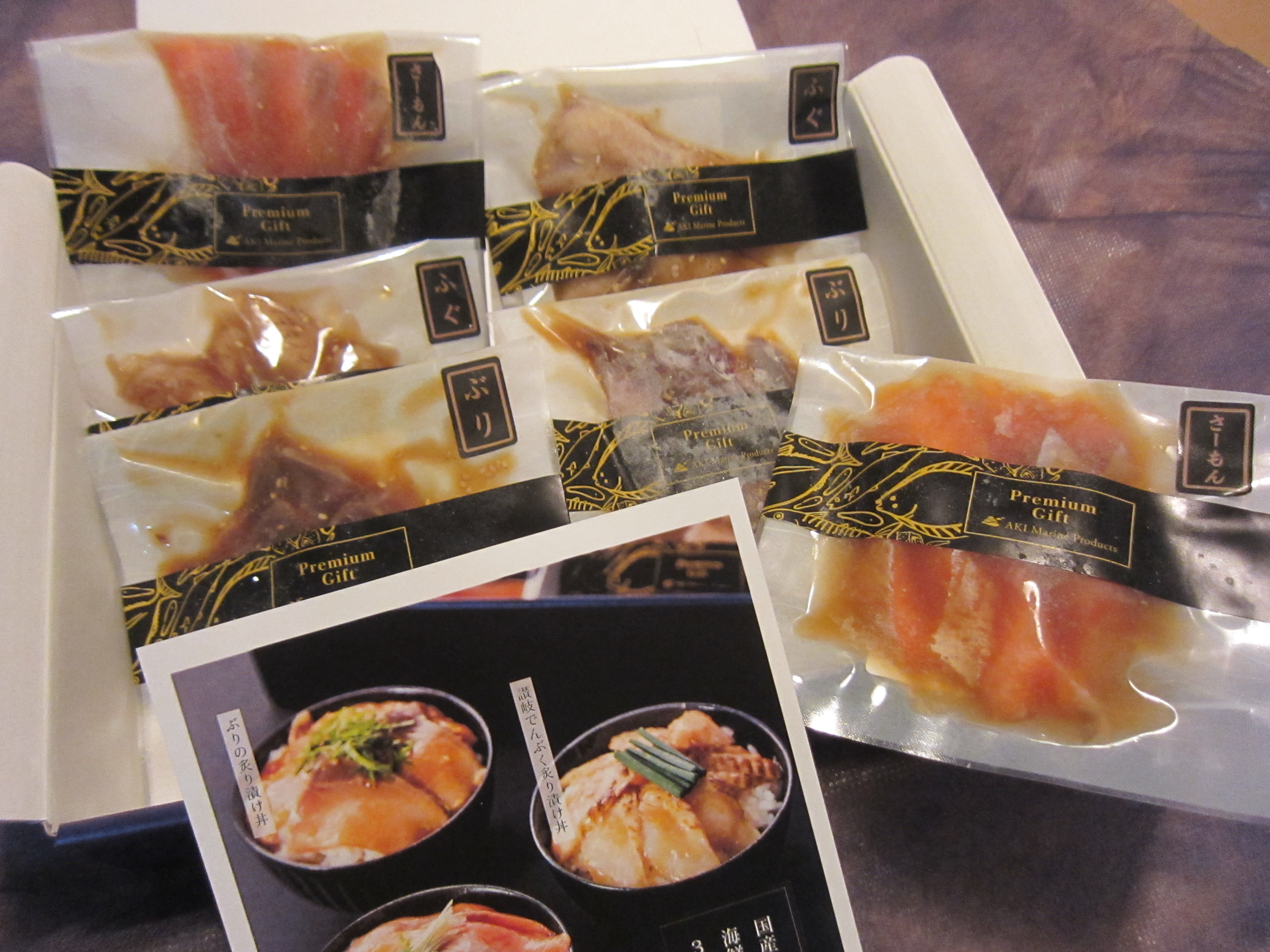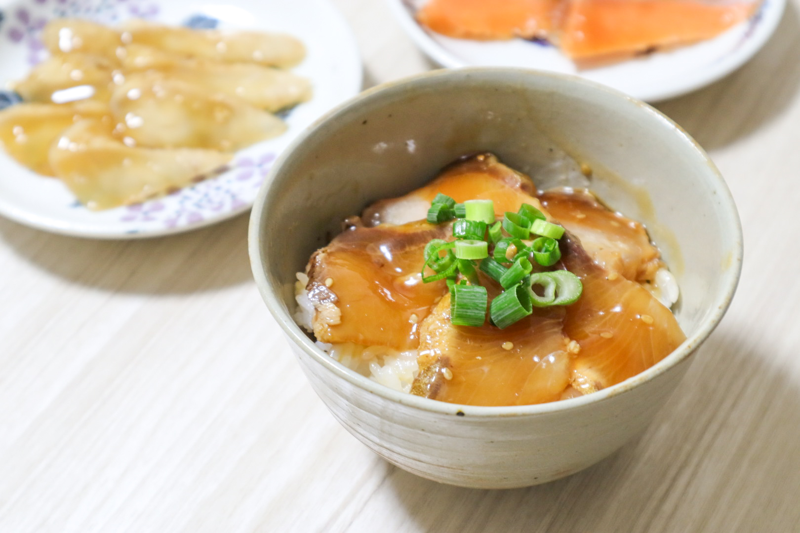 食べる2時間前に冷凍庫から冷蔵庫へ、厚みのあるフグだけ解凍が甘かったので流水に当てましたが、すぐに完全解凍。炊きたての新米に三種を全部乗せにして贅沢漬け丼の完成です。乗っけるだけなので実に楽でした。