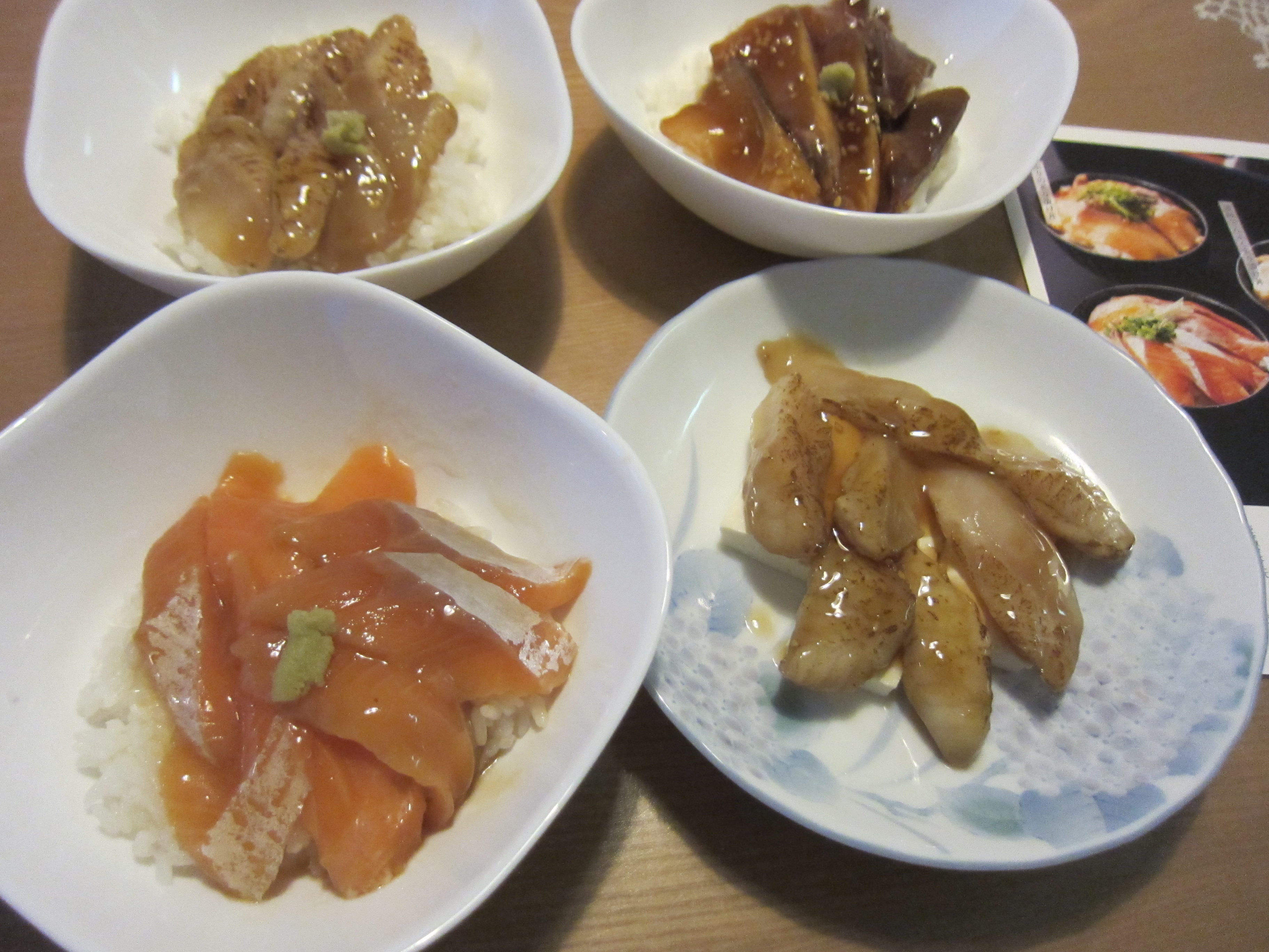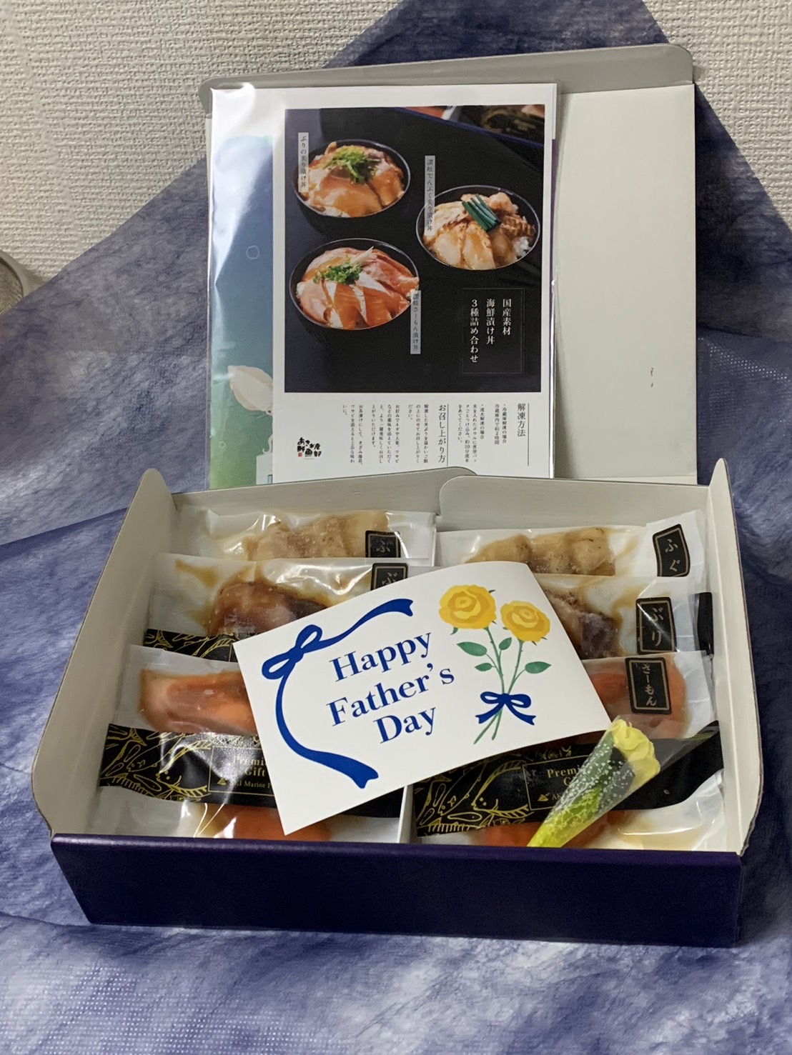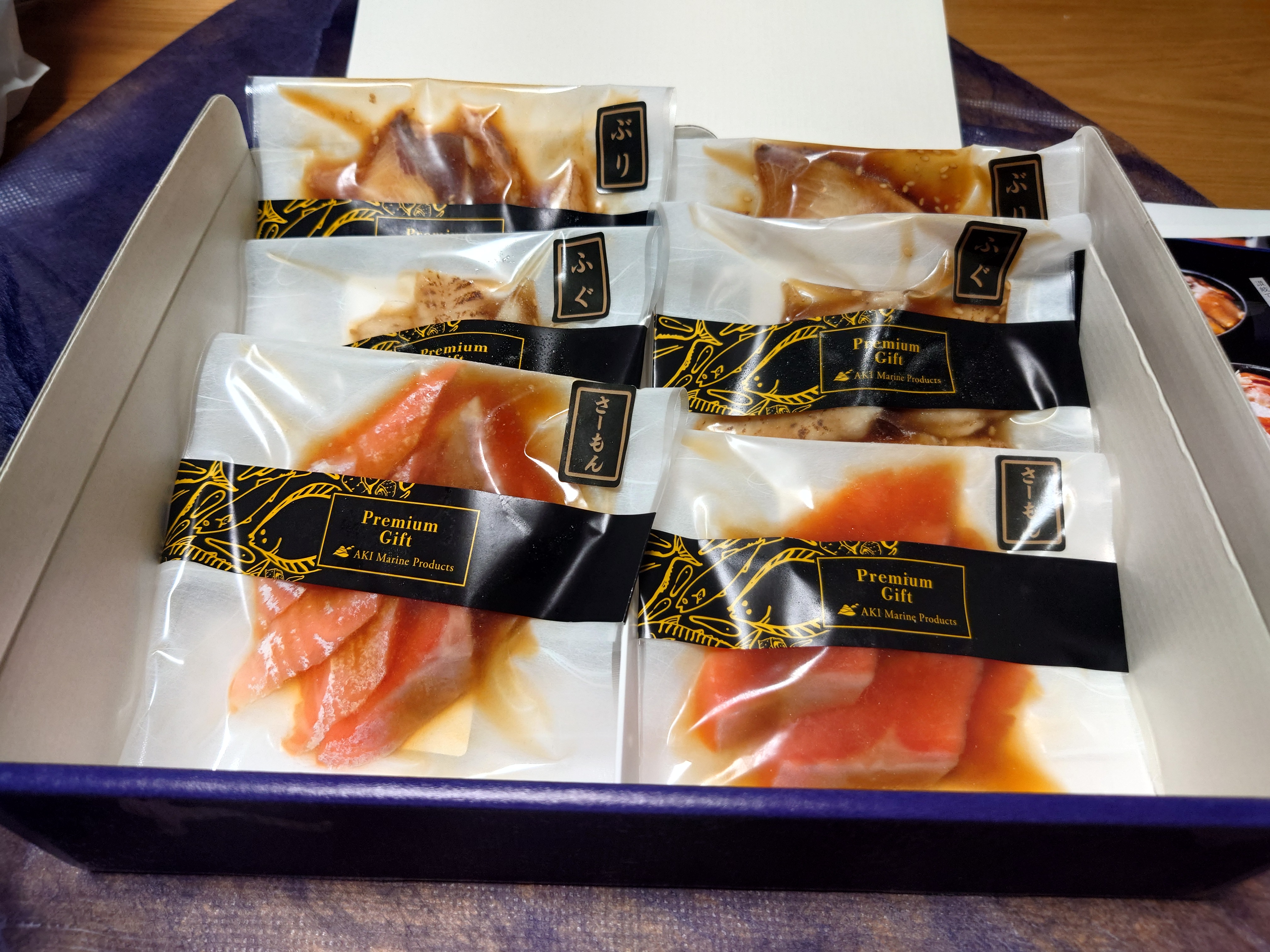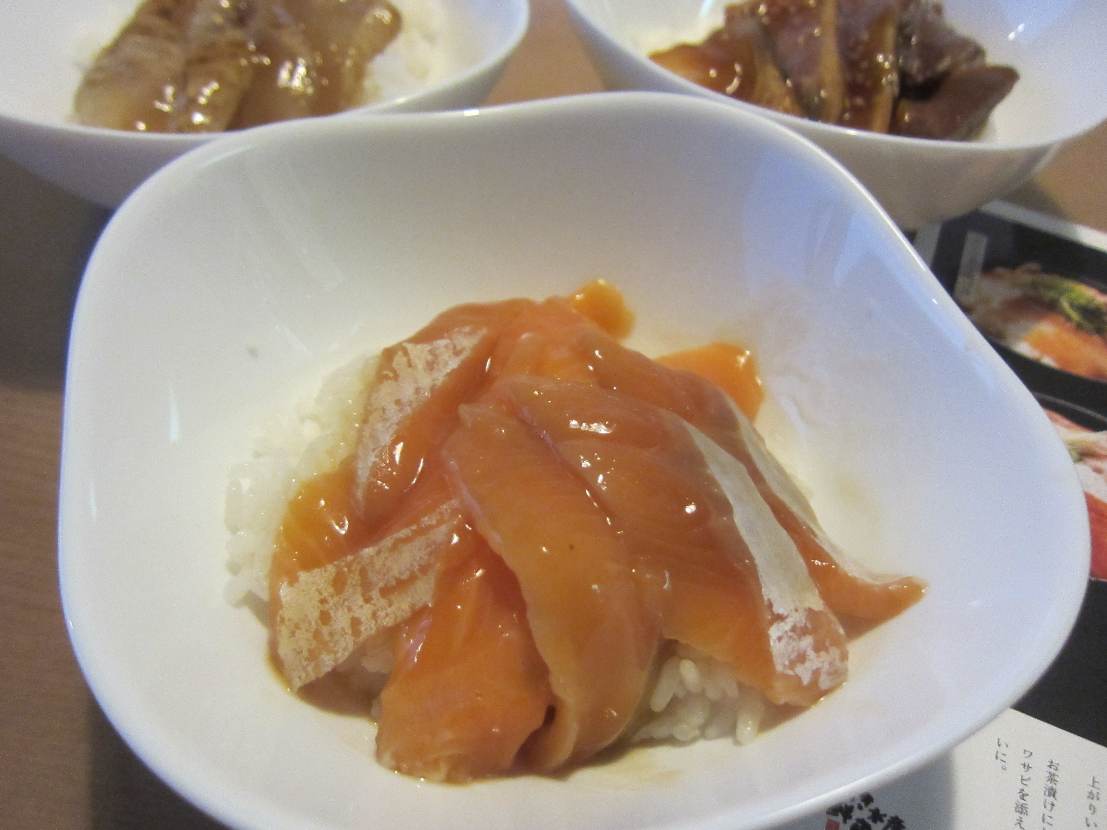 食べる2時間前に冷凍庫から冷蔵庫へ、厚みのあるフグだけ解凍が甘かったので流水に当てましたが、すぐに完全解凍。炊きたての新米に三種を全部乗せにして贅沢漬け丼の完成です。乗っけるだけなので実に楽でした。