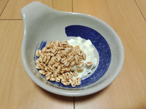 25~30gのもち麦ぽんに、牛乳・豆乳・オーツミルク・ヨーグルトなどをお好みの量を入れてお召し上がりください。もち麦ぽんはとっても柔らかいので、少なめの量でもお口の中で馴染みます。
