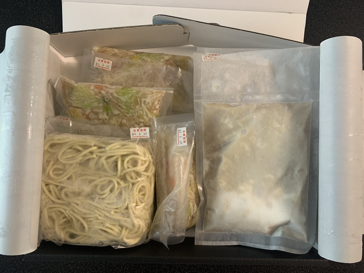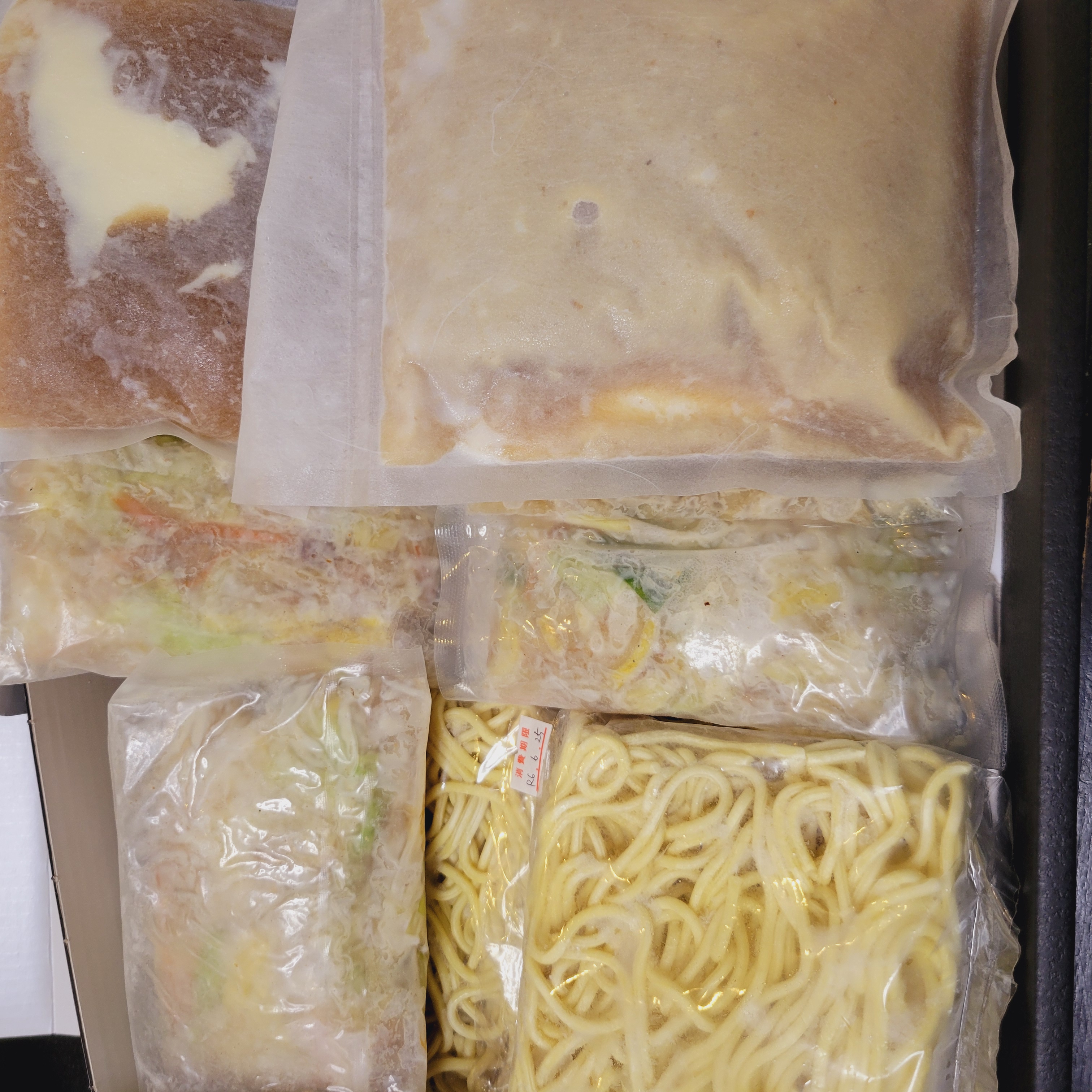 中身を確認し、写真を撮った後すぐに、カチカチに凍った麺、スープ、具材は、冷凍庫に入れました。