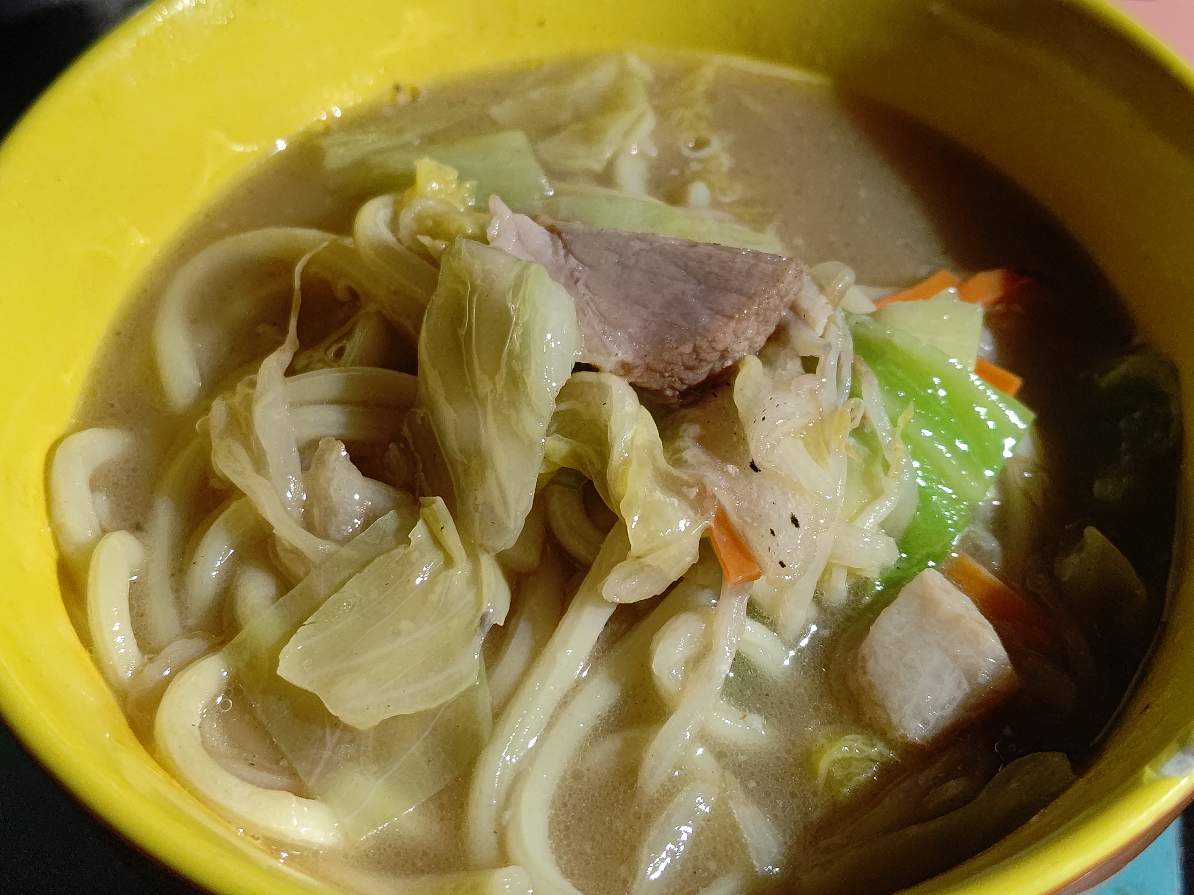 しっかり煮込んだ状態の具材が、茹でる前の麺の3分の2ほどある感じでしたから、調理前の具材は、間違いなく麺の量を超えています♪