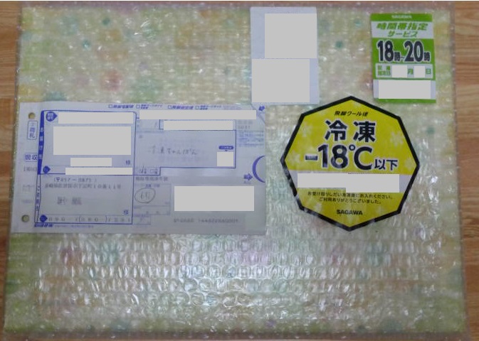 予定日時通り、「佐川急便」の「飛脚クール便冷凍-18℃以下」で届きました。