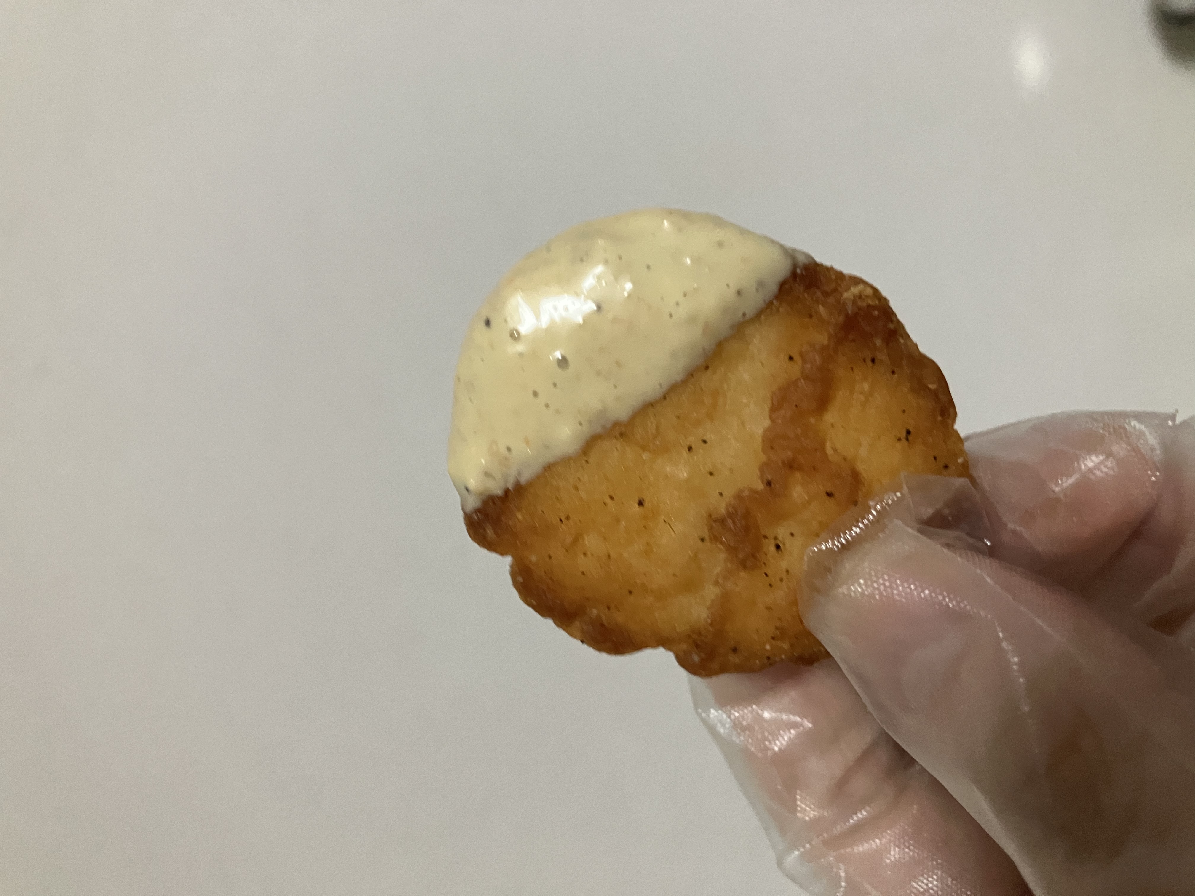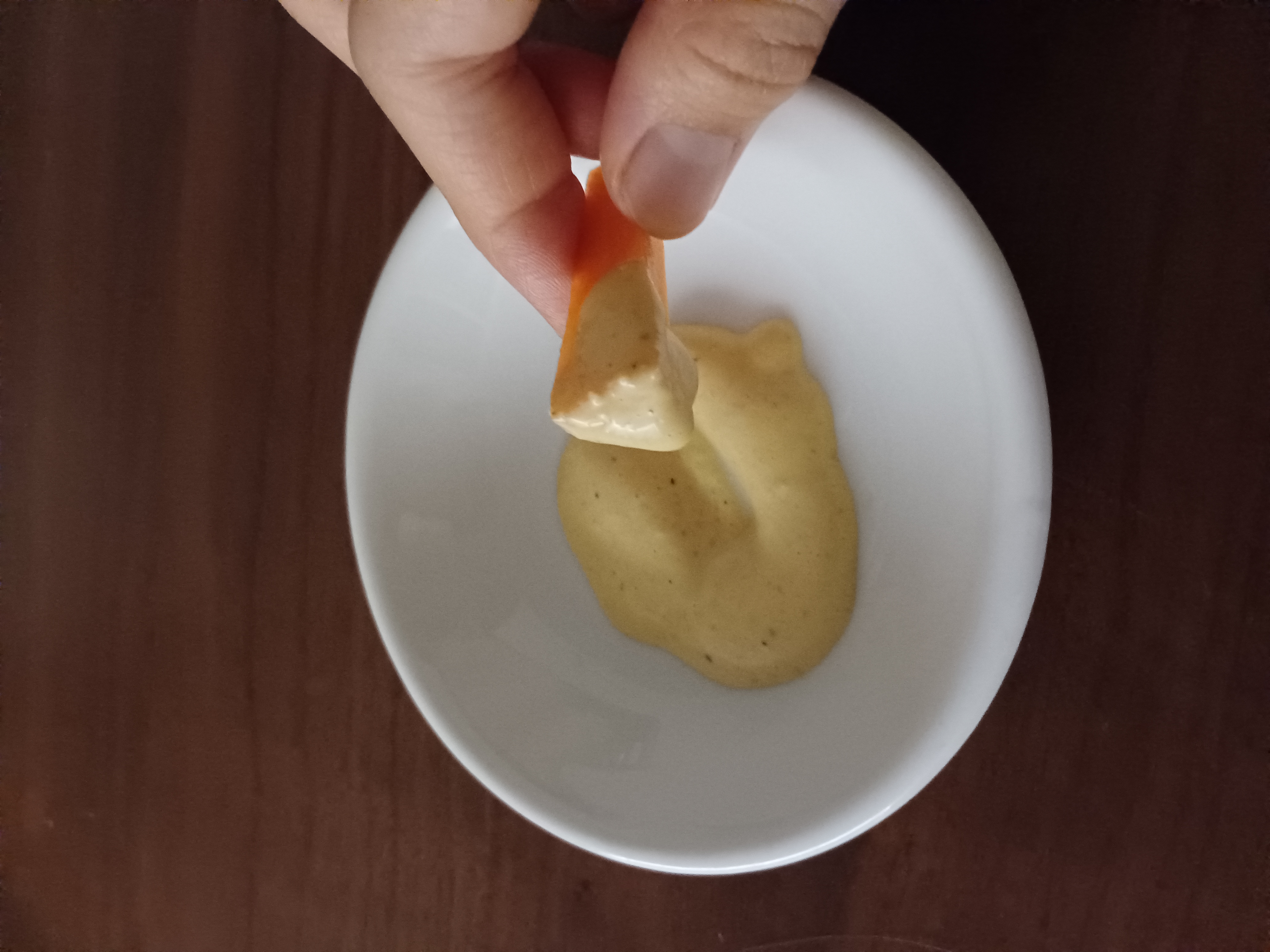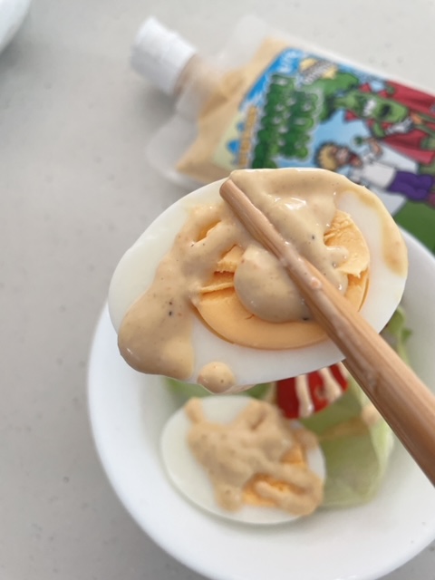 原材料を見るとベースはマヨネーズっぽいけど、食べてみるとそれよりヘルシーな雰囲気。酢が入らないのがマヨとは違うところで、それで酸味はナシ。酸味の代わりに国産野菜(玉ねぎ・人参・ニンニク)の甘さとコク、そしてゴマと香辛料をプラスしています。醤油が入っているのも良くて、斬新なようでいてちゃんと親しみやすい味です。これは全世代に好まれそう。