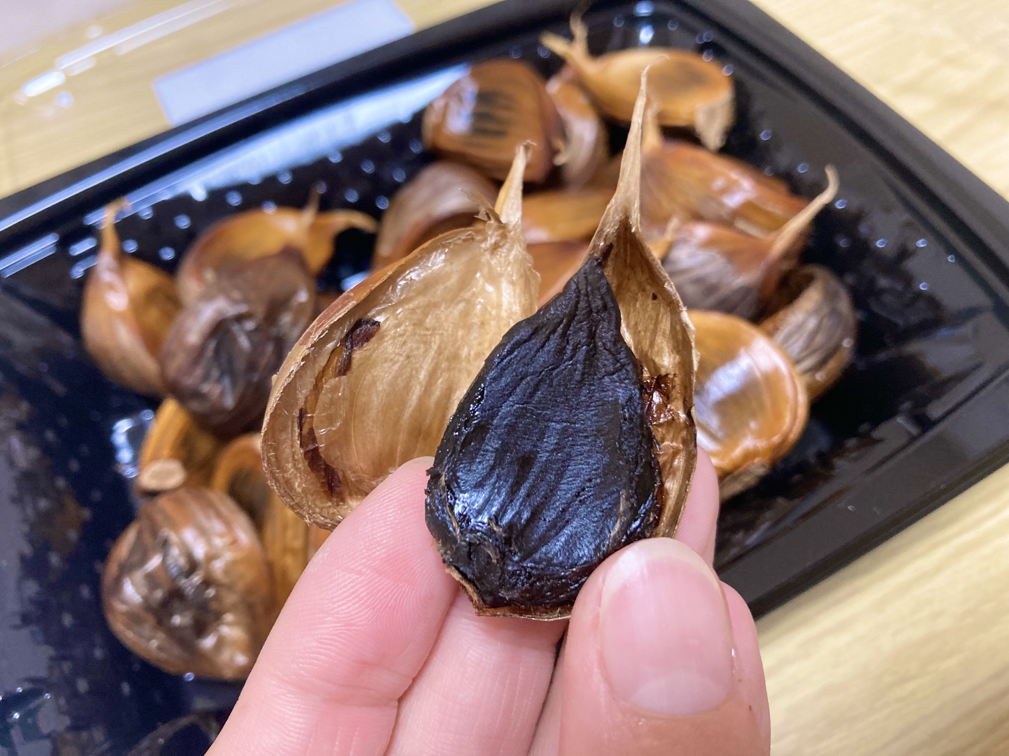 実食をした食感と味わいは、通常流通している白いにんにくは、皮と身とはしっかりと密着しているという感じですが、この黒にんにくは、ぷにぷにとした感触で、口に入れた瞬間にとろけるような食感が広がりました。