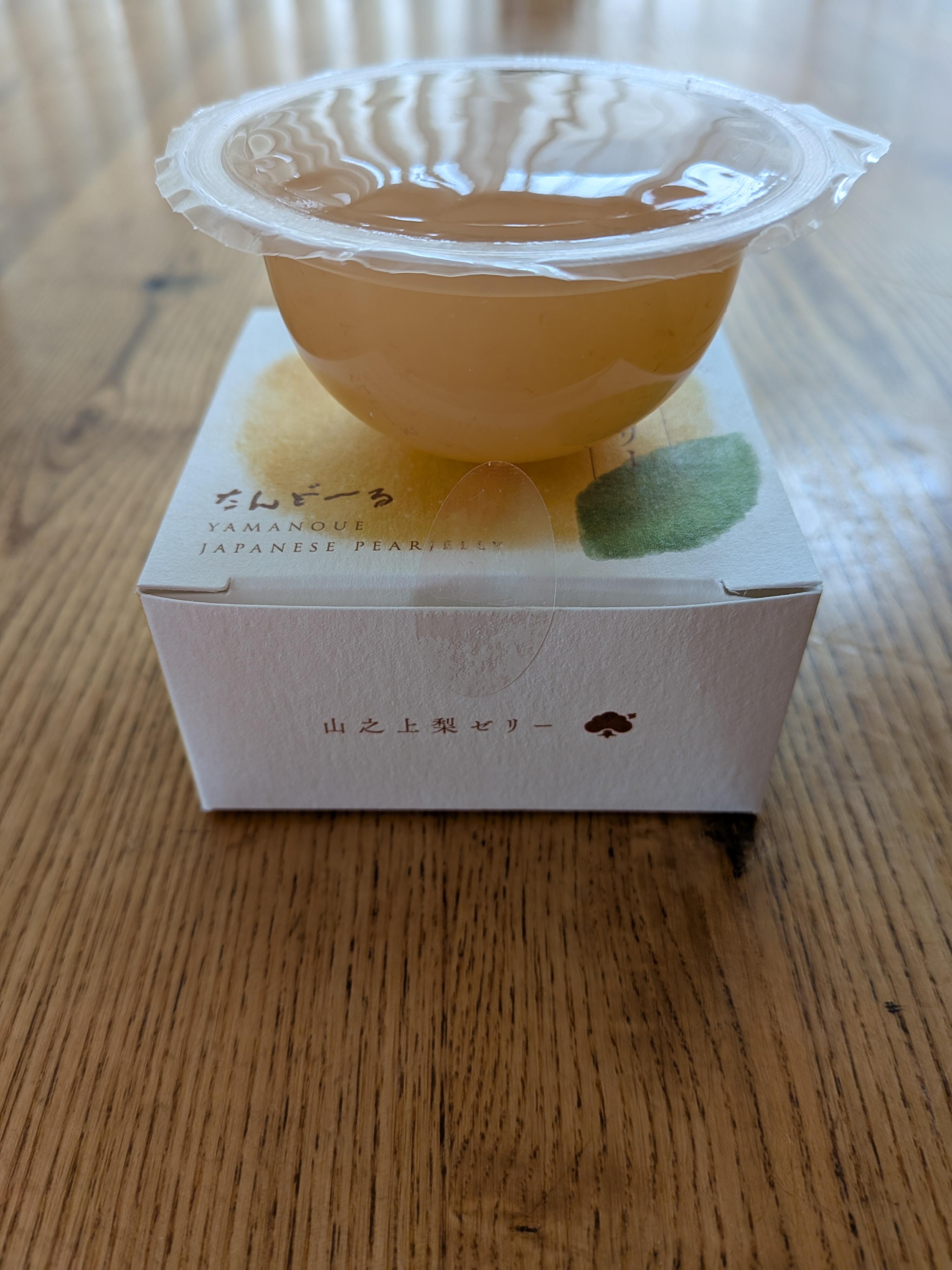 冷蔵したものは、よくあるゼリーのぷるんとした感じではなく、すりおろした梨をジュレにして固めたって感じでした。しかも、いい意味で梨を食べた時に口の中に残るようなザラつきあってゼリーなのにジューシーな梨を食べているような感覚になりました。