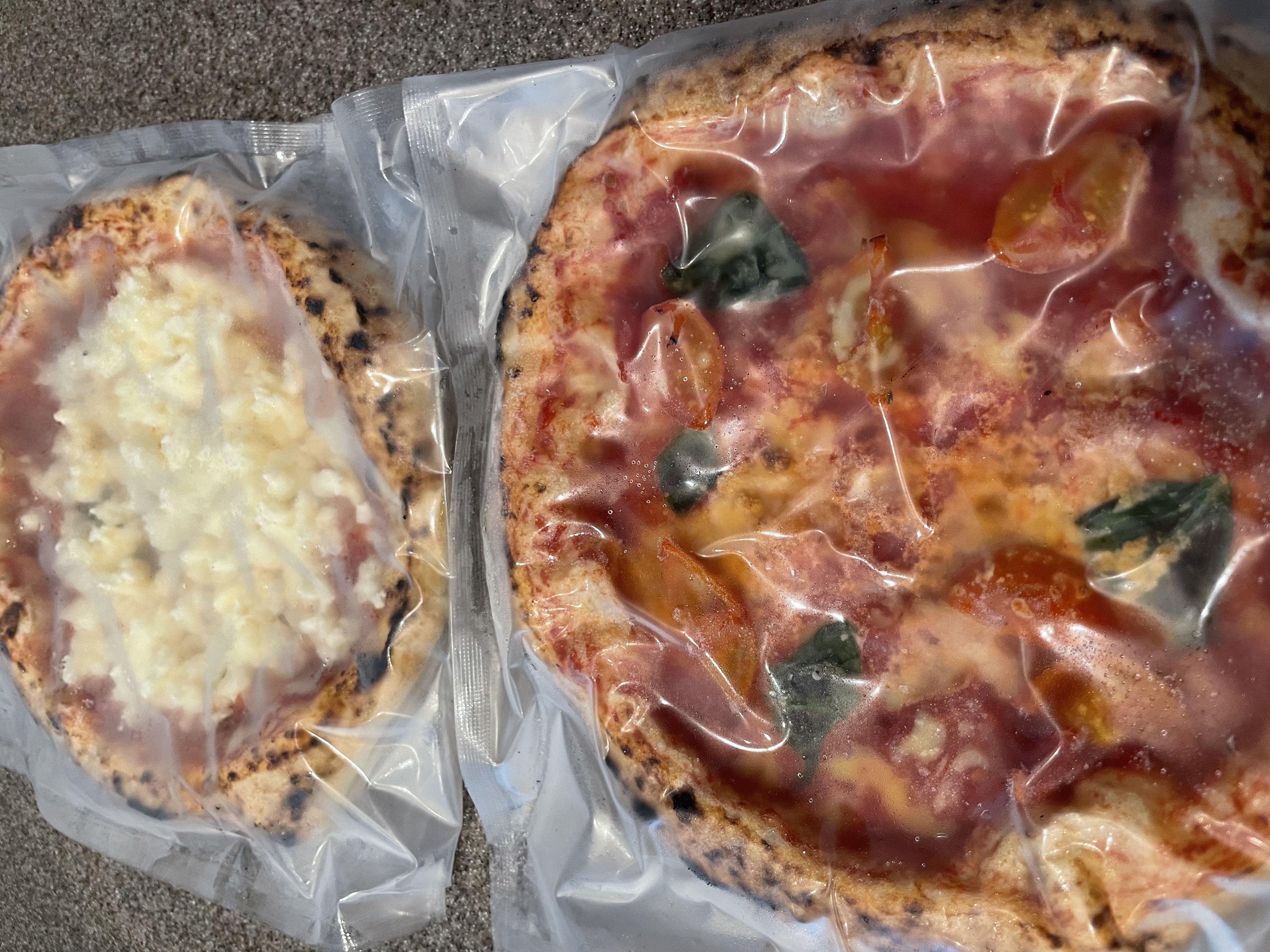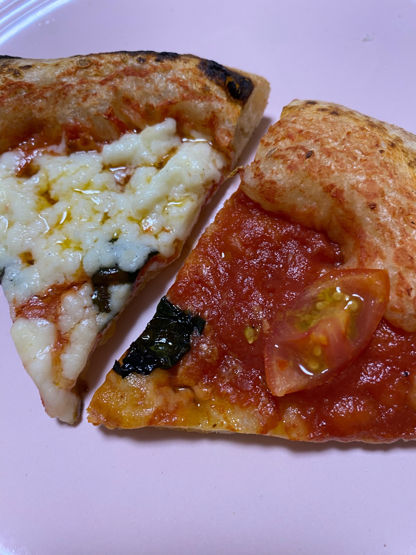 そしてどのビザにも合っている生地のクオリティを実感!生地の美味しさは、素材+手ごね+長時間発酵によるものだけど、この生地はいいですね。美味しくてお気に入りです。簡単なリベイクで、お店で提供されるような焼き立ての生地の感じが再現できたのもGOOD!